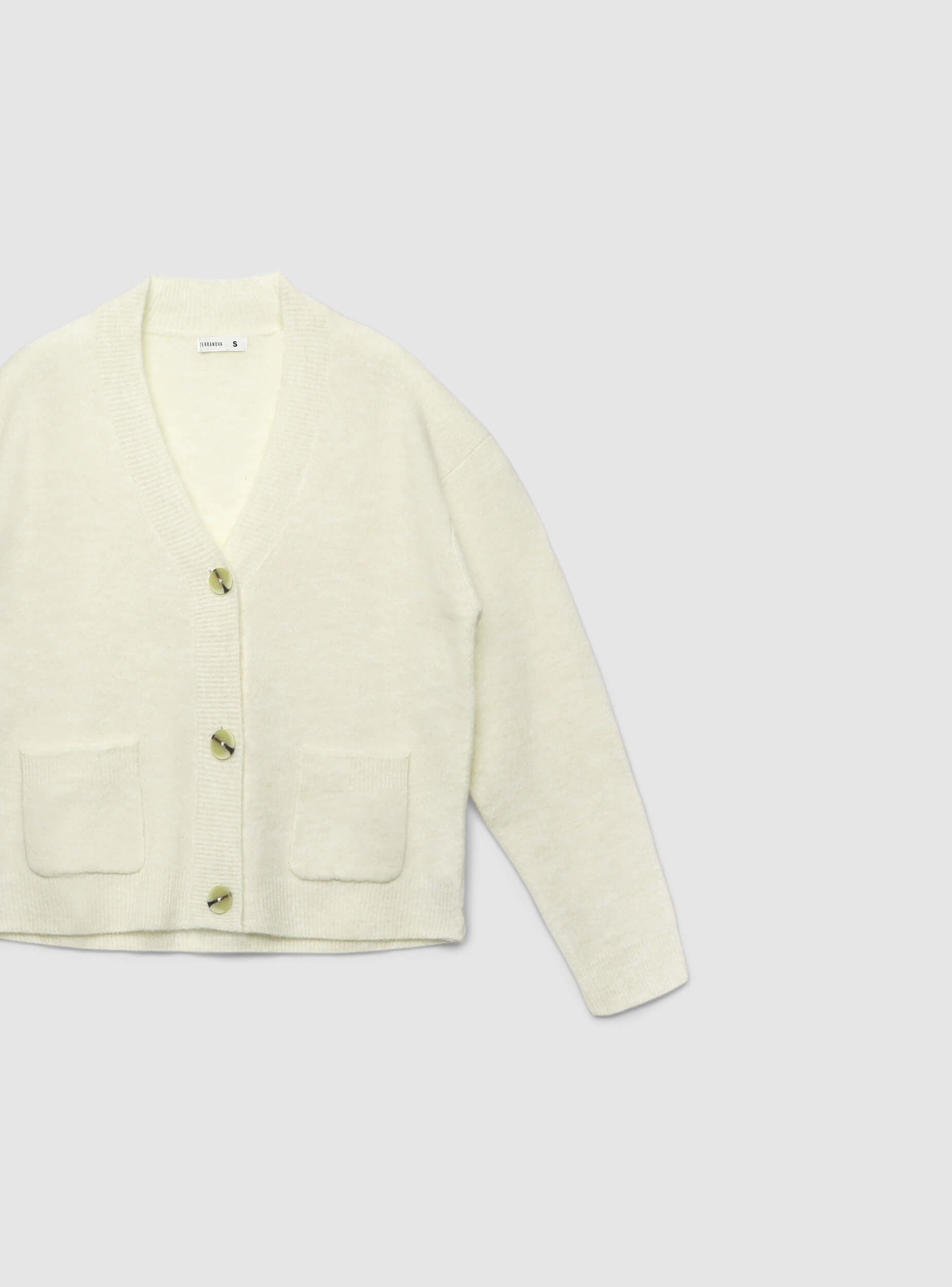 Ženski kardigan idealan za svestrane i opuštene izglede. Ima regularnu siluetu, V-izrez i duge rukave, savršen za nošenje preko topova ili košulja u hladnijim danima. Prednje zatvaranje na dugmiće i praktične aplikovane džepove, lako se kombinuje kako sa farmerkama, tako i sa elegantnim pantalonama za ležeran ili sofisticiraniji outfit.Detalji