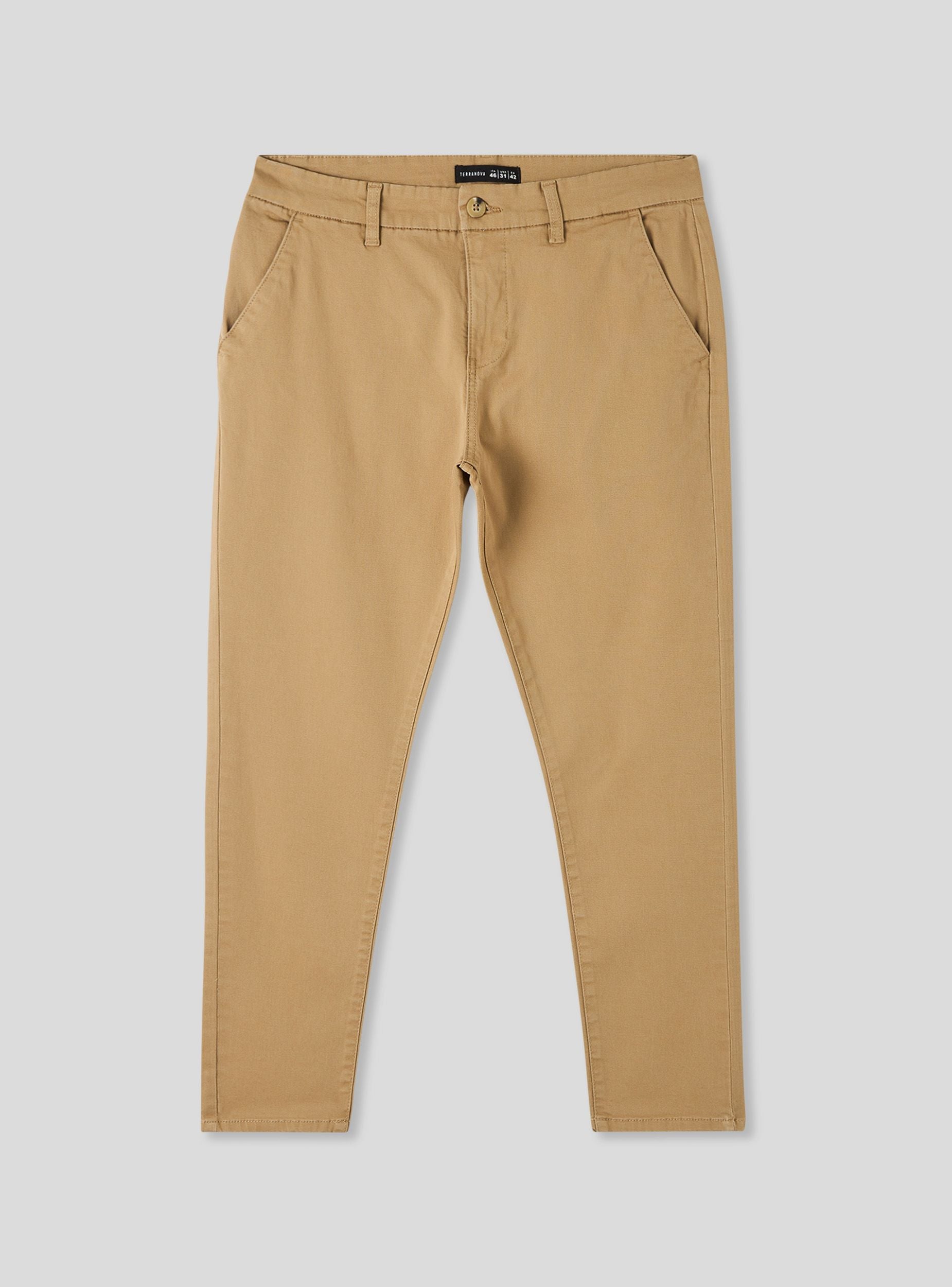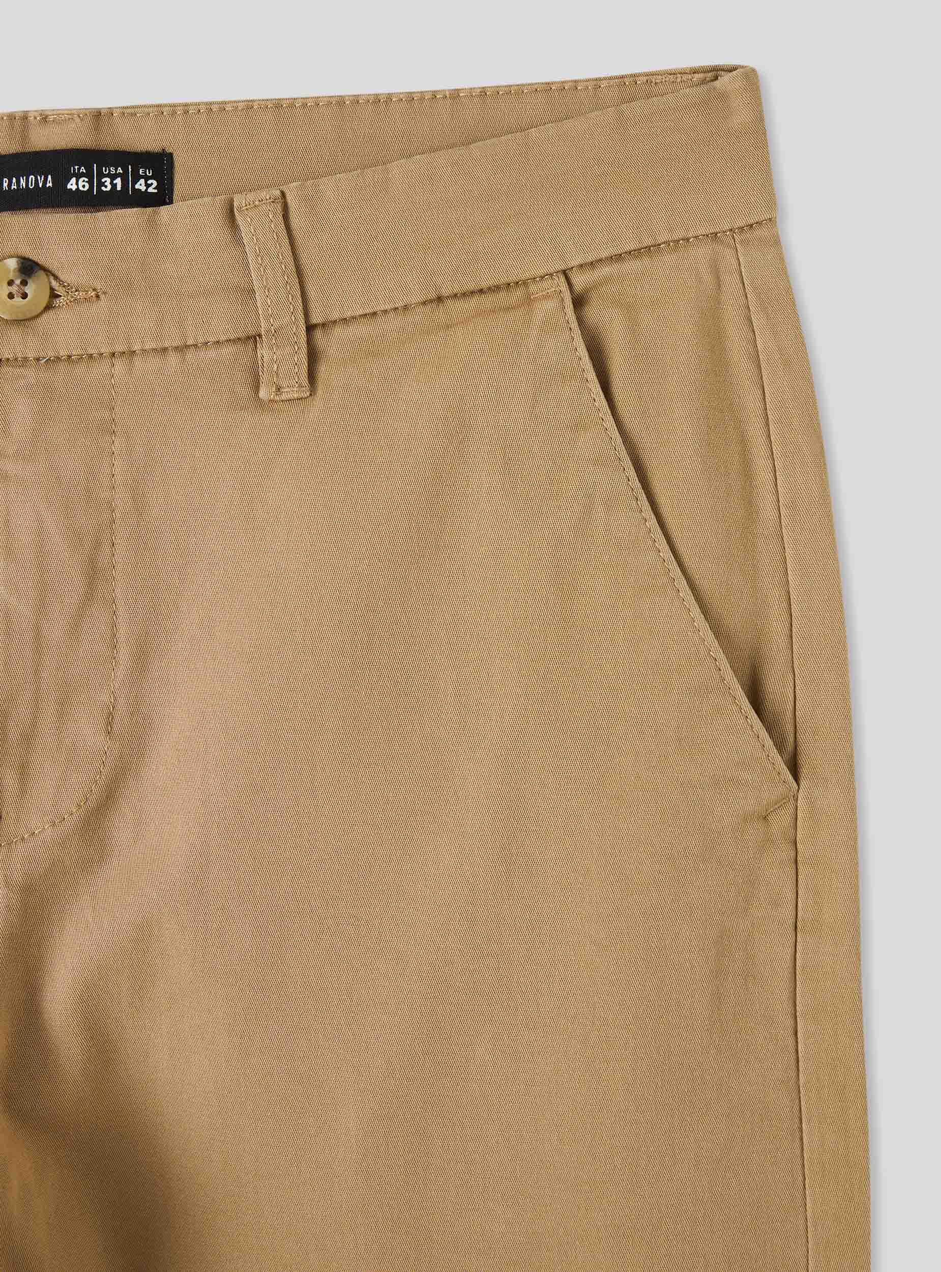 Ovi elegantni muški chino pantaloni, napravljeni od rastezljivog pamuka, nude slim fit kroj za moderan i stilizovan izgled. Tkanina u jednobojnoj boji ih čini svestranim i pogodnim za svaku garderobu. Opremljeni su dugmetom i rajsferšlusom, imaju prednje kose džepove i zadnje džepove sa preklopom. Savršeni za ležerne prilike, kancelarijski izgled ili večernje izlaske.Detalji