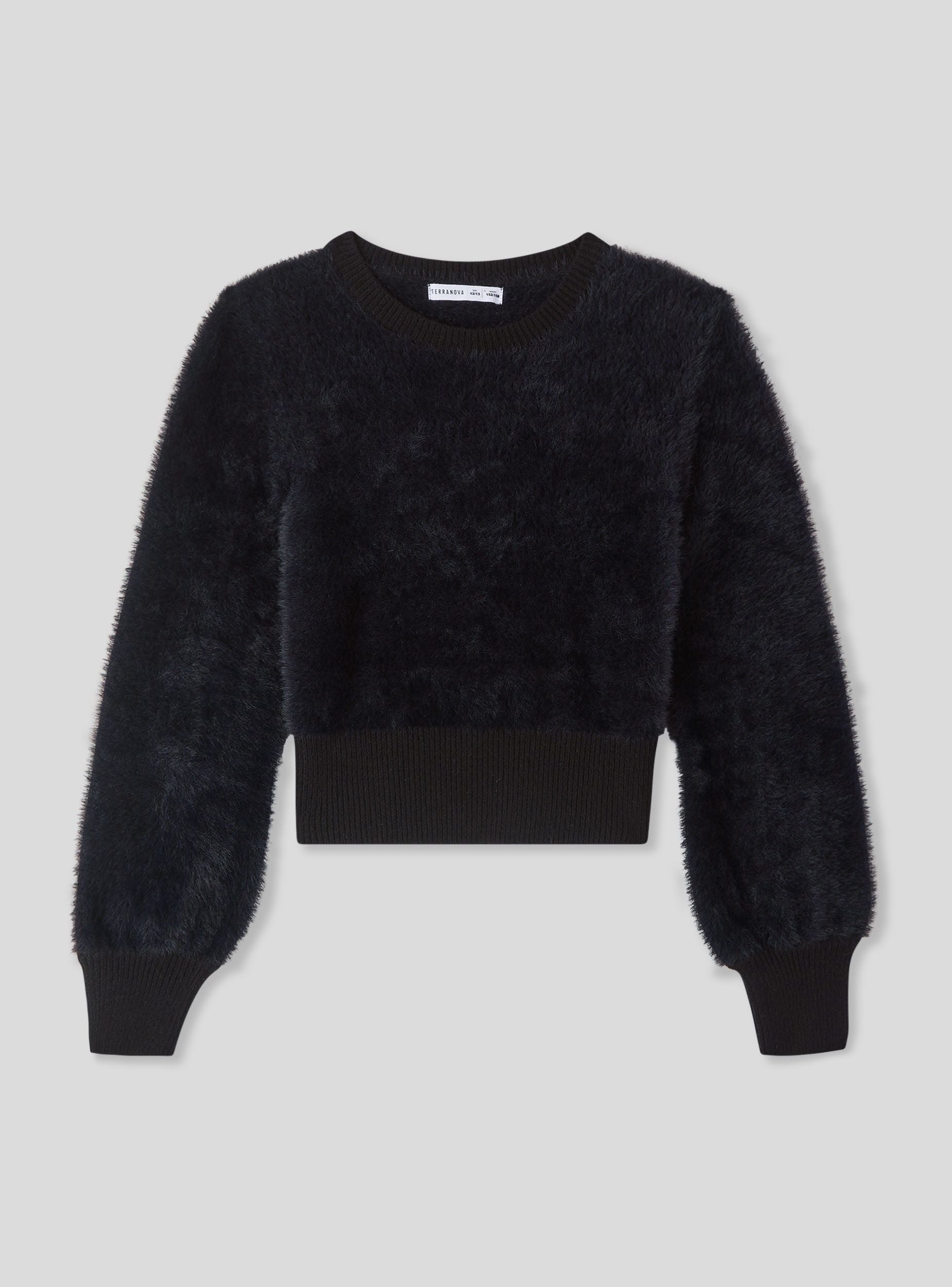 Devojčica crop majica jednobojna, idealna za svestrane i moderne kombinacije. Kratak dizajn ističe kombinacije sa pantalonama ili suknjama visokog struka, dok tkanina sa efektom krzna dodaje originalan dodir. Okrugli izrez i duge rukave sa rebrastim manžetnama obezbeđuju udobnost i praktičnost, savršena za školu ili slobodno vreme.