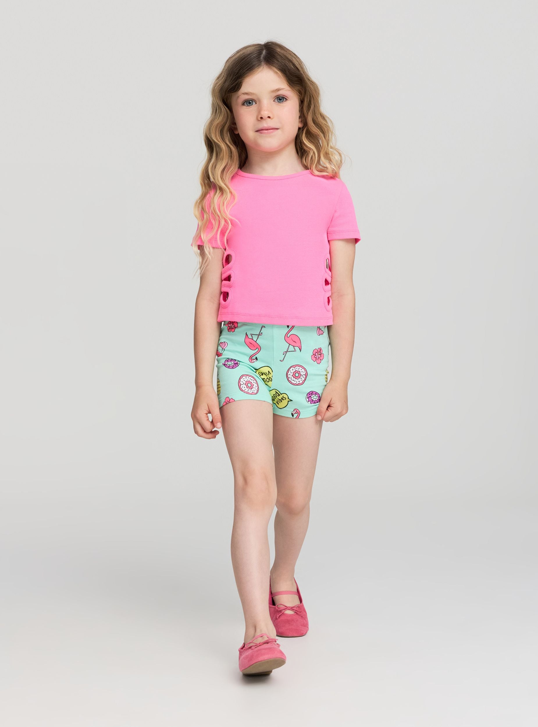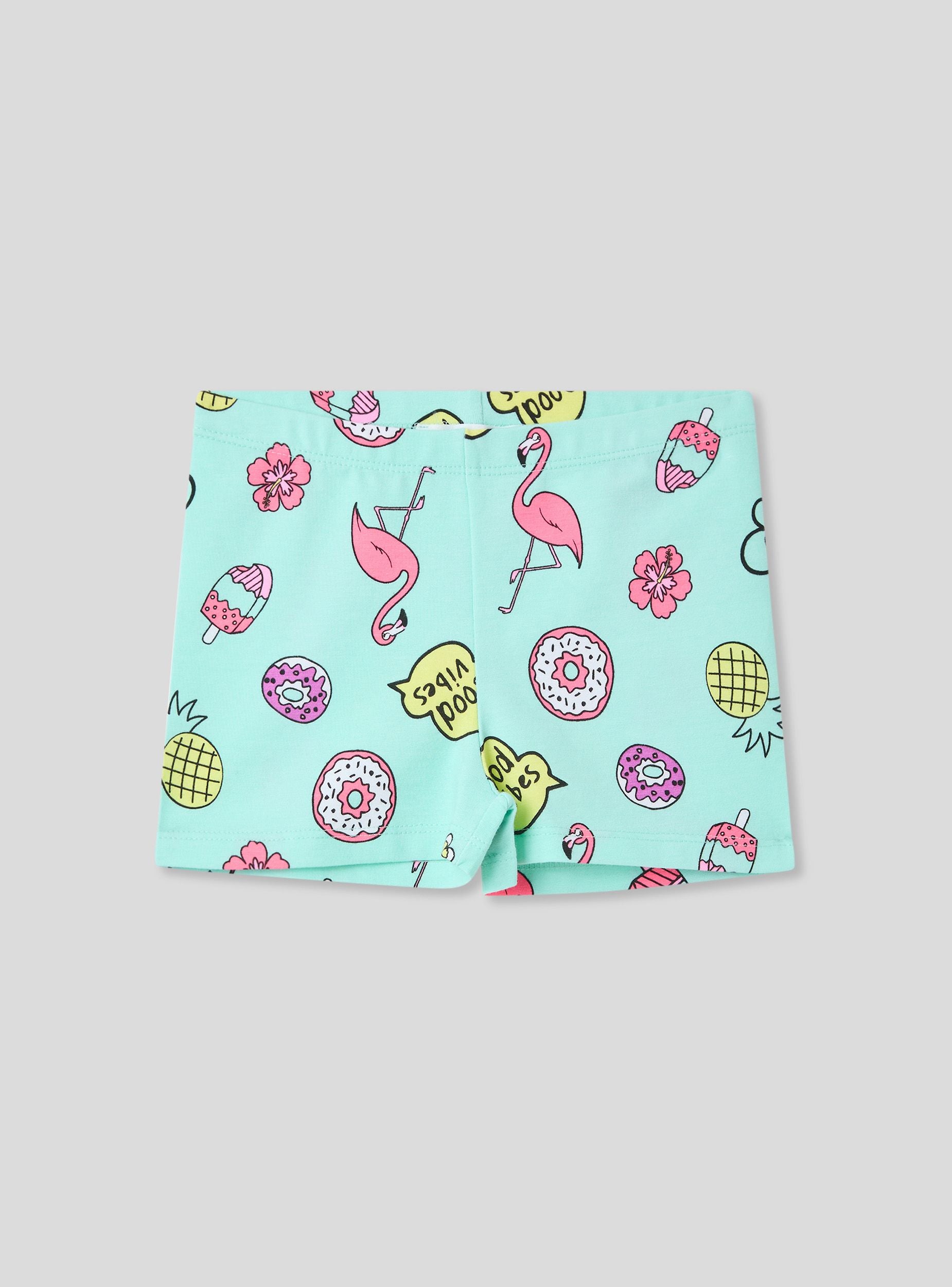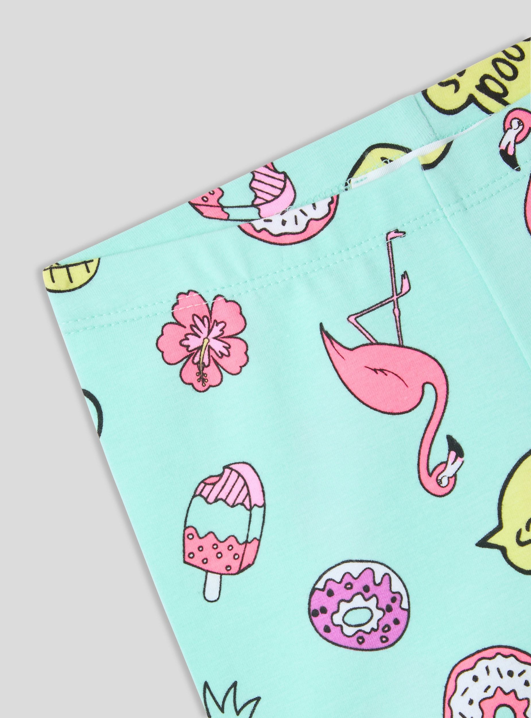 Leggins za devojčice sa živopisnim i veselim dizajnom, savršeni za dodavanje daška boje i mašte letnjim kombinacijama. Model sa širokim nogavicama obezbeđuje udobno i prilagodljivo nošenje, zahvaljujući elastičnom materijalu koji se prilagođava pokretima. Ukrašeni višebojnim printovima flamingosa, sladoleda, krofni, ananasa, natpisima i cvećem, idealni su za razigran i bezbrižan izgled. Savršeni za kombinovanje sa majicama i patikama za slobodno vreme.