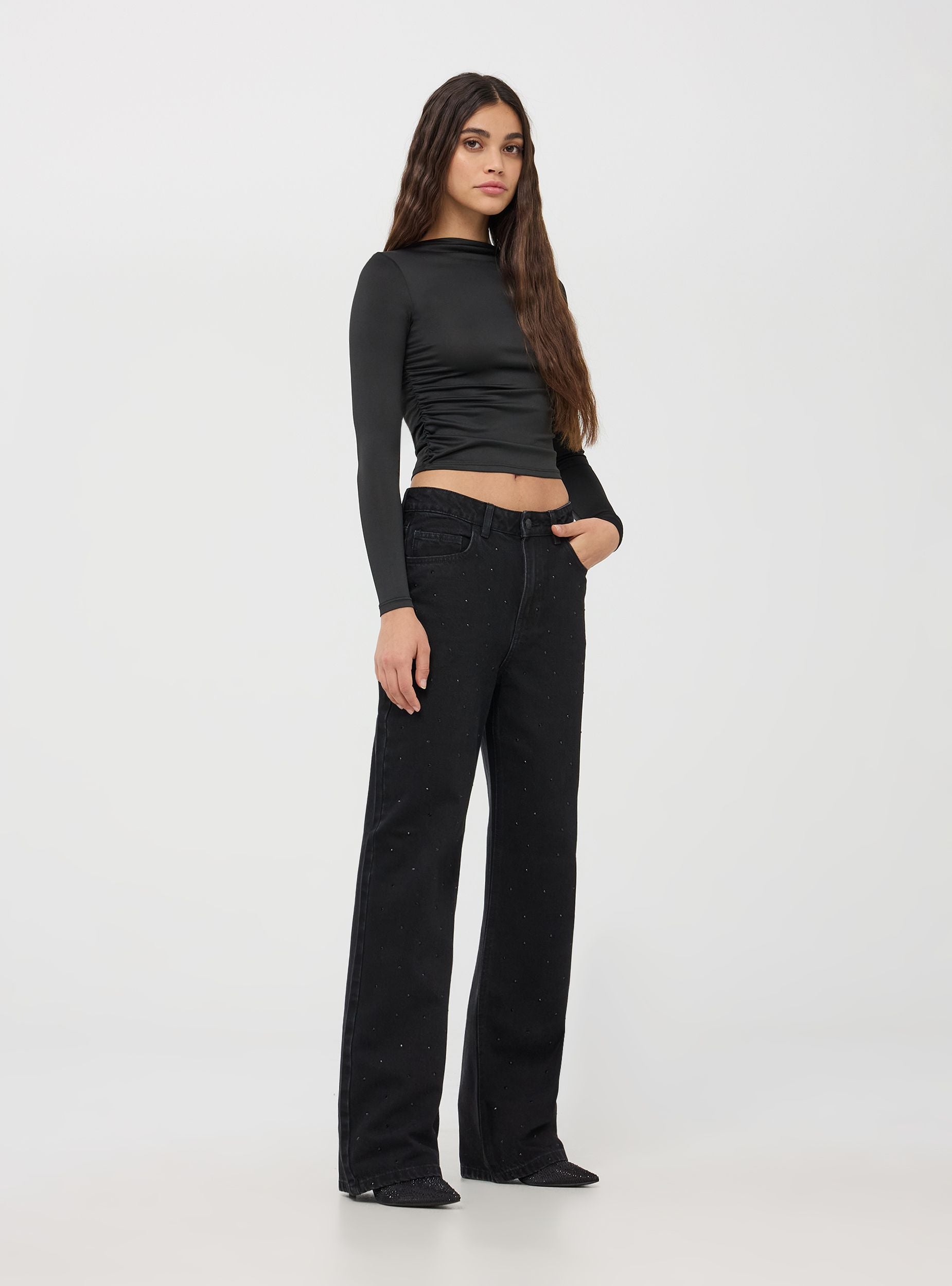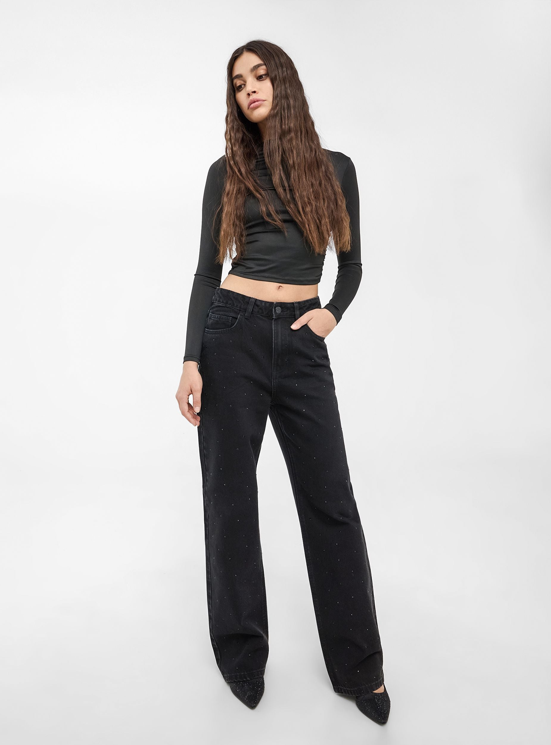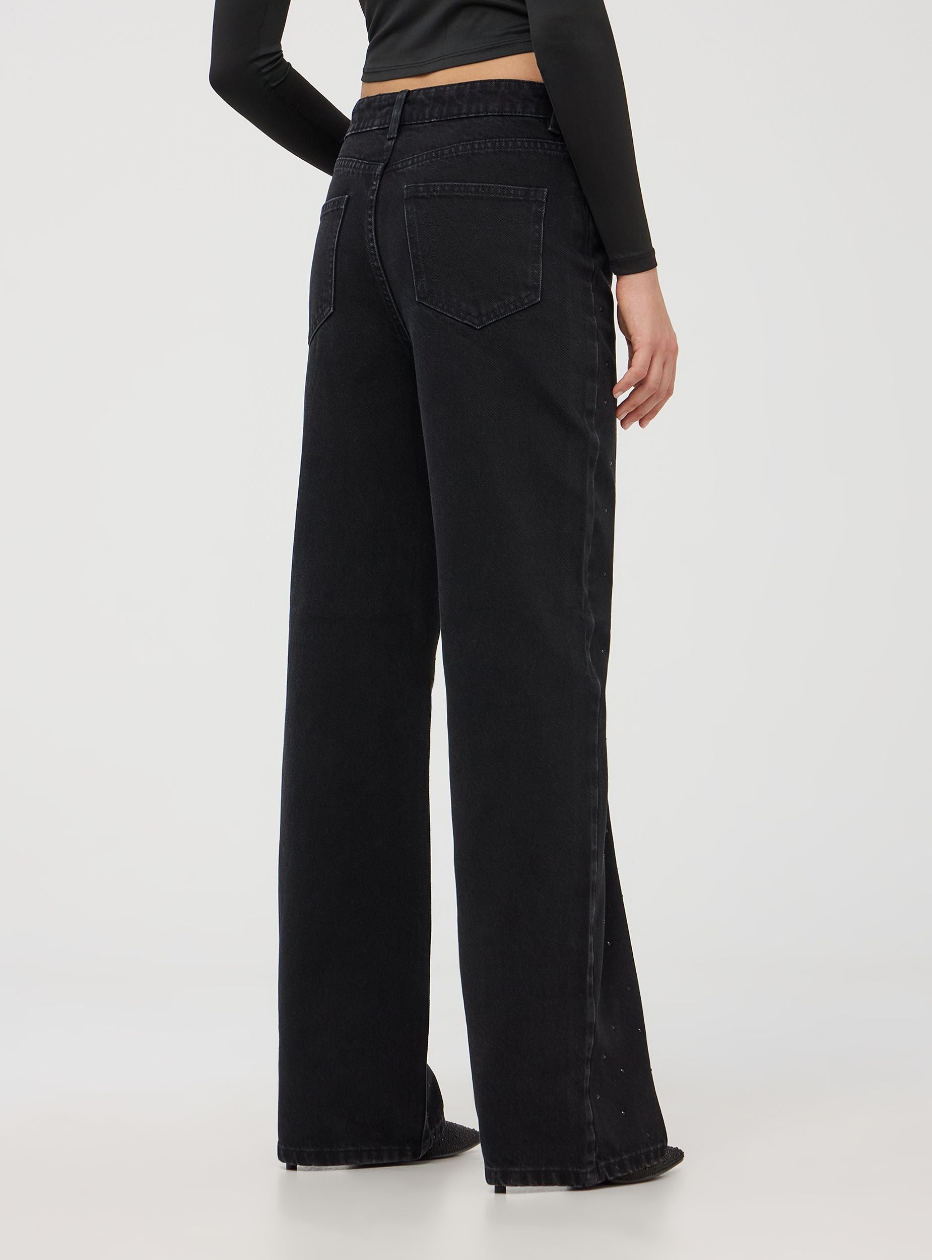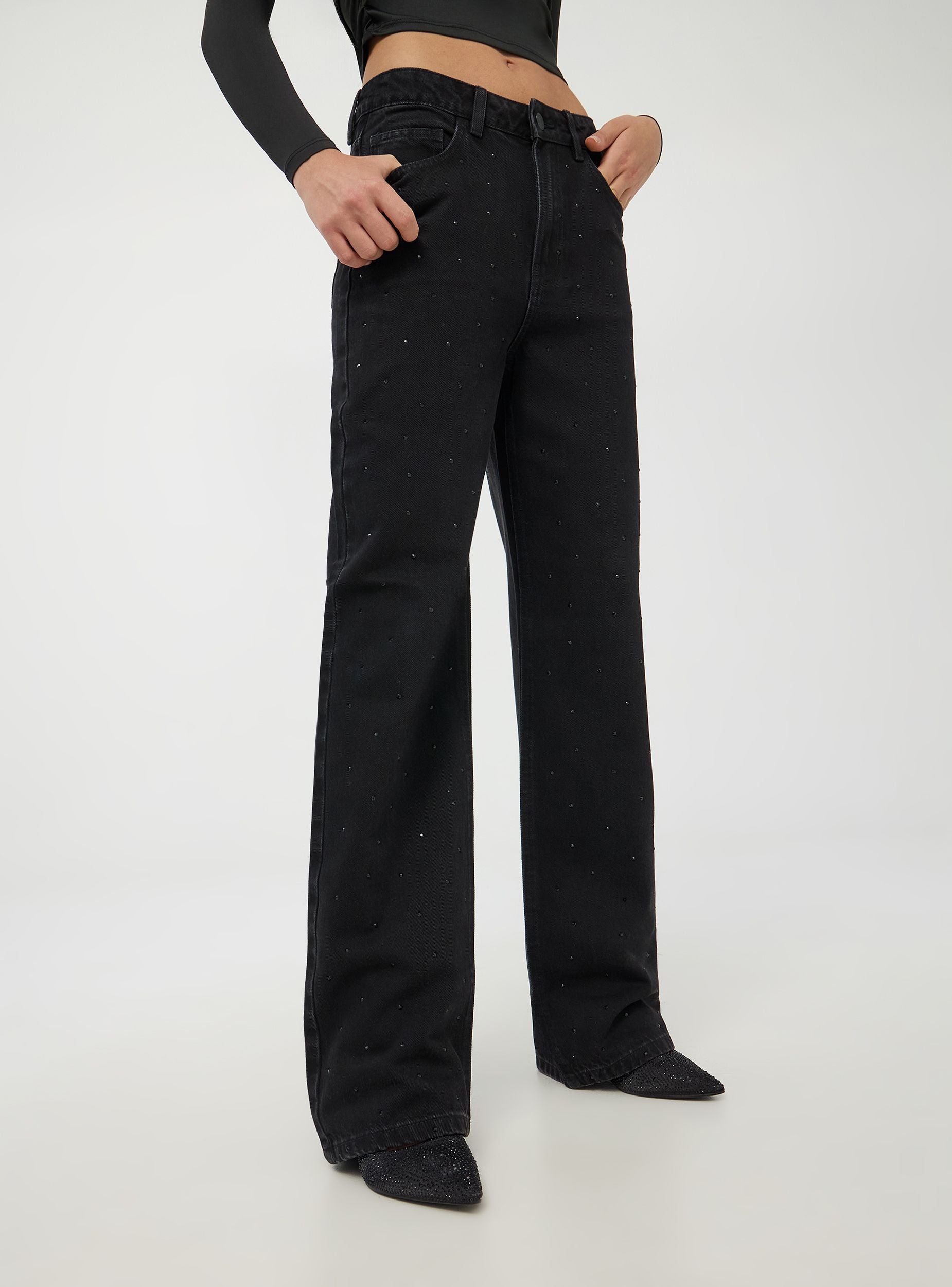 Ženski široki farovi karakterišu se širokom nogavicom koja daje moderan i udoban izgled. Izrađeni su od tamno crnog denima, imaju dekoraciju od kristala na prednjoj strani, dodajući dašak sjaja i stila. Imaju zatvaranje na rajsferšlus i dugme i opremljeni su sa pet funkcionalnih džepova. Ovi farovi kombinuju praktičnost i eleganciju. Savršeni za casual chic outfite, mogu se kombinovati sa jednostavnim majicama kako bi se istakli sjajni detalji.Detalji