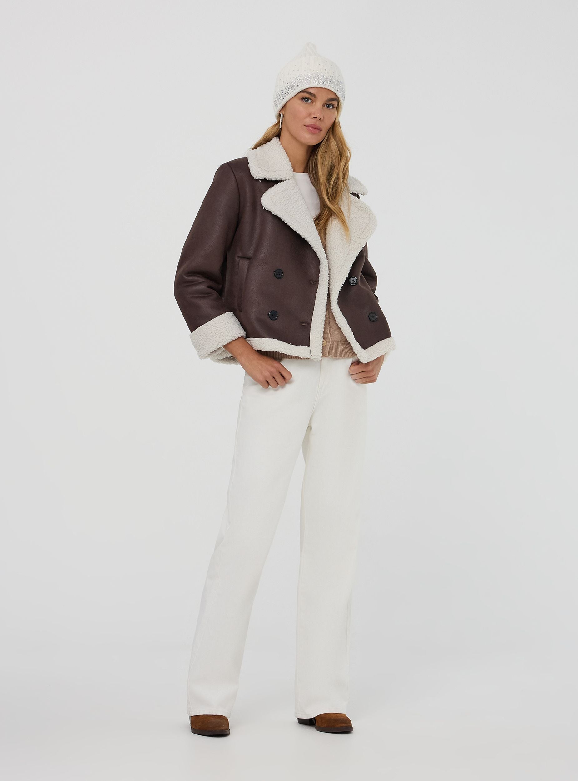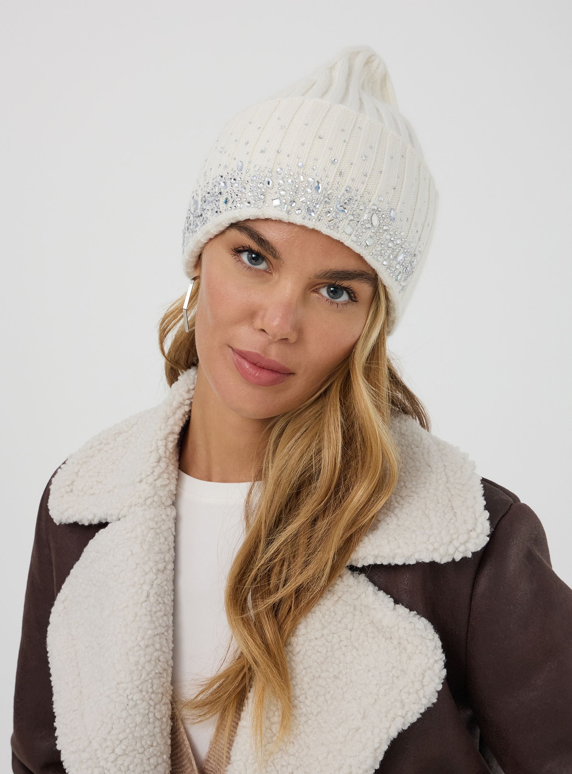 Ženski jednobojni šešir sa strasima. Osnovni i stilizovani komad za zimu koji garantuje toplinu i udobnost. Jednostavan i svestran dizajn beanie-a čini ga savršenim za upotpunjavanje bilo kojeg outfita. Preokrenuti rub sa strasima dodaje dašak stila, držeći uši dobro pokrivene tokom hladnijih dana.Detalji