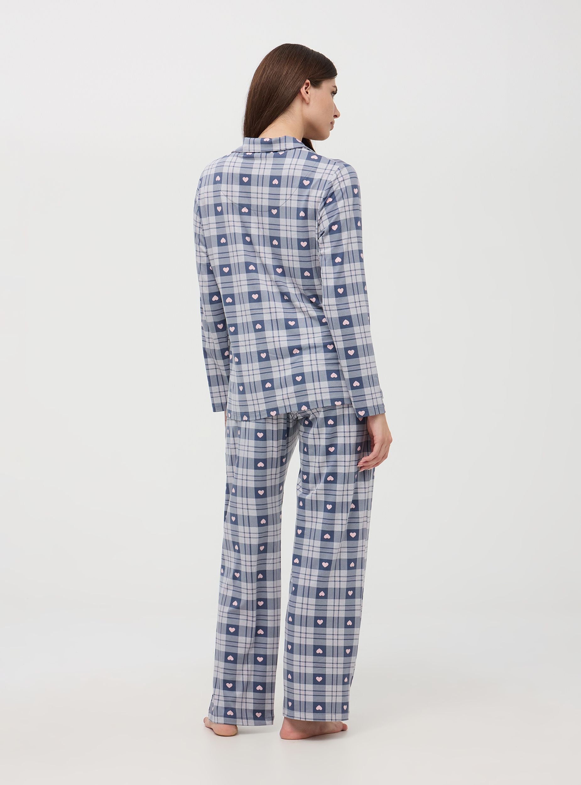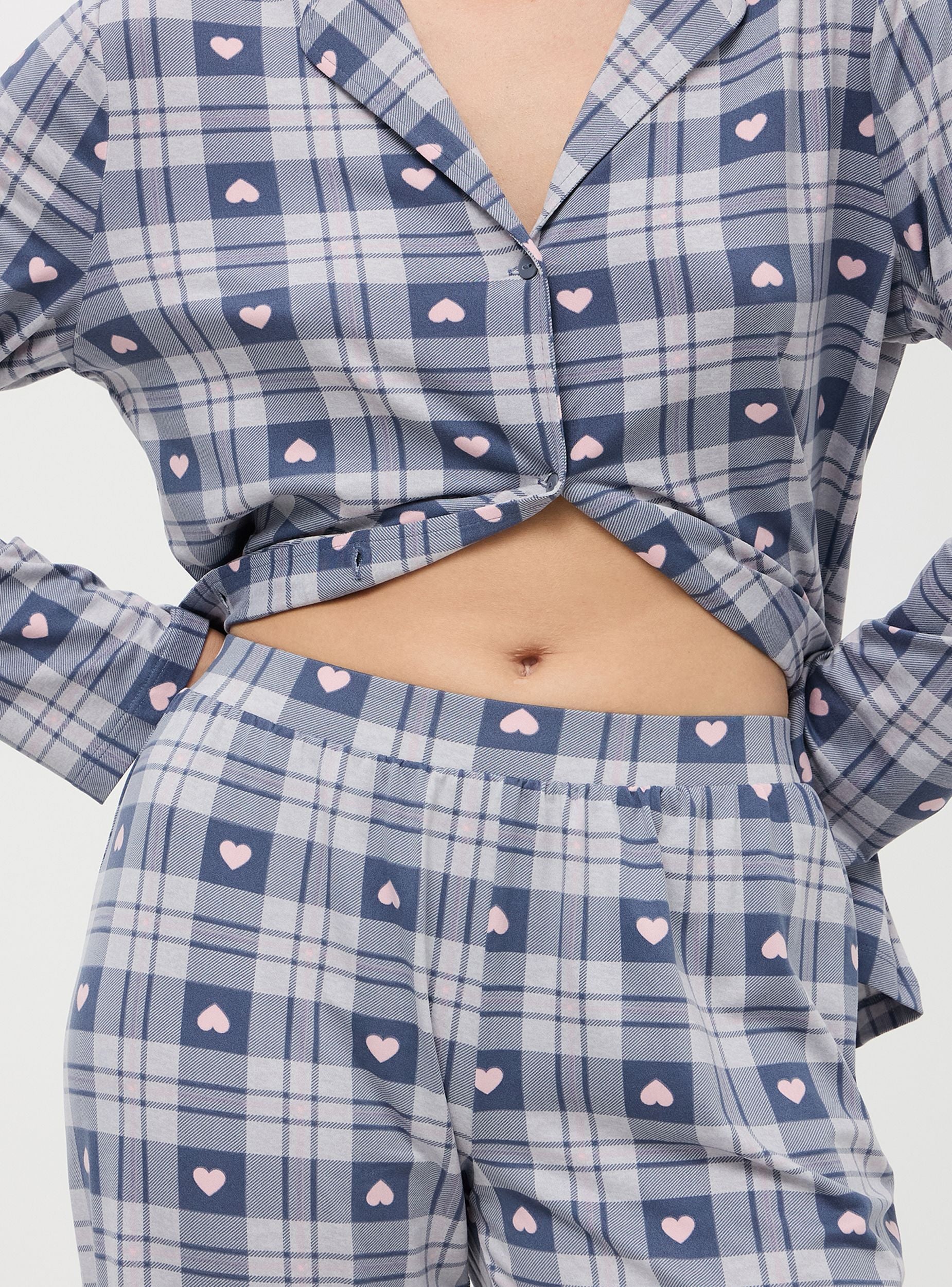 Ženski pidžama, udoban i mekan. Set uključuje košulju i odgovarajuće pantalone, oba sa kariranim uzorkom sa srcima. Košulja ima dugmad, dok pantaloni imaju elastičan pojas za udobno nošenje. Casual dizajn idealan za trenutke opuštanja kod kuće.Detalji