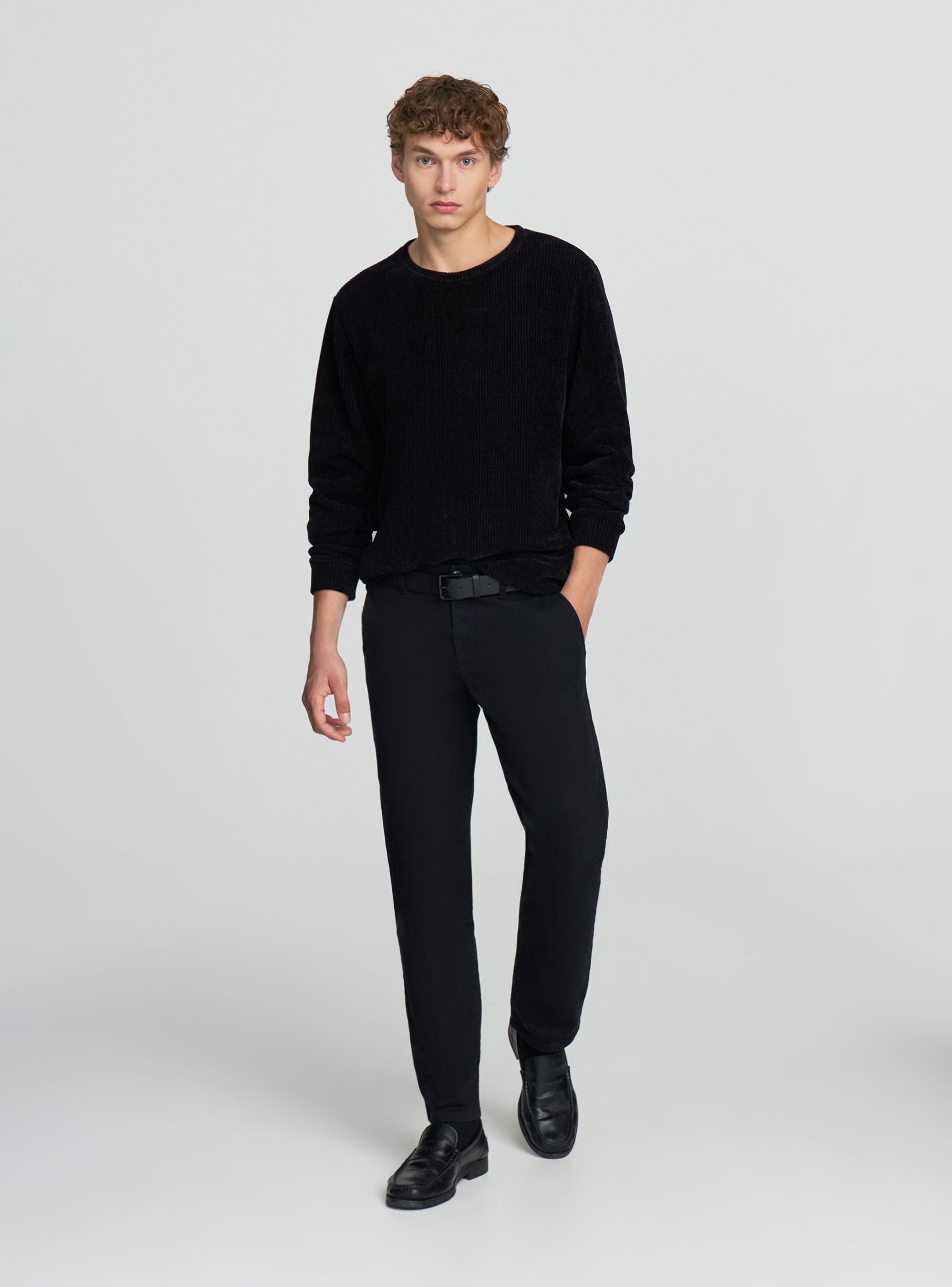 Muška majica sa dugim rukavima i jednobojnim dizajnom. Ima okrugli izrez i rebraste manžete, pružajući jednostavan i svestran izgled. Idealna za ležerne kombinacije, lako se slaže sa farmerkama ili pantalonama za svakodnevni izgled. Savršena za jesenju ili zimsku sezonu, garantuje udobnost i stil u svakoj prilici.