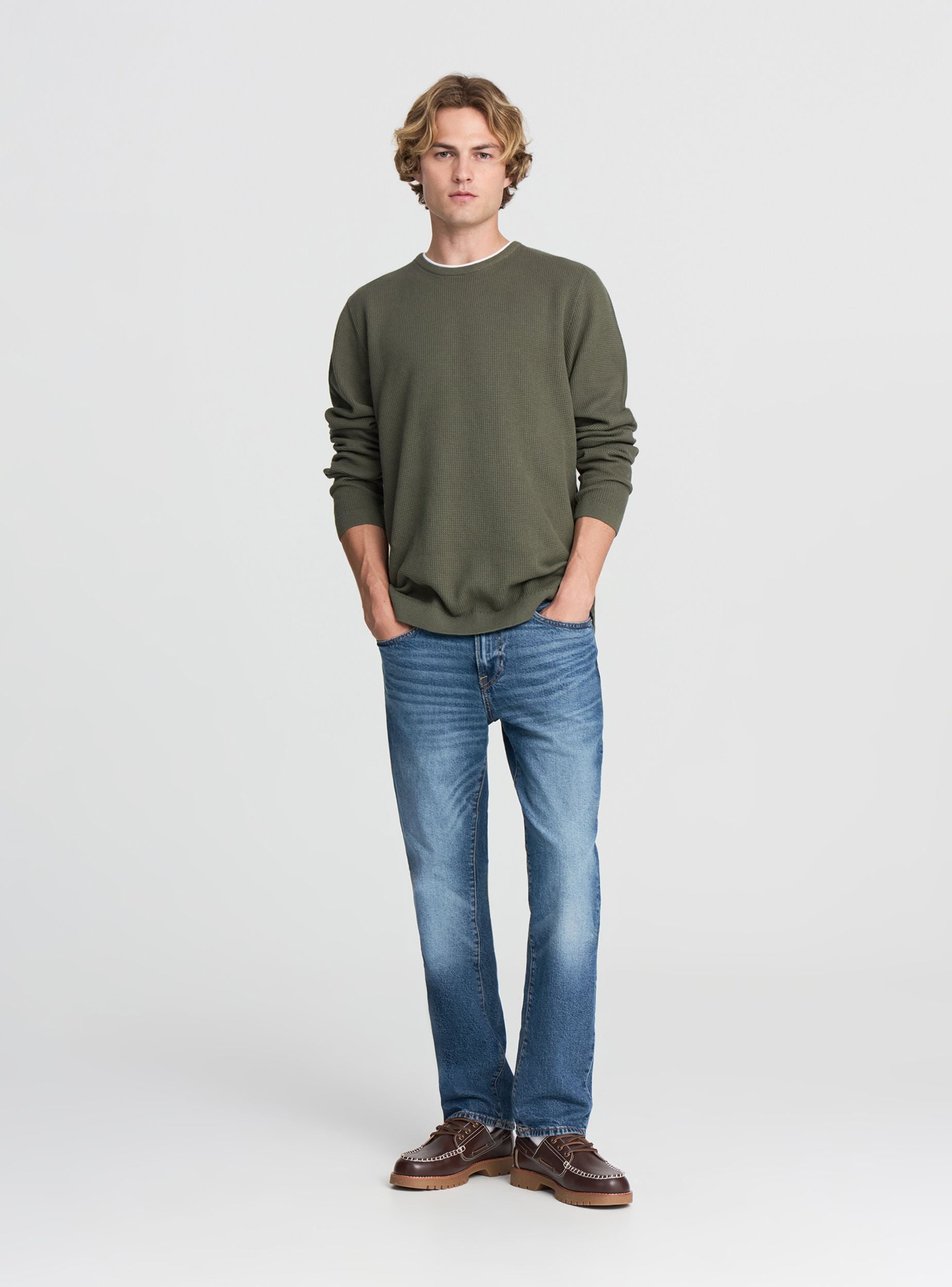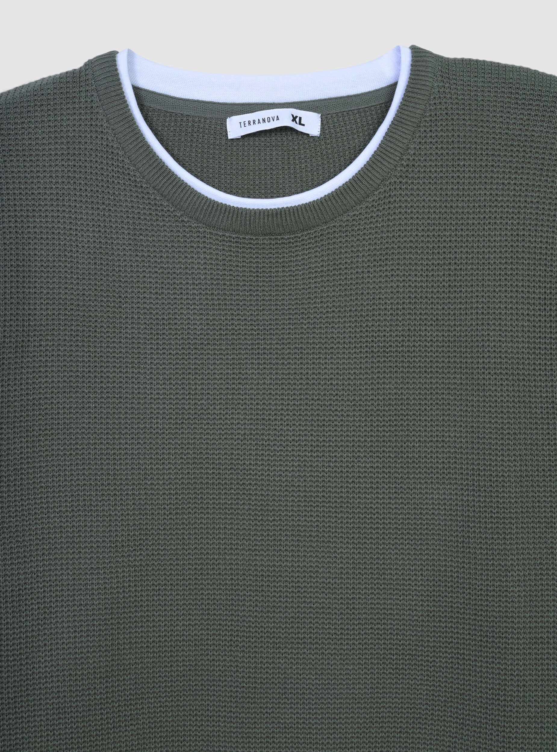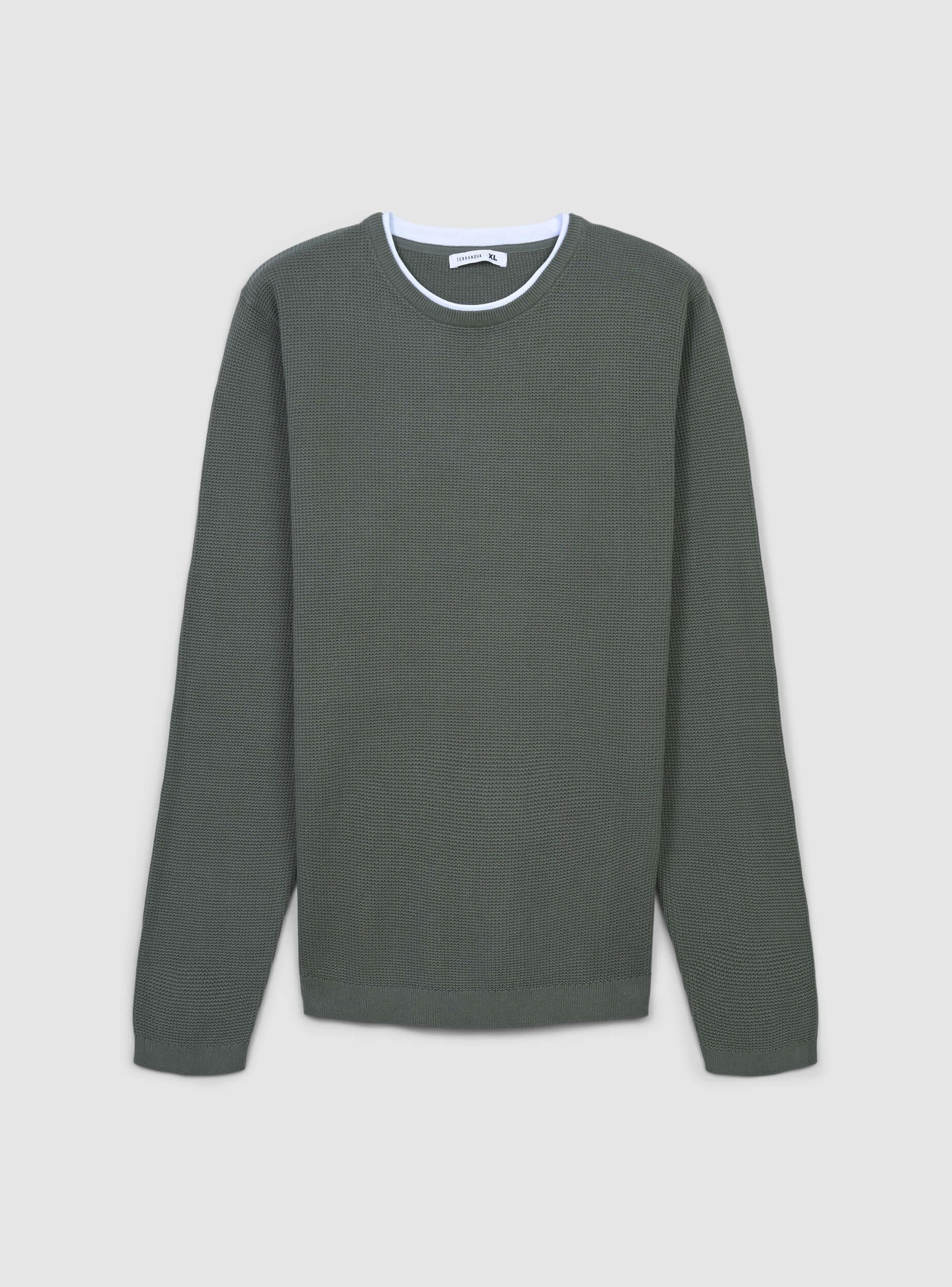 Muška majica idealna za ležeran i svestran izgled, savršena za nošenje kako u kancelariji, tako i u slobodno vreme. Jednobojni dizajn i tekstura sa tačkama daju moderan dodir, dok okrugli izrez i dugi rukavi obezbeđuju udobnost i praktičnost. Okrugli izrez u kontrastnoj boji stvara efekat duplog sloja koji dodaje stil izgledu. Lako se kombinuje sa farmerkama ili chino pantalonama, prilagođava se različitim prilikama i sezonama.