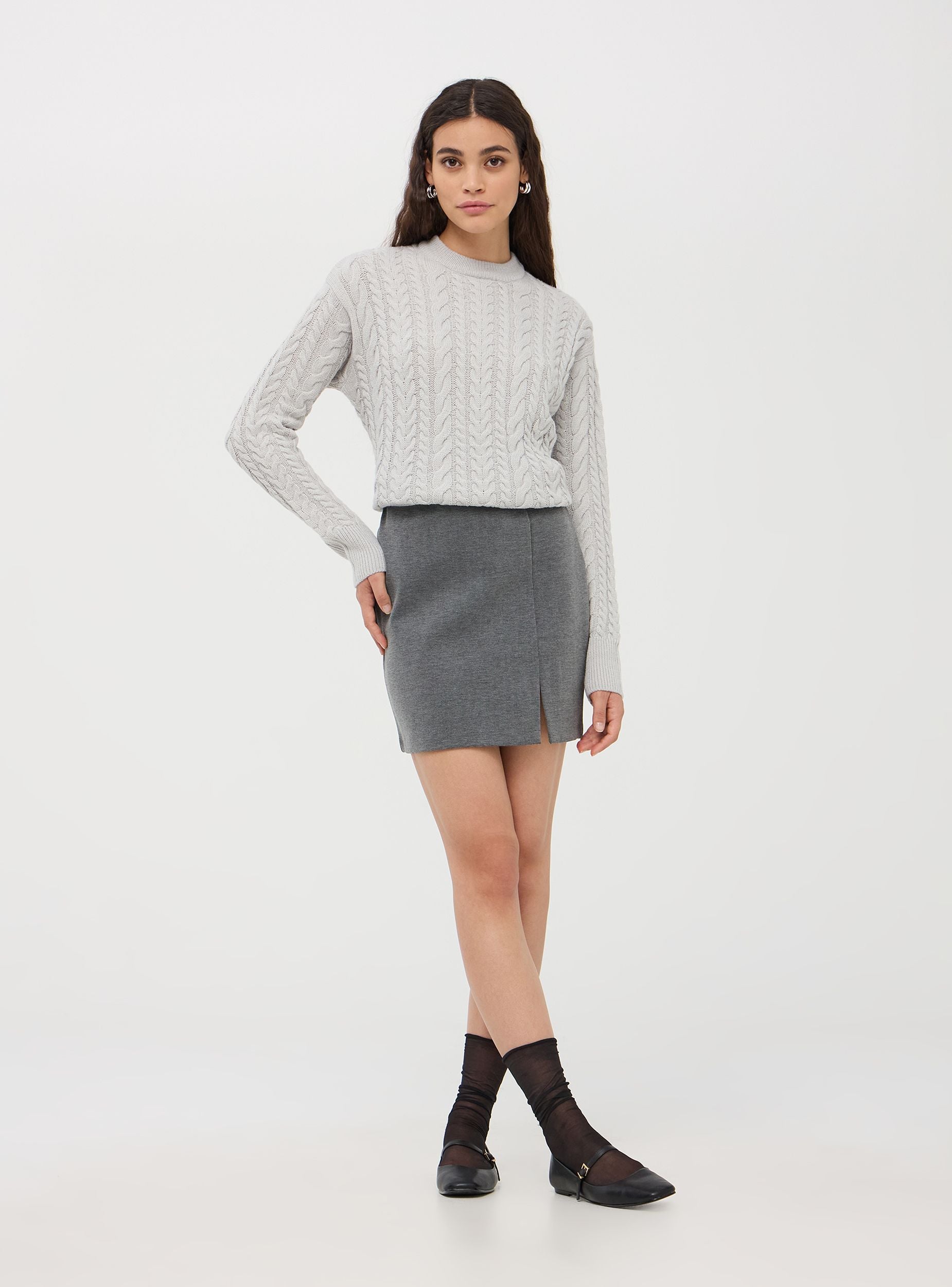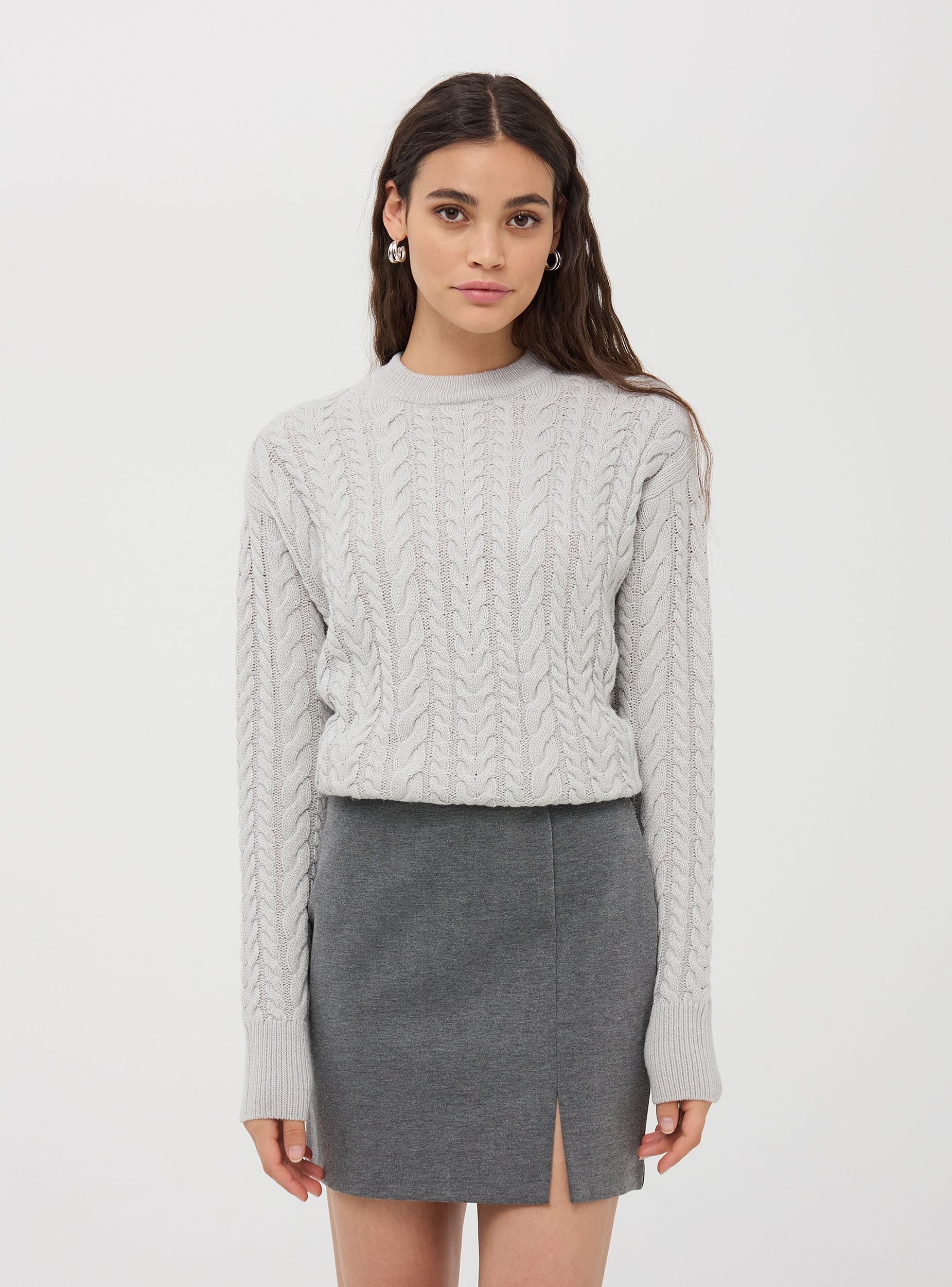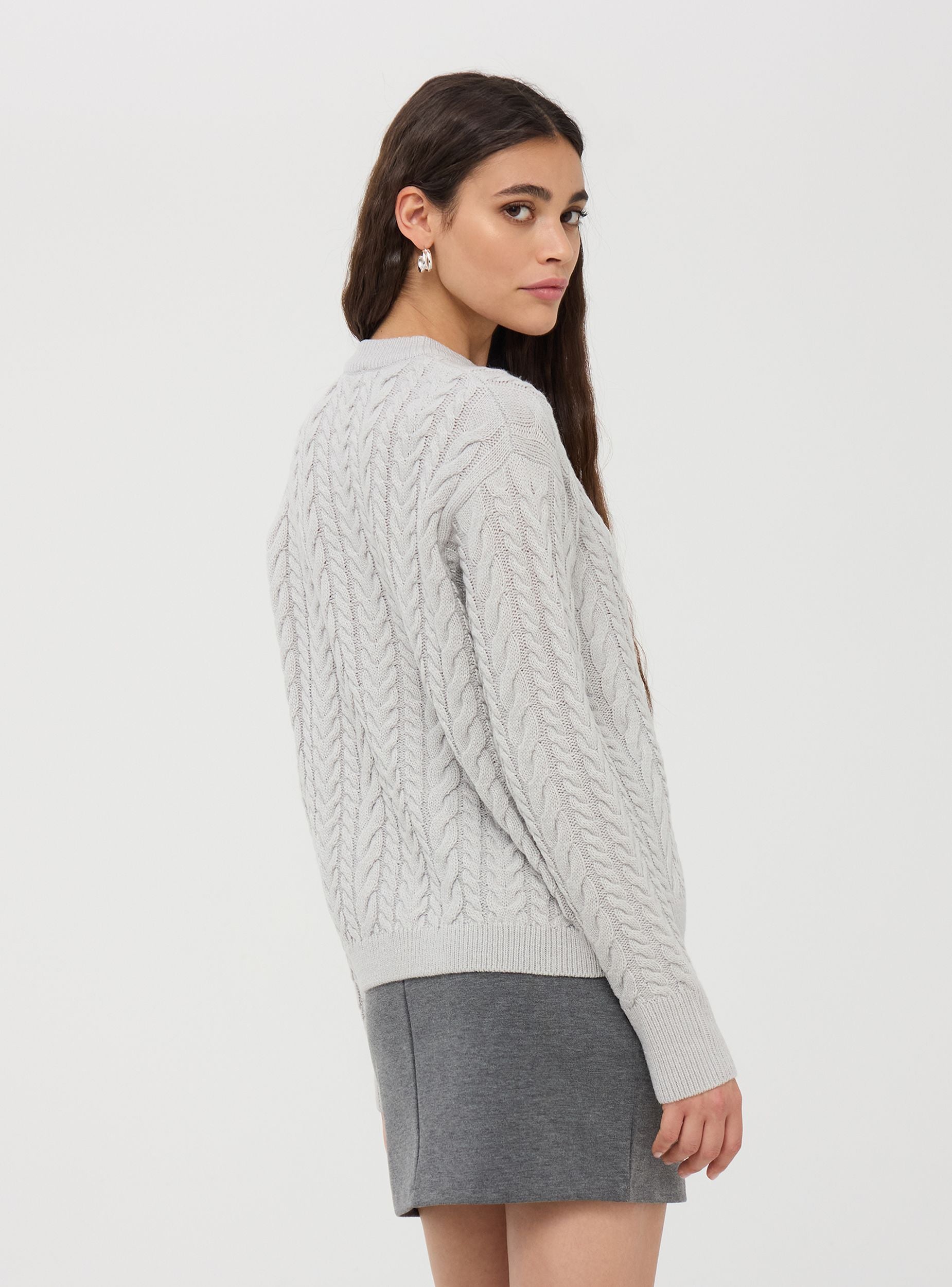 Ženska majica dugih rukava napravljena od mekog jednobojnog materijala. Model ima elegantan pleteni uzorak, rebraste završetke i okrugli izrez, što dodaje dašak stila ovom komadu. Savršena za opuštene i svakodnevne prilike, ova majica se može nositi uz farmerke, pantalone ili suknje za jednostavan, ali elegantan izgled. Idealna za kancelariju, izlazak s prijateljima ili za dan opuštanja kod kuće. Svestran i moderan komad koji spaja stil i praktičnost. Regularna kroja.Detalji