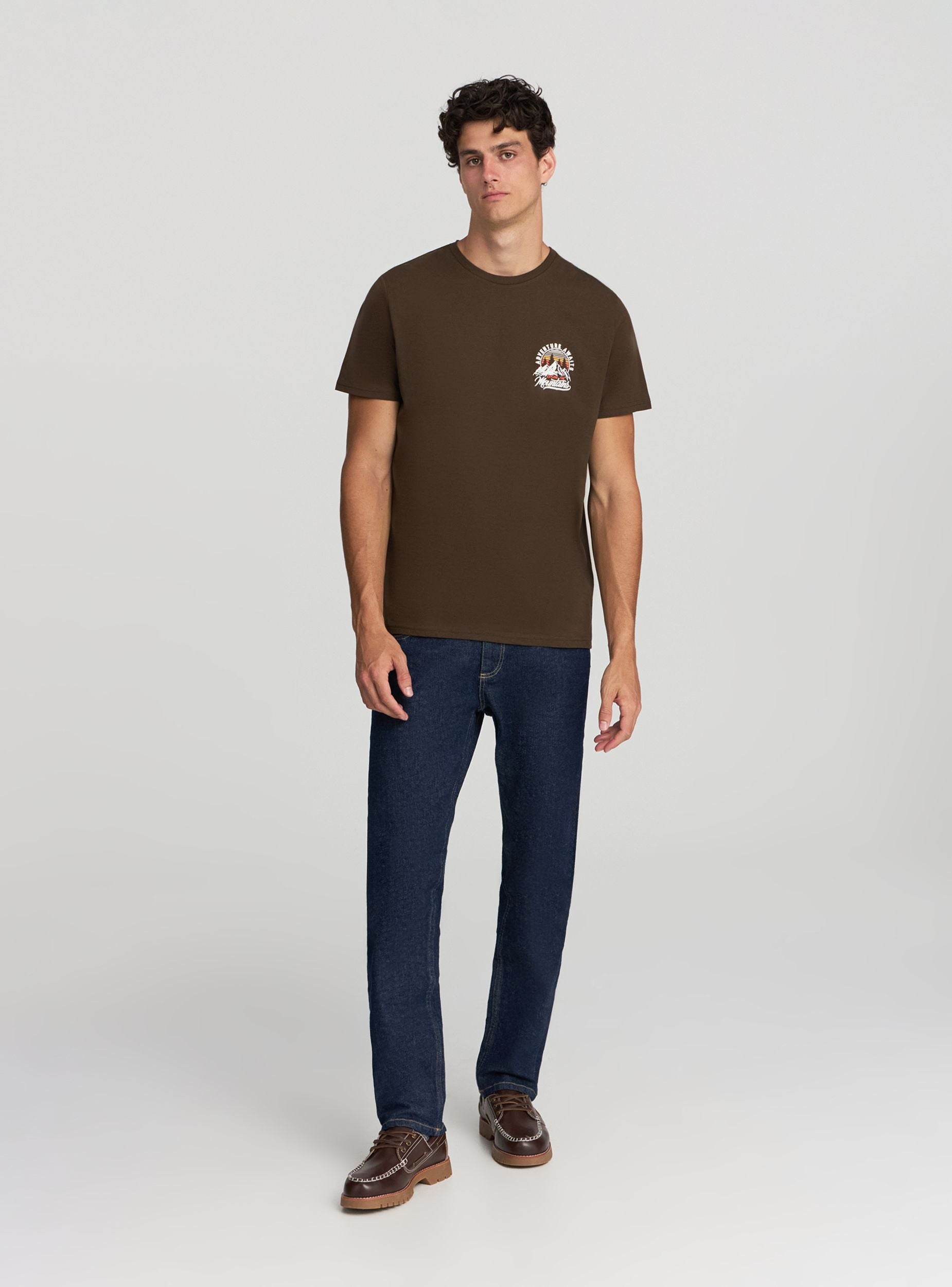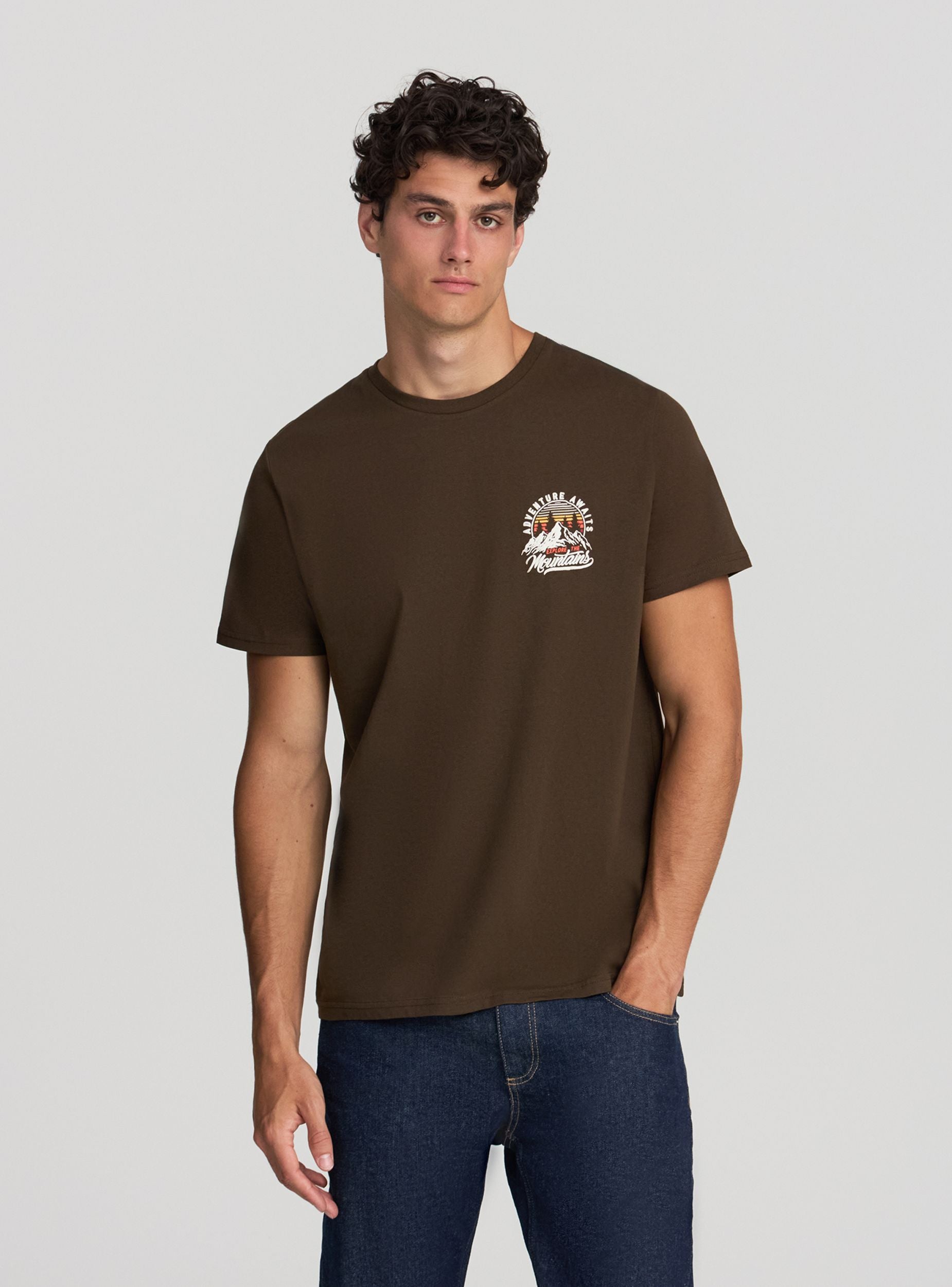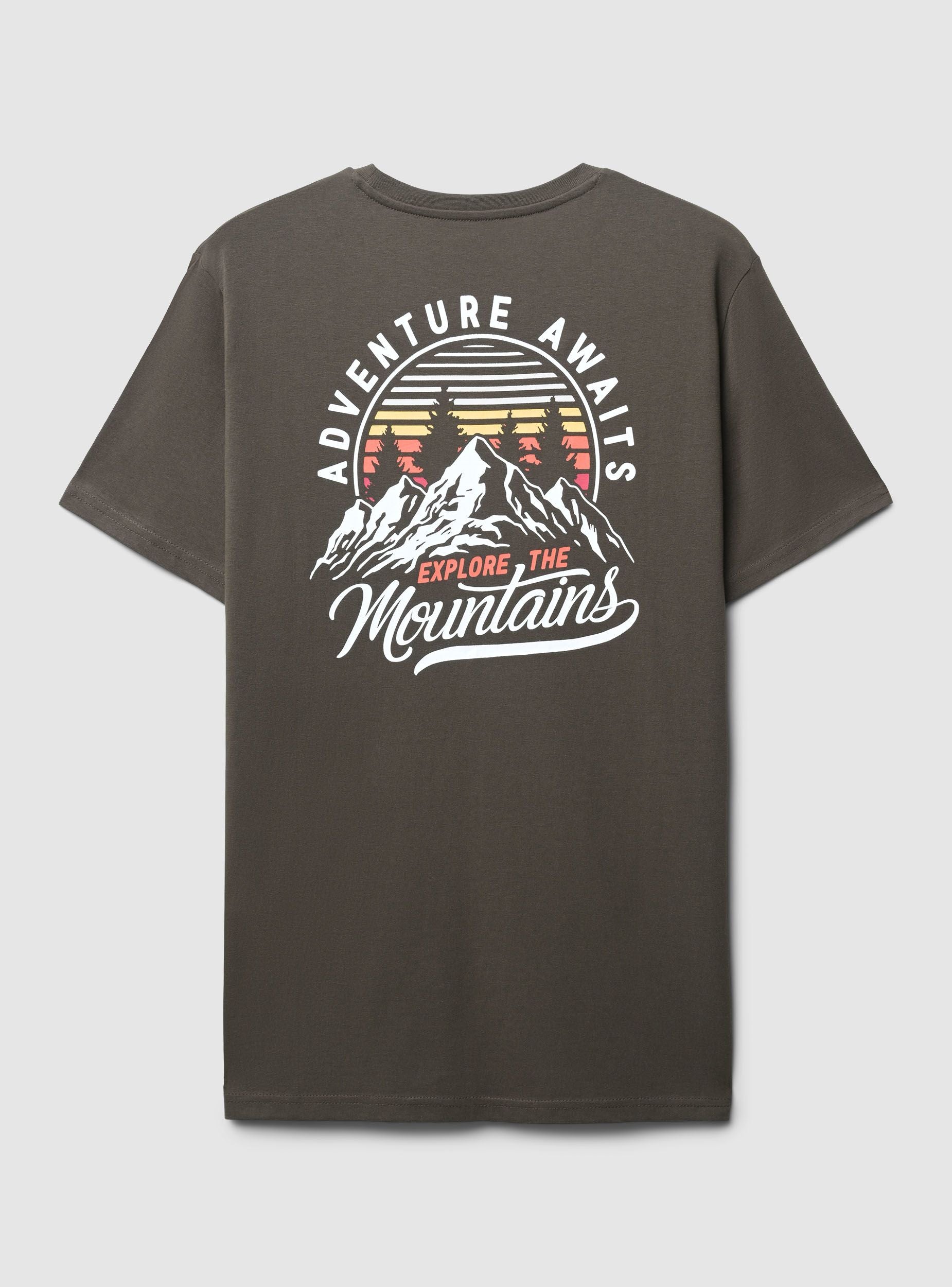 Muška majica sa grafičkim printom planine. Idealna za ležeran i opušten izgled, ova majica ima print koji priziva avanturu i prirodu, sa detaljima koji podsećaju na planinske pejzaže. Savršena za kombinovanje sa džinsom ili sportskim pantalonama, pruža udobno pristajanje i svestran stil za slobodno vreme.