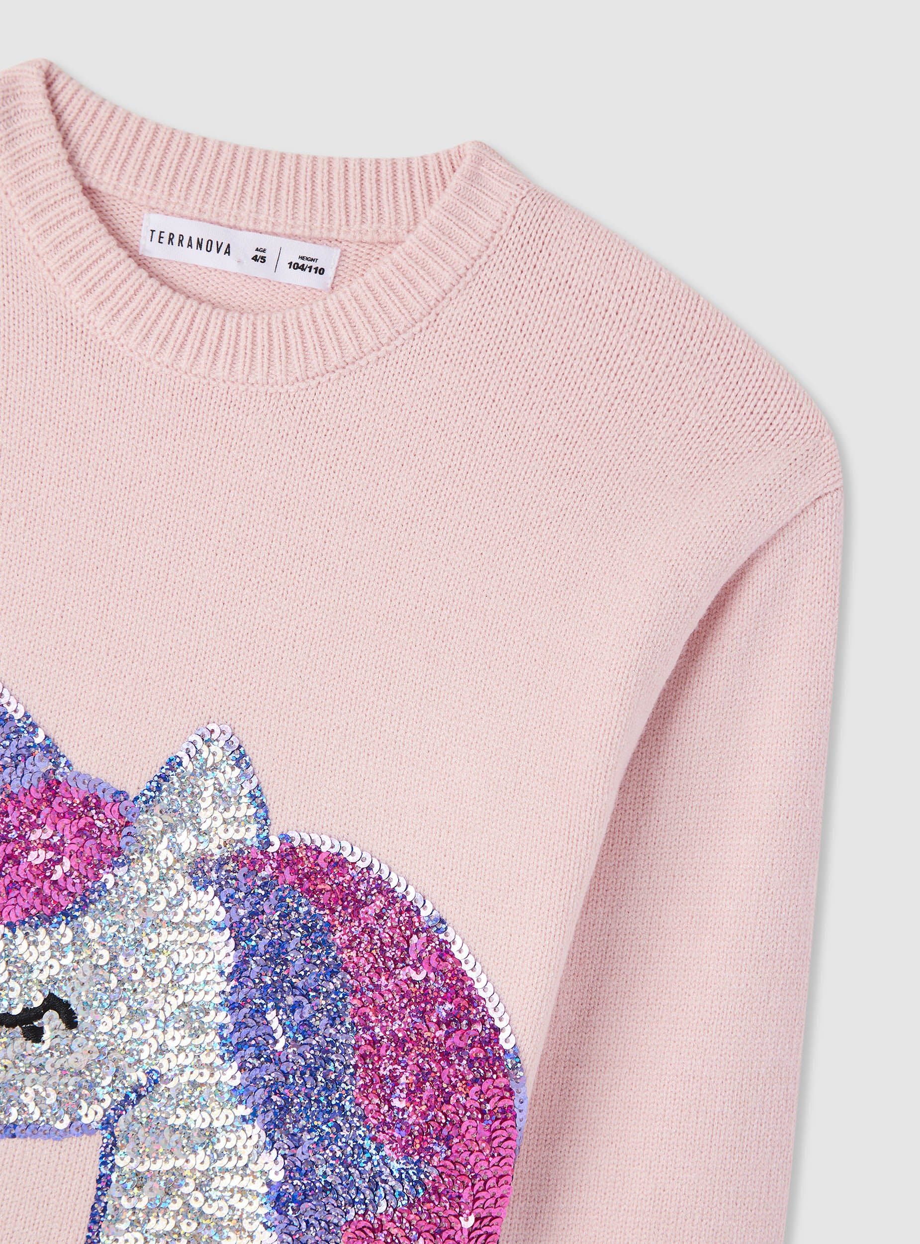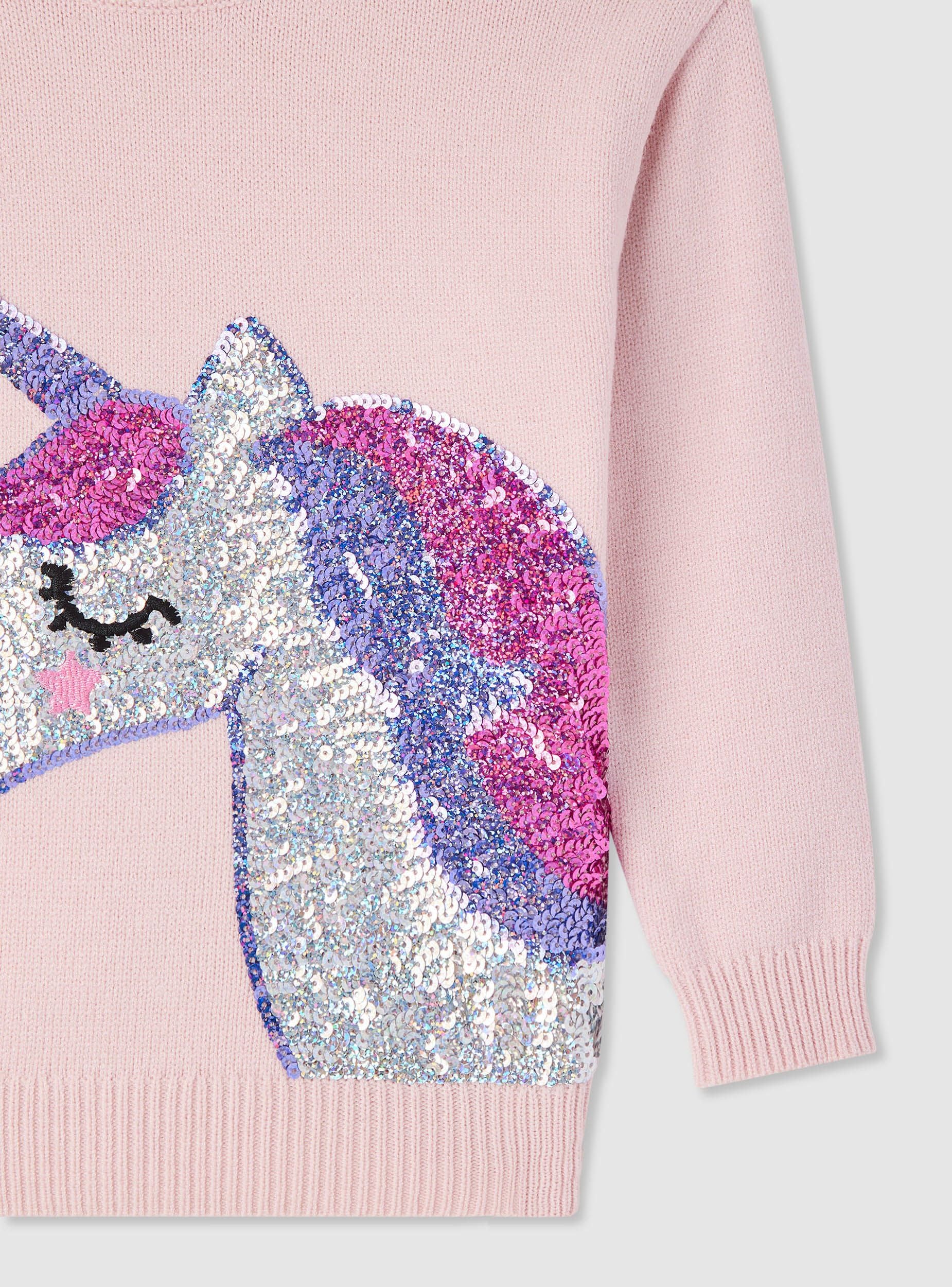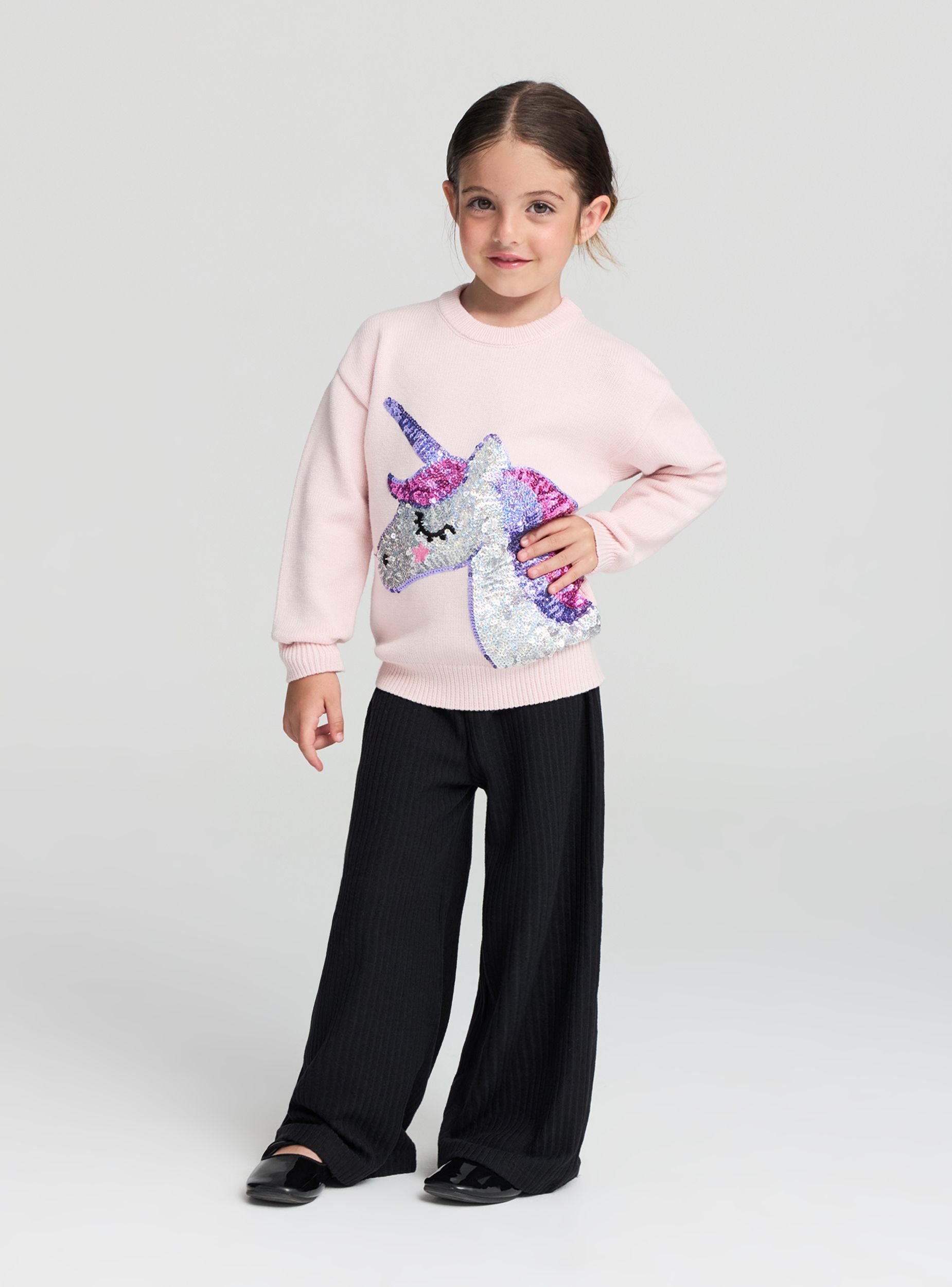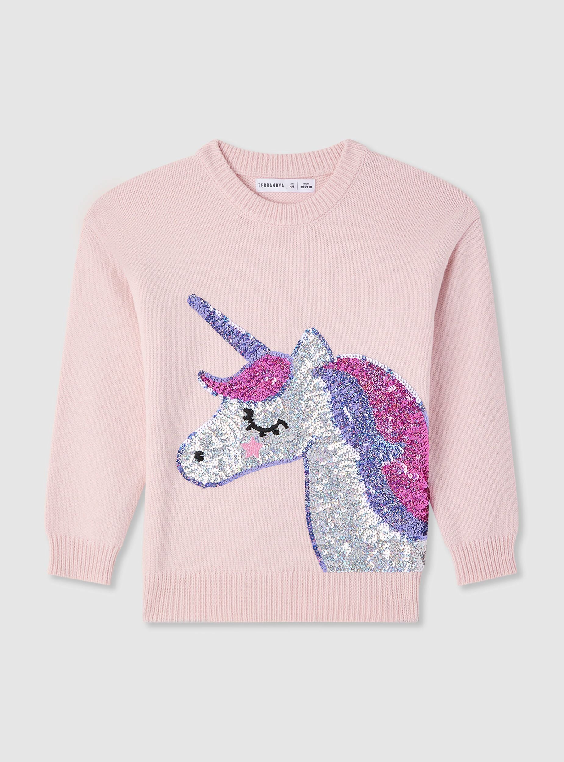 Džemperić za devojčice sa jednorogom ukrašenim šljokicama. Idealan za ležeran i zabavan izgled, ovaj džemper savršeno se uklapa sa farmerkama ili sportskim pantalonama za udoban i razigran stajling. Ima regularan kroj i okrugli izrez, sa dugim rukavima koji ga čine pogodnim za hladnije dane.