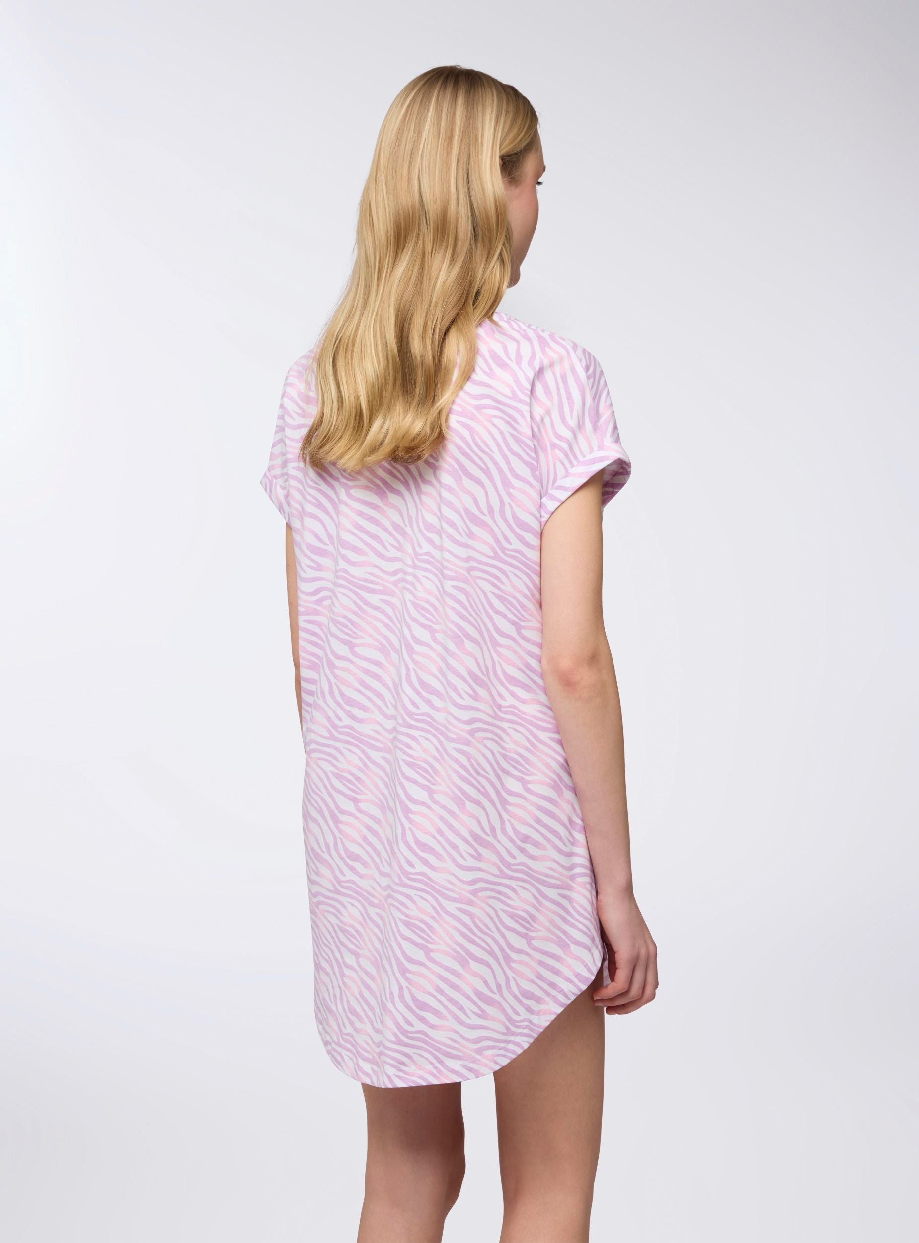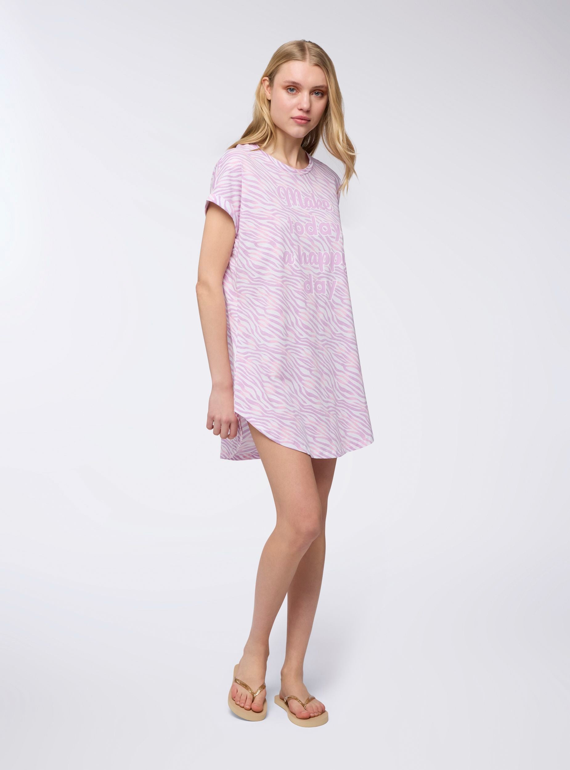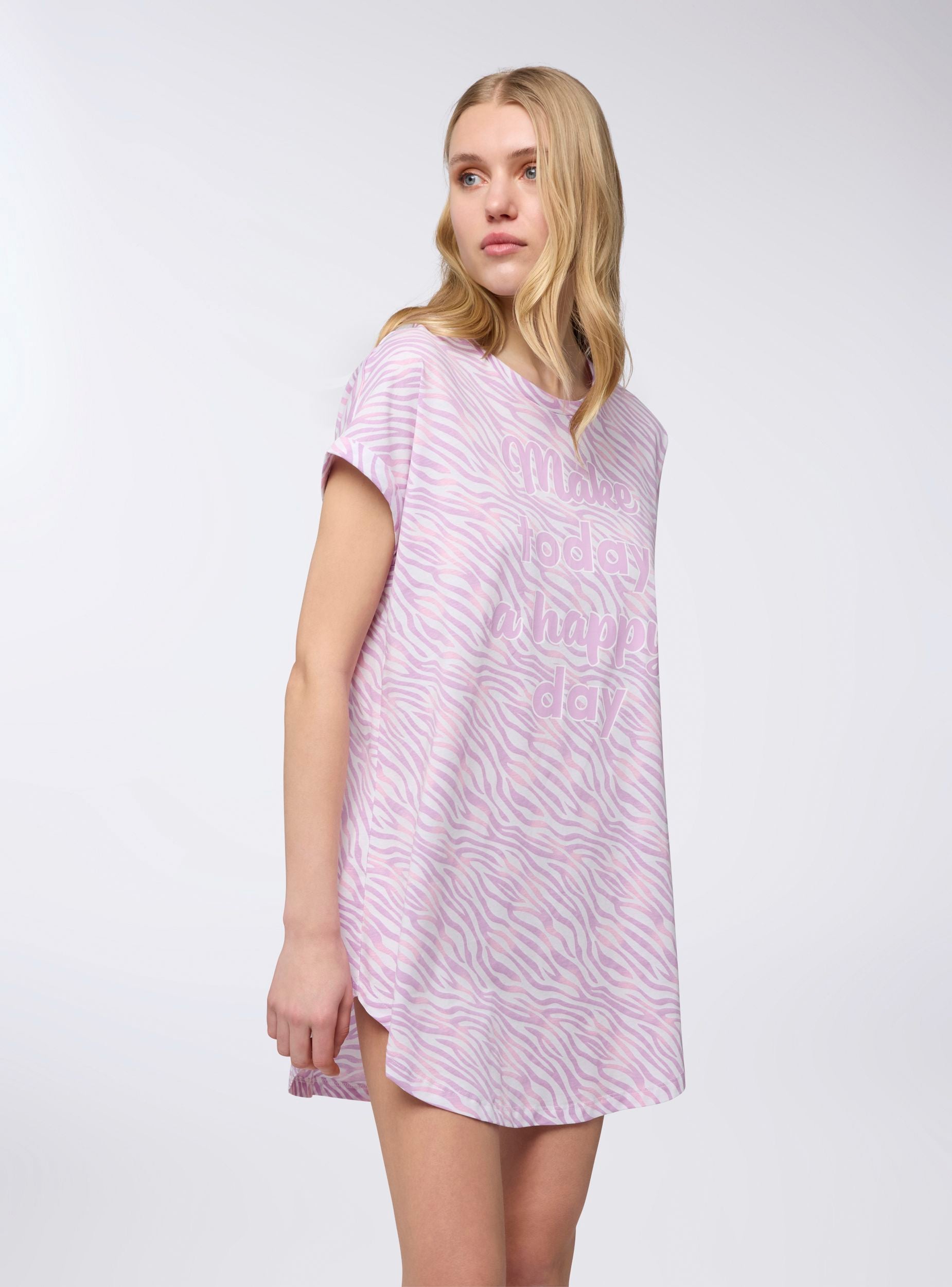 Ženska pidžama majica sa kratkim rukavima i okruglim izrezom, savršena za noći opuštanja. Dugi dizajn i zaobljeni donji deo garantuju udobno i prijatno nošenje. Živopisni dezen i simpatičan natpis dodaju dašak radosti. Idealna za kombinovanje sa mekanim tajicama ili da se nosi sama za apsolutnu udobnost tokom mirnijih večeri.