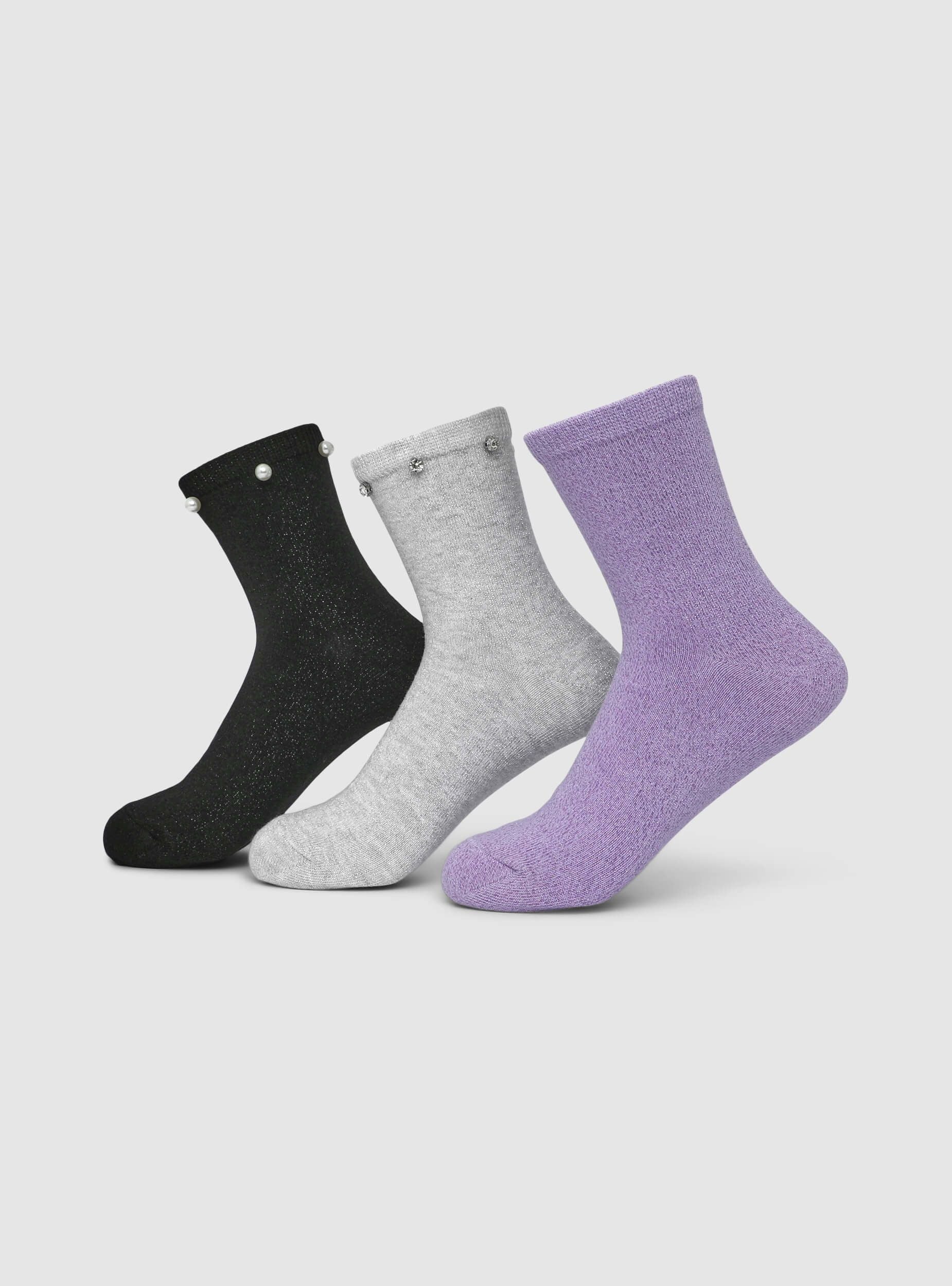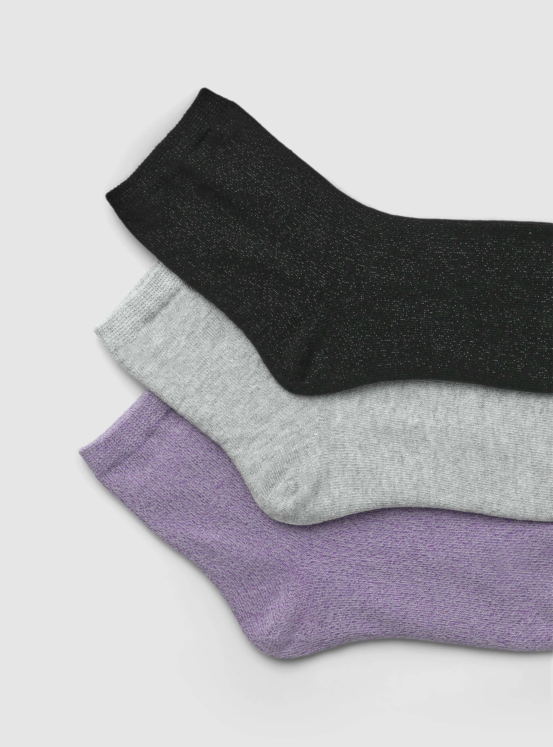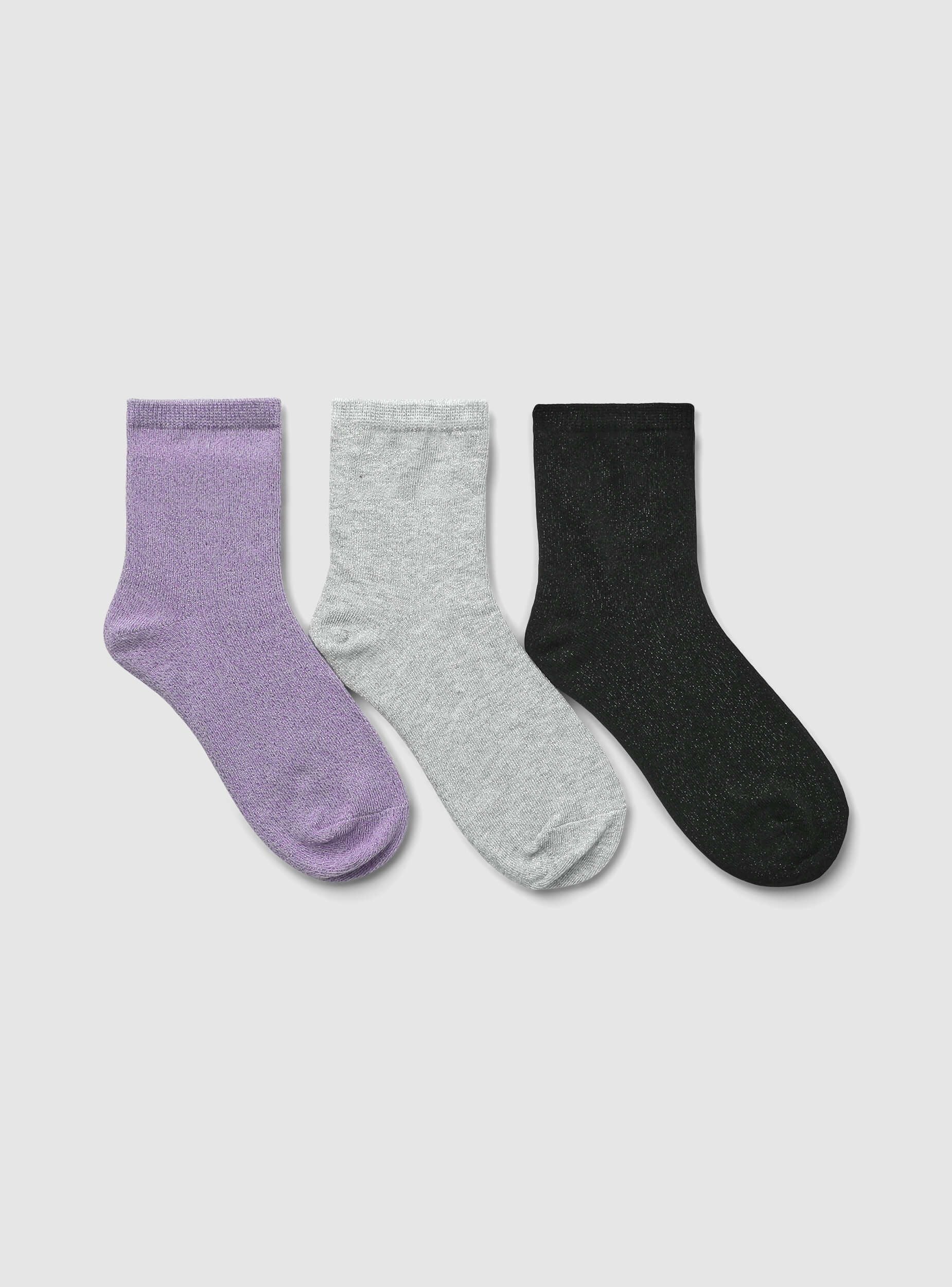 Čarape za devojčice idealne za upotpunjavanje ležernih i udobnih outfita. Pakovanje sadrži tri para čarapa, od sjajnog materijala sa dekorativnim detaljima poput perlica i aplikacija. Savršene su za nošenje uz niske cipele ili patike, dodaju dašak stila svakodnevnim izgledima. Standardna dužina ih čini svestranim i pogodnim za različite prilike.