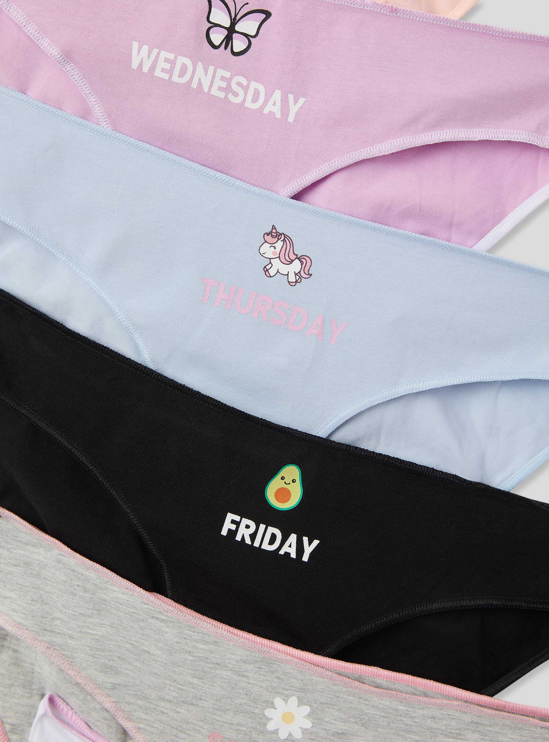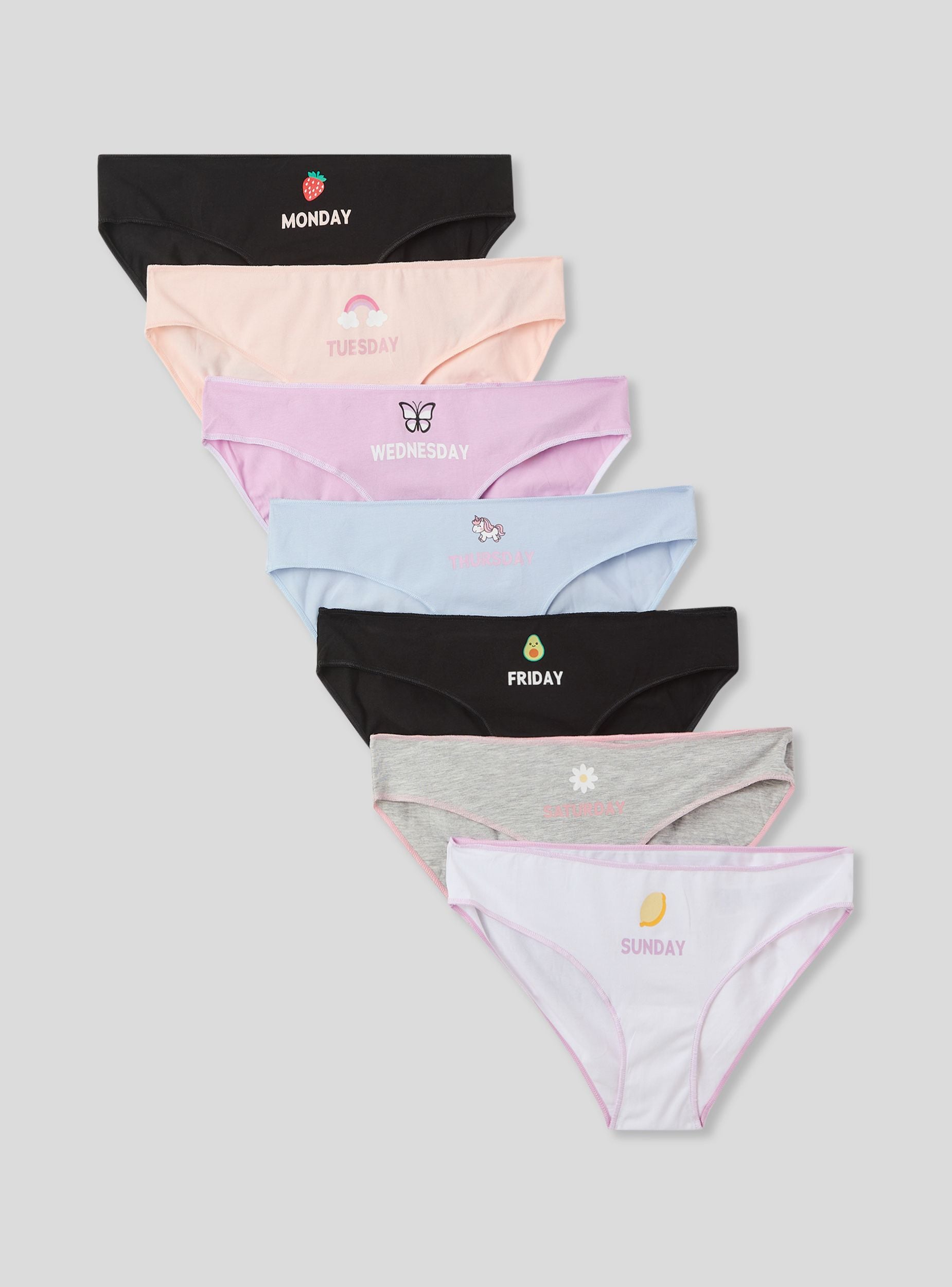 Confezione composta da 7 slip da donna con ogni giorno della settimana. Ogni slip presenta una stampa unica con simboli di fragola, arcobaleno, farfalla, unicorno, fiore e limone, accompagnati dalla scritta del giorno della settimana. Perfetti per aggiungere un tocco di allegria e praticità alla tua routine quotidiana, garantendo stile e comfort.Detalji