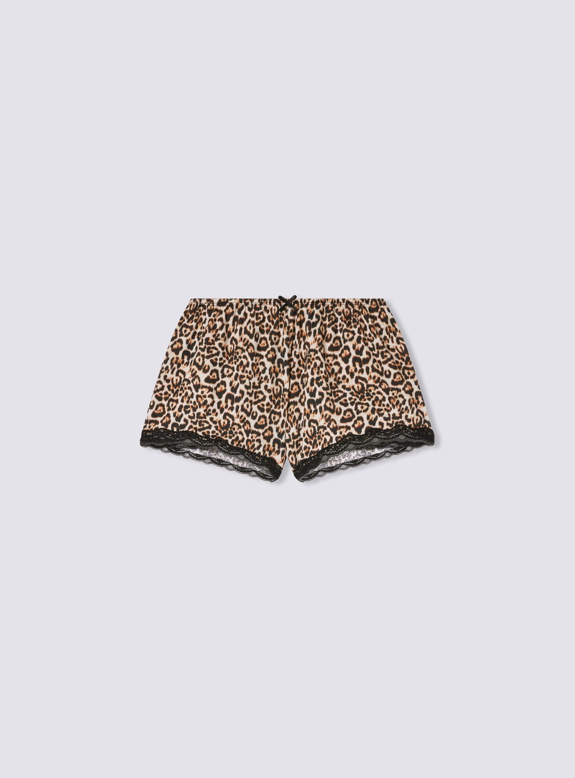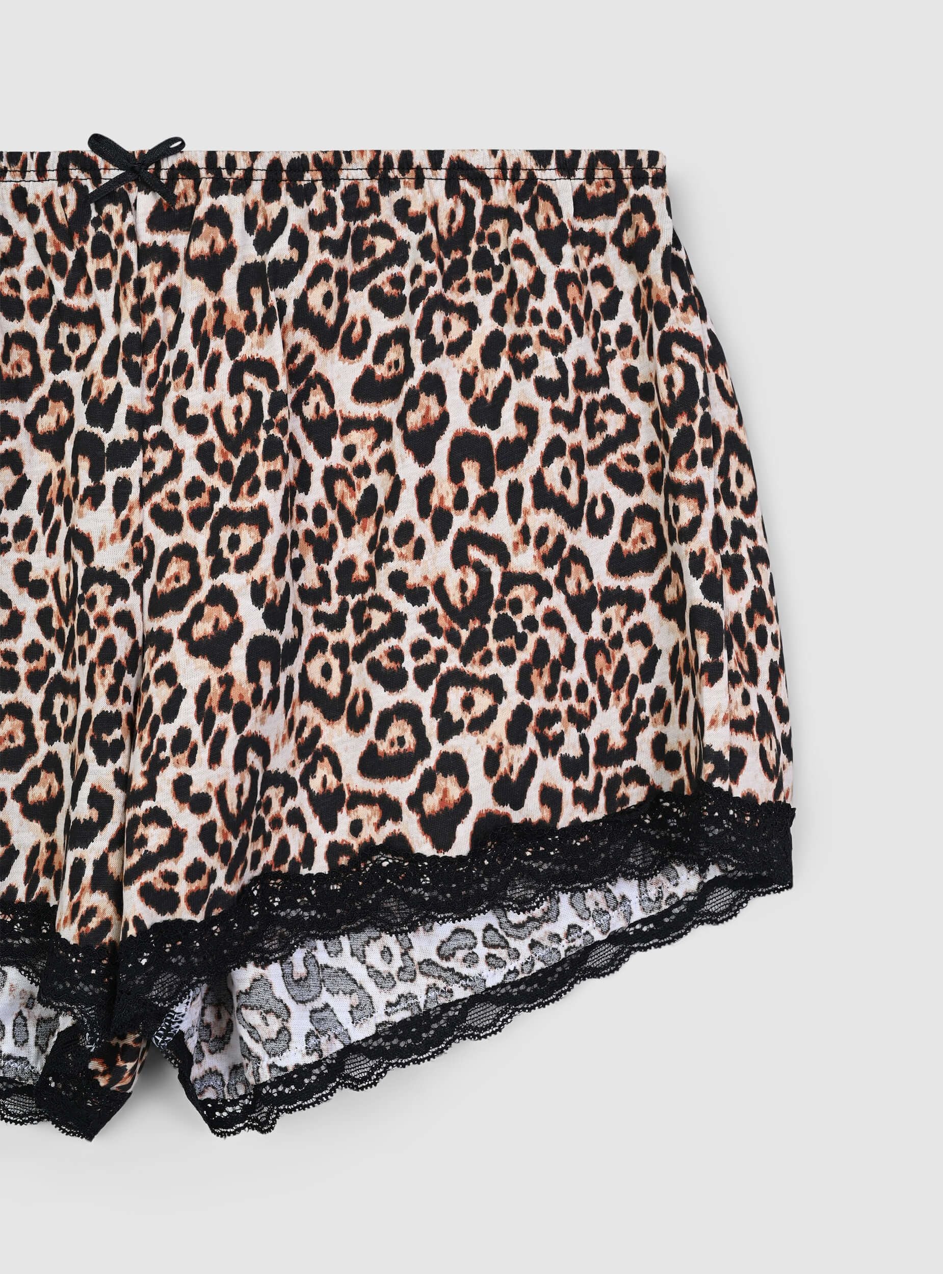 Ženski kratki pidžama šortsevi, savršeni za ženstven i privlačan izgled. Obogaćeni živopisnim šarama, dodaju dašak odvažnosti dizajnu. Delikatna čipkasta ivica naglašava rafiniranost komada, dok mala mašna u struku pruža romantičan i pažljiv detalj. Idealni su za one koji traže udobnost i stil, spajajući senzualnost i mekoću u trenucima opuštanja.Detalji