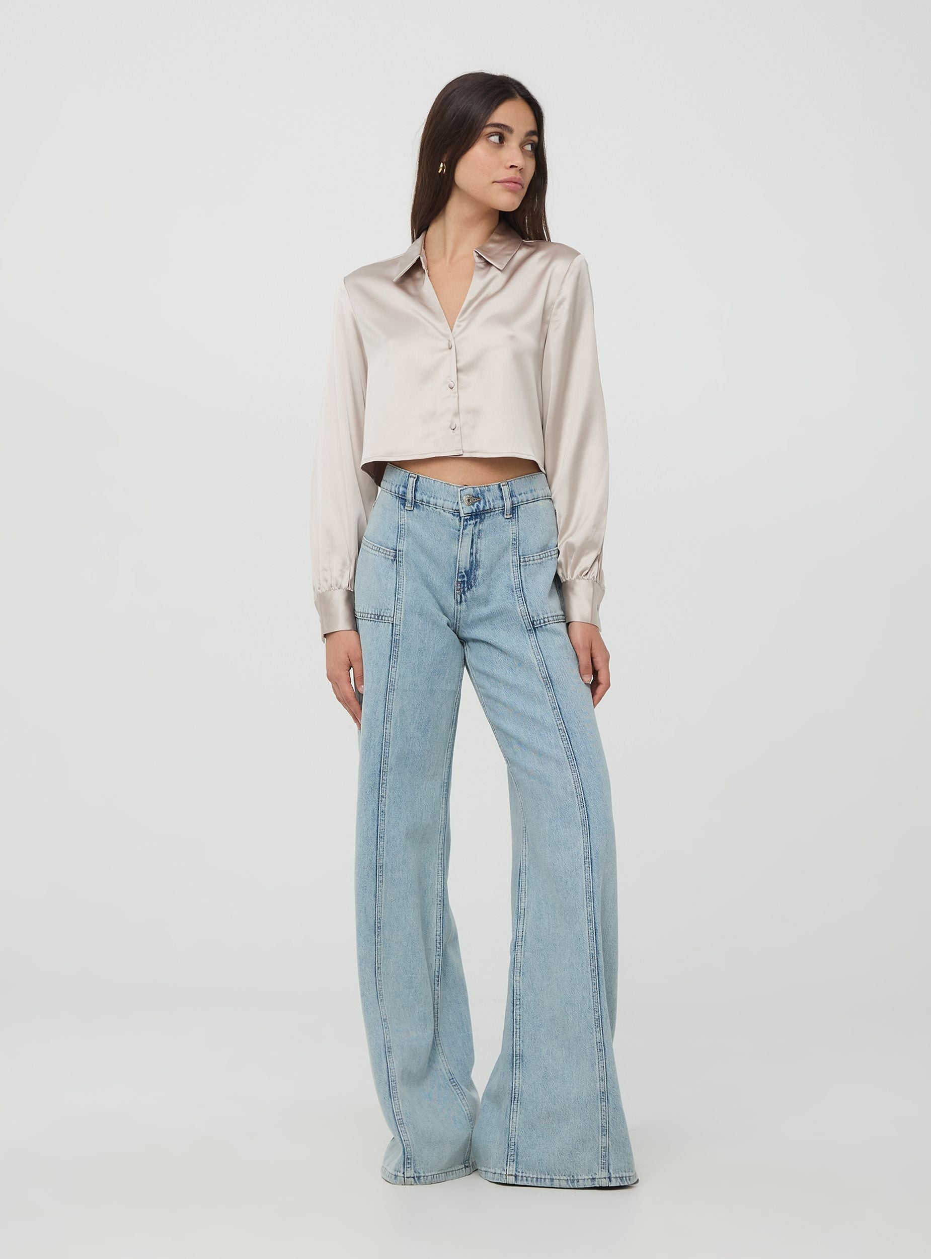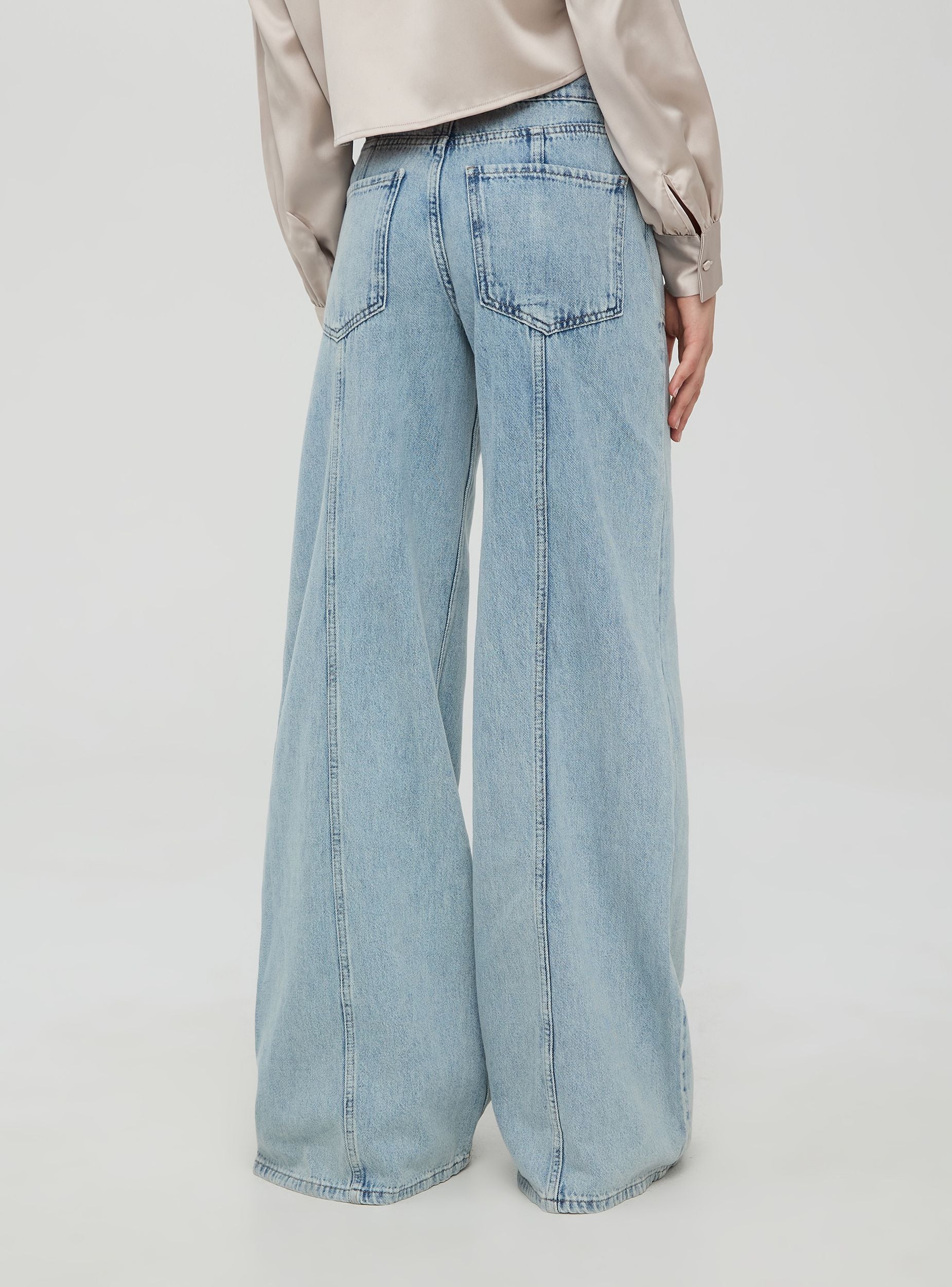 Ženski farovi, model sa širokim nogavicama sa nabranim detaljima. Ima dve prednje i dve zadnje džepa, pojas sa petljama i zatvaranje na dugme i rajsferšlus. Svetlo pranje. Širok kroj.Detalji