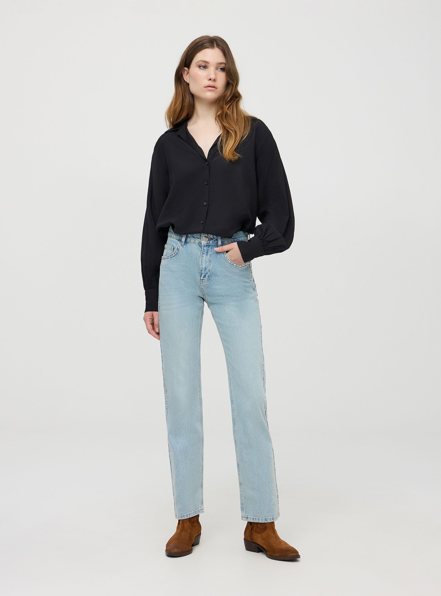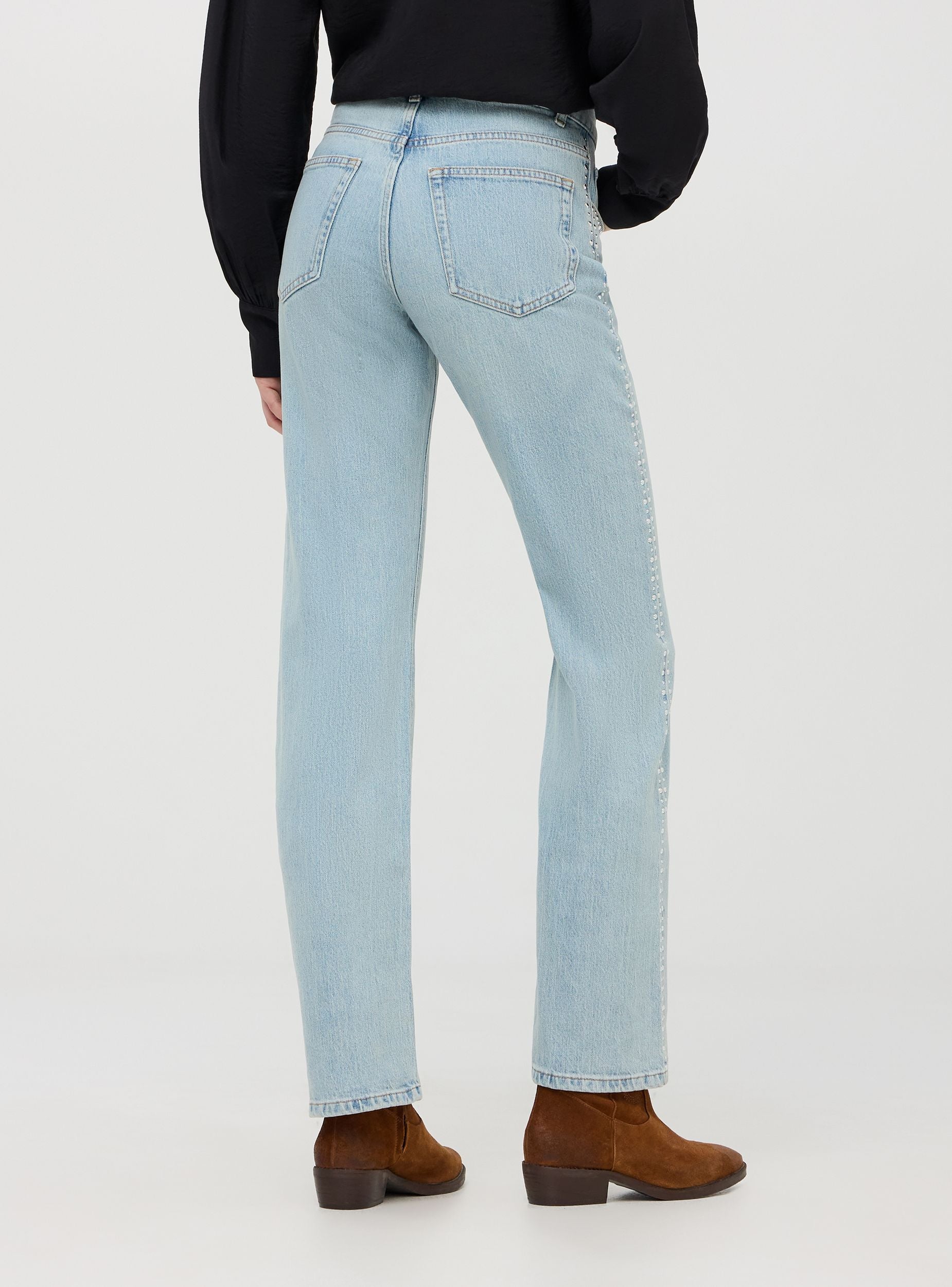 Ženski ravni farmerke sa dekorativnim zakovicama duž bočnih strana. Karakterišu ih srednji struk i ravni kroj, pružaju usklađen i udoban fit. Imaju detalje kao što su prednje dugme, pet džepova i pojas sa petljama. Idealne su za kreiranje ležernih chic kombinacija, savršene kako za večernje izlaske, tako i za neformalne dane. Lako se kombinuju sa topovima, bluzama i jaknama. Slim fit.Detalji