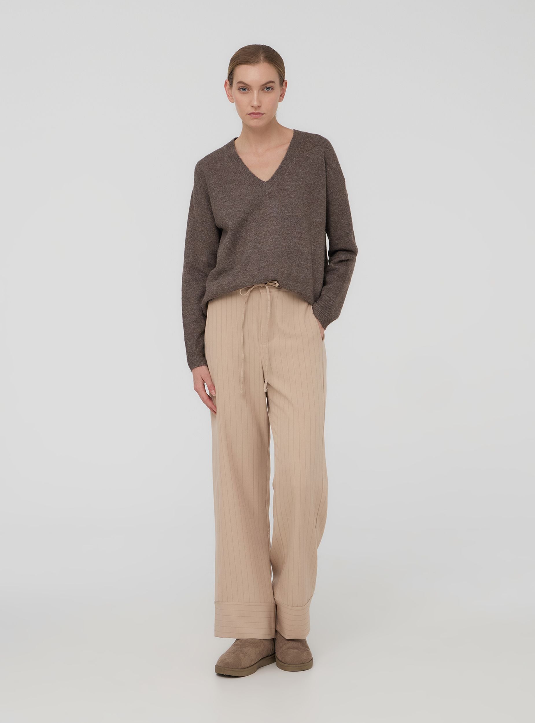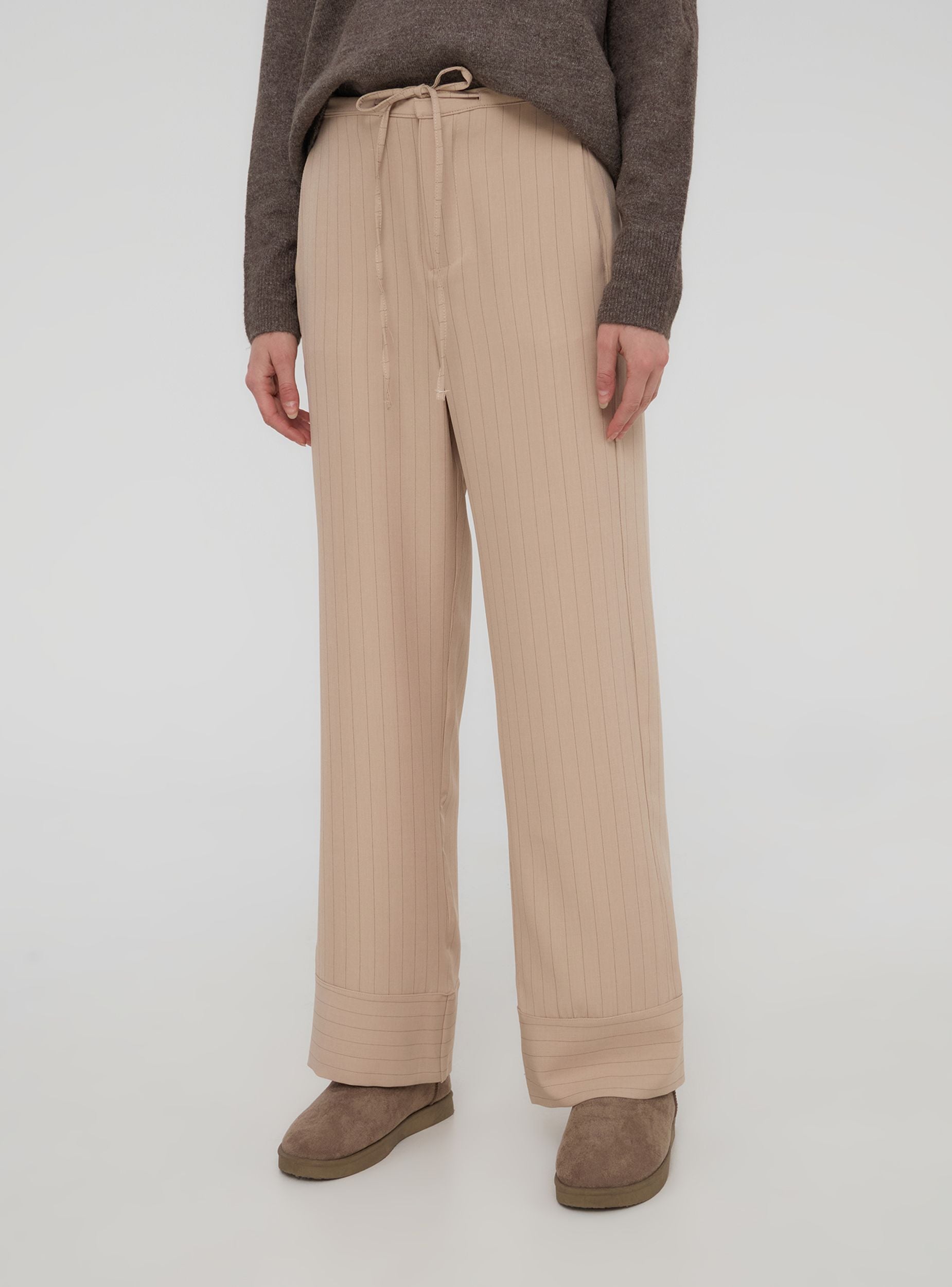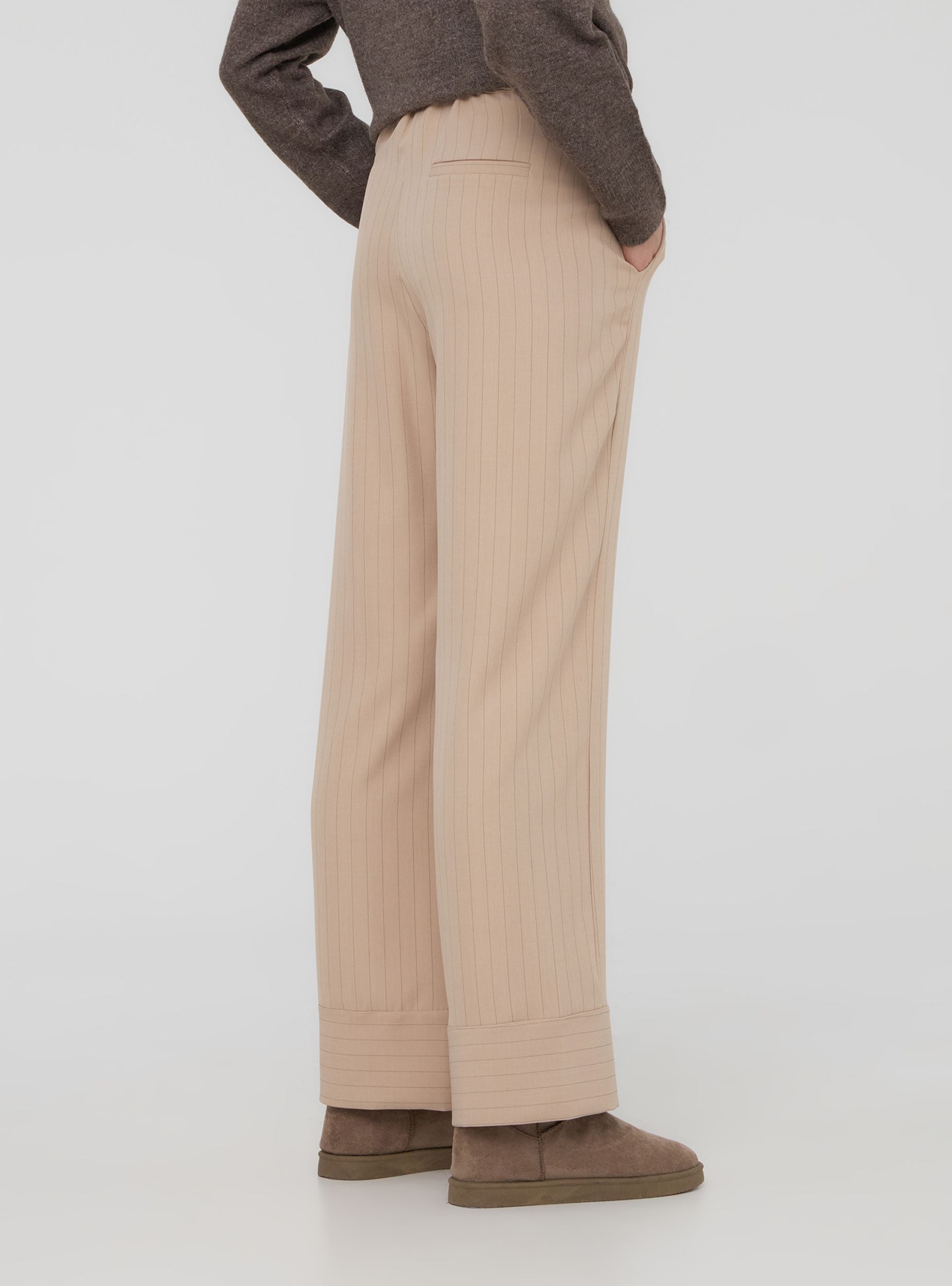 Pantaloni da donna dal taglio rilassato e moderno perfetti per chi cerca comodità senza rinunciare allo stile. Caratterizzati da un elegante motivo gessato, aggiungono un tocco di raffinatezza informale al look. Dotati di pratiche tasche laterali per maggiore funzionalità, presentano un elastico in vita una coulisse che permette di regolare la vestibilità, adattandosi alle diverse esigenze di comfort. Ideali da indossare in molteplici occasioni, questi pantaloni uniscono design e praticità, rendendoli un capo versatile per ogni guardaroba.Detalji