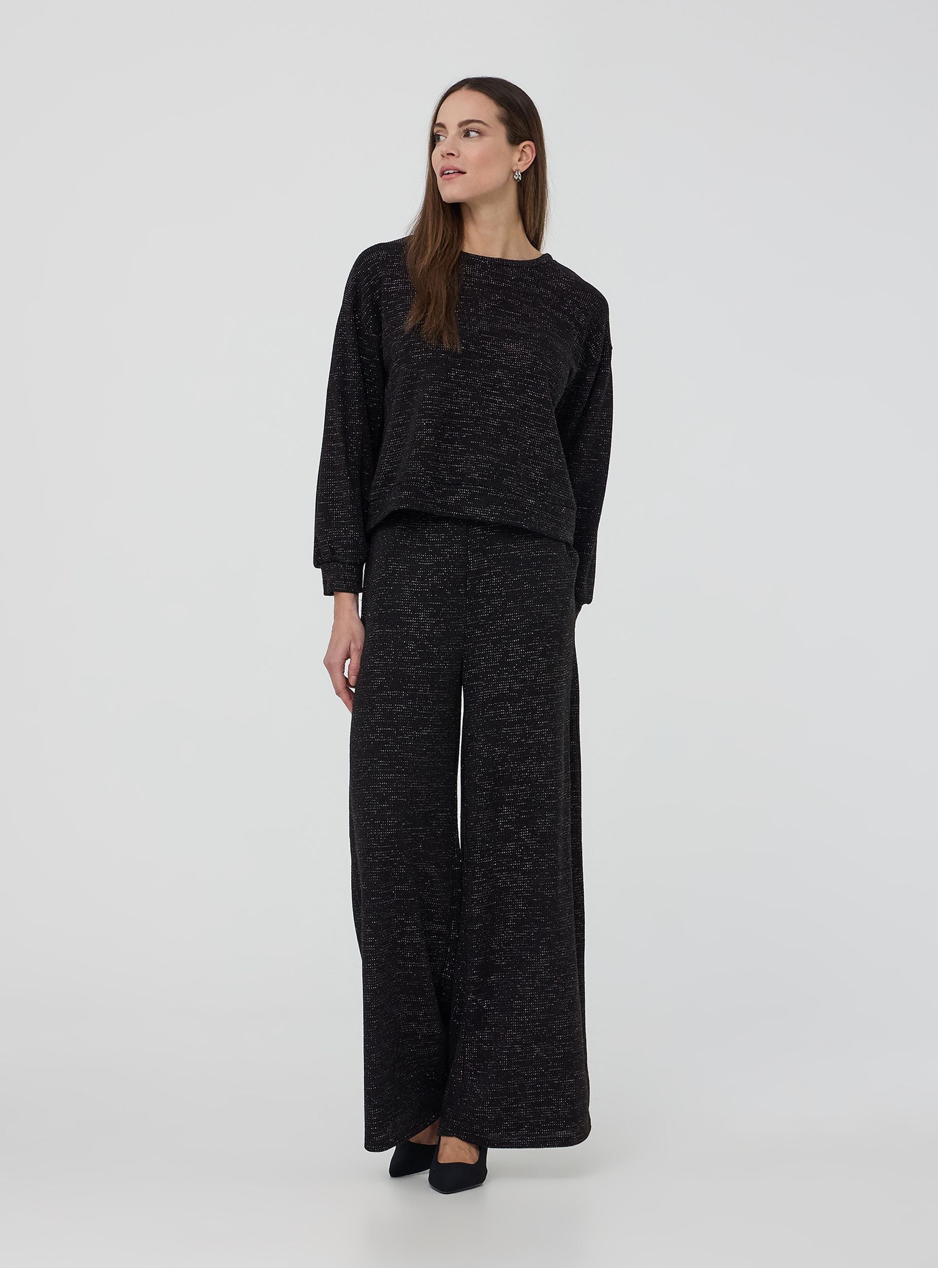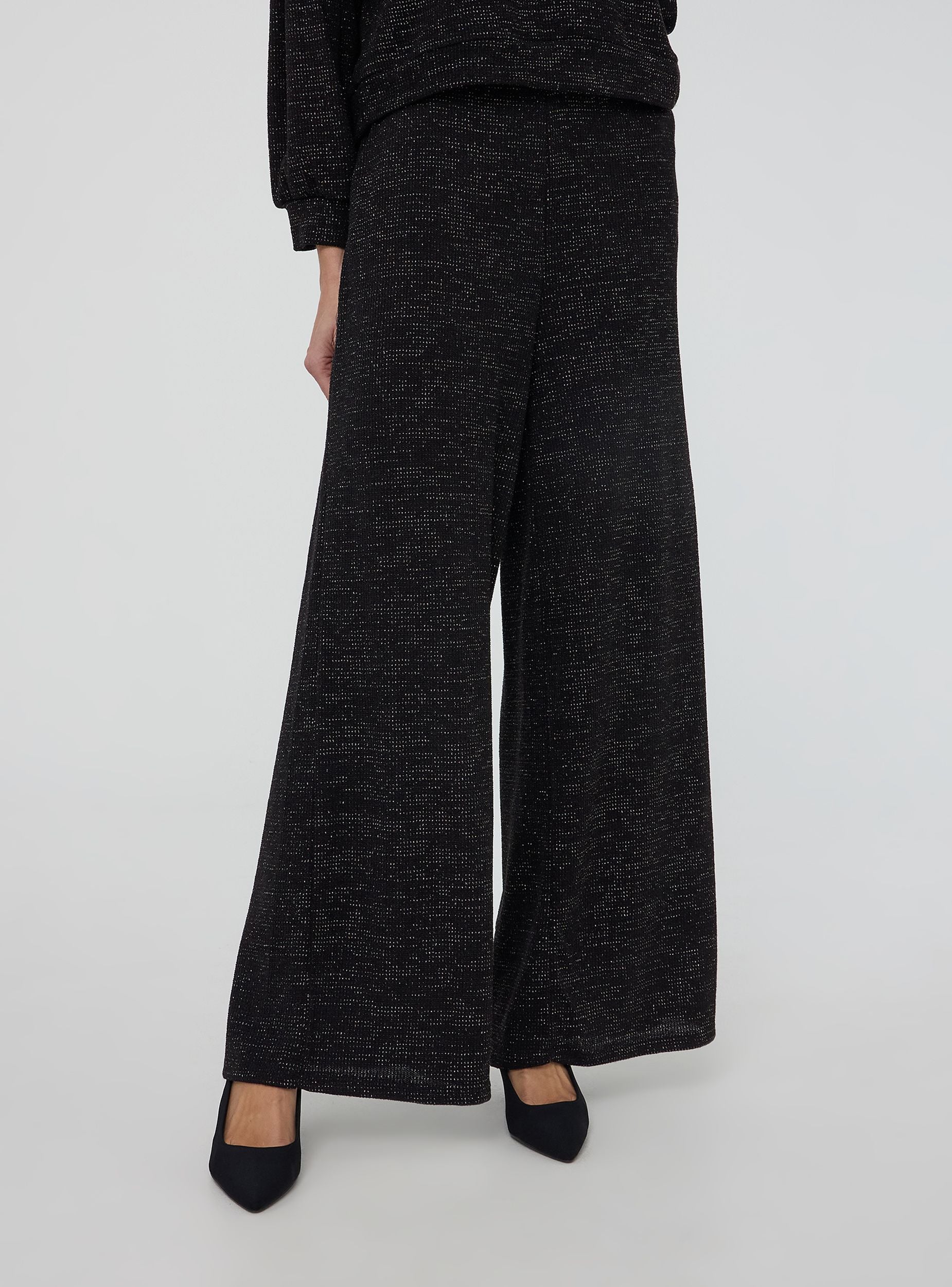 Pantaloni in maglia da donna caratterizzati da un elegante effetto luccicante che dona una luminosità  sofisticata alla tinta unita. La vestibilità  wide leg, con la gamba ampia e dritta, crea un look moderno e confortevole, perfetto per chi desidera un capo versatile da abbinare in diverse occasioni. La struttura morbida della maglia li rende ideali per un look casual chic, garantendo al contempo un comfort assoluto. Ideali per creare outfit distintivi, questi pantaloni sanno come valorizzare ogni figura con stile e semplicità .
