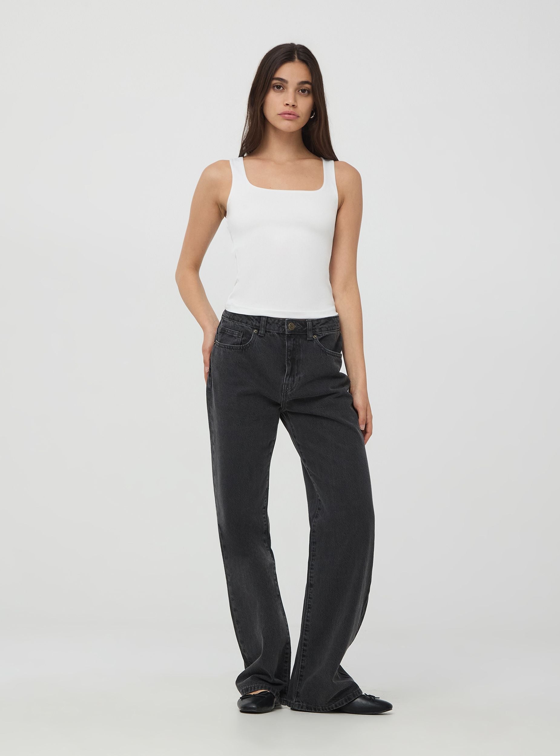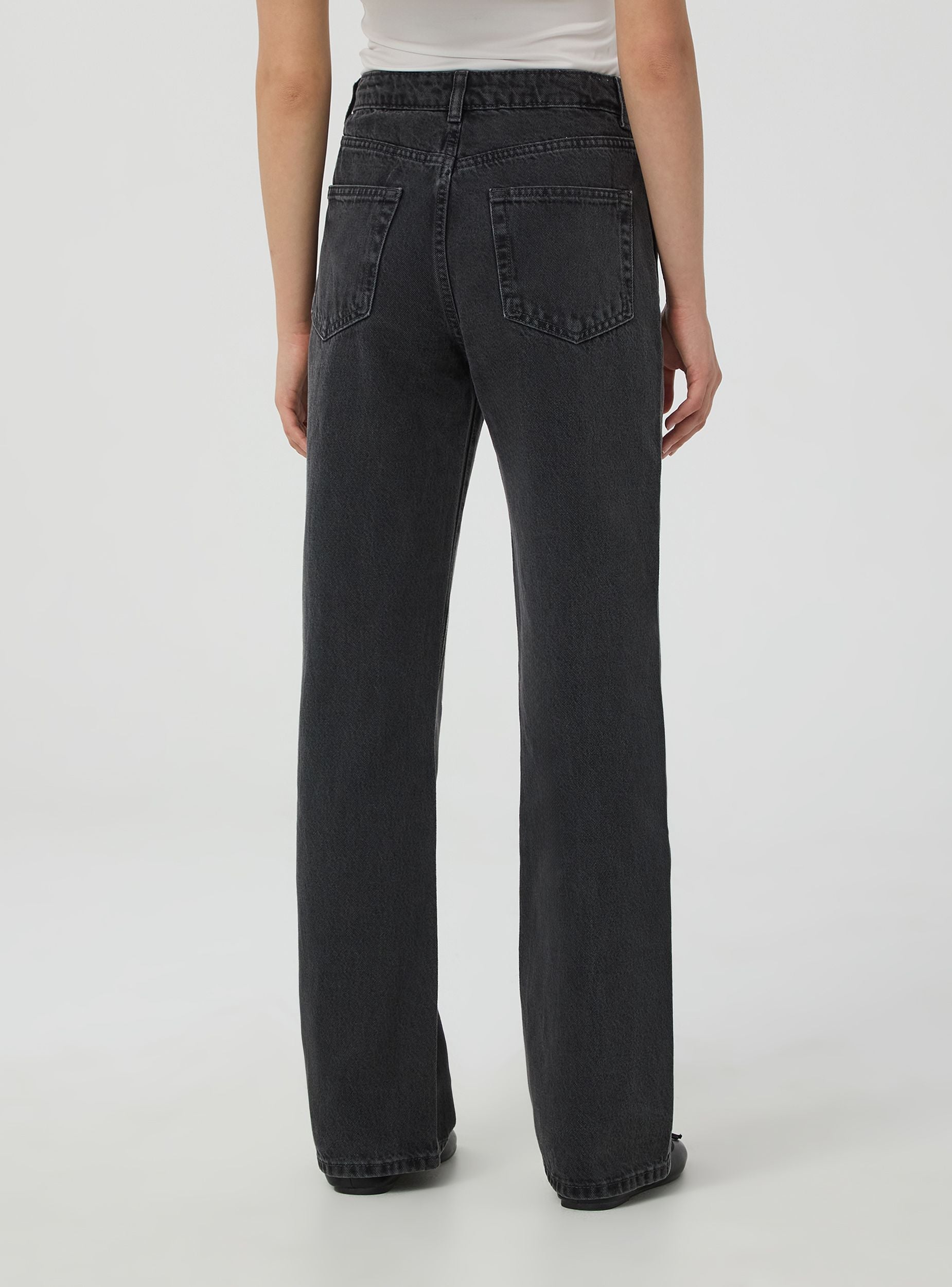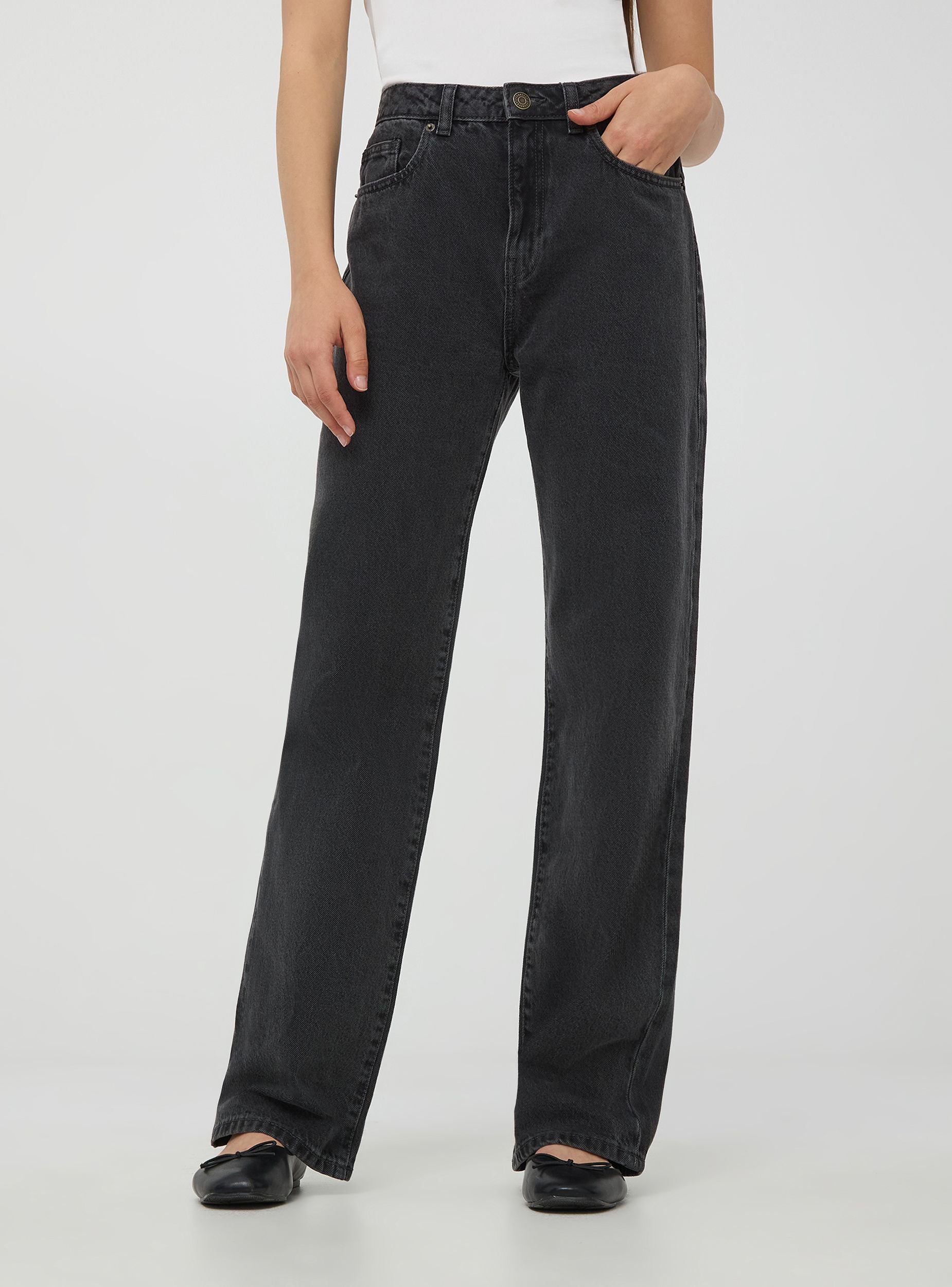 Ženski farmerke, ravnog kroja, izrađene od mekog crnog denima. Uniformna crna boja daje sofisticiran izgled, dok široka kroja nudi optimalnu udobnost i retro izgled. Detalji uključuju šavove u tonu, pet funkcionalnih džepova, zatvaranje na rajsferšlus i metalnu dugmad. Savršene za svakodnevni ležeran izgled ili večernje izlaske.