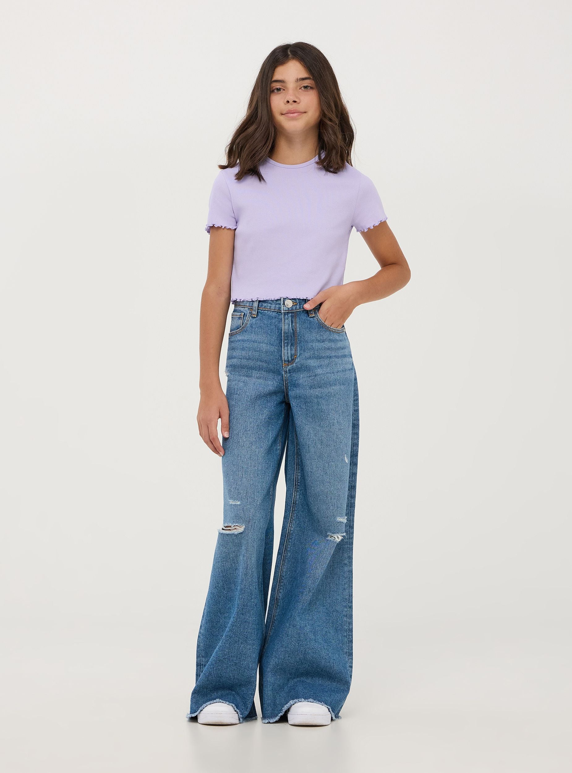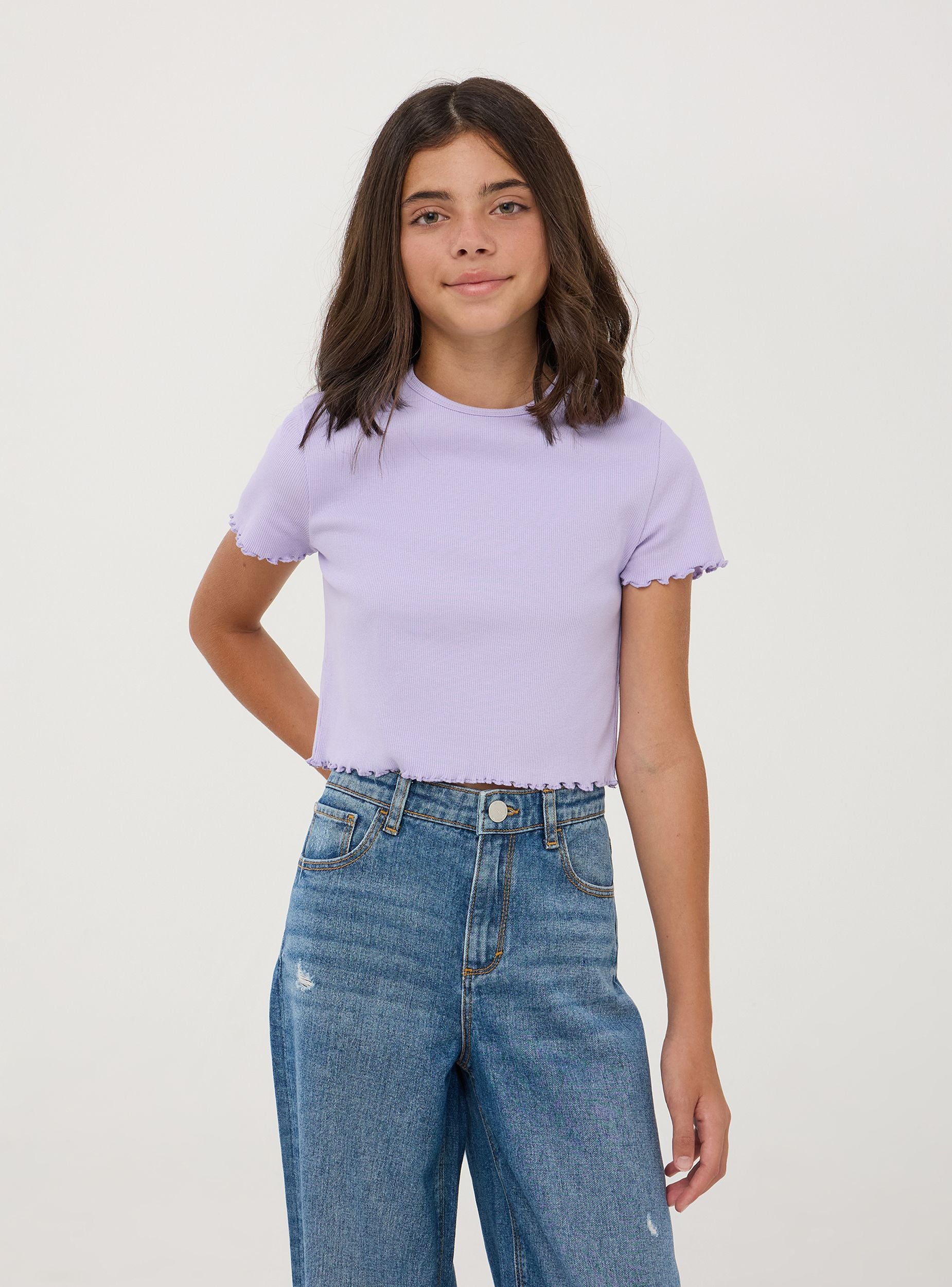 Majica za devojčice od rebrastog materijala u jednobojnoj boji sa baby overlock ivicama. Model sa okruglim izrezom i kratkim rukavima. Kroj je skraćen.