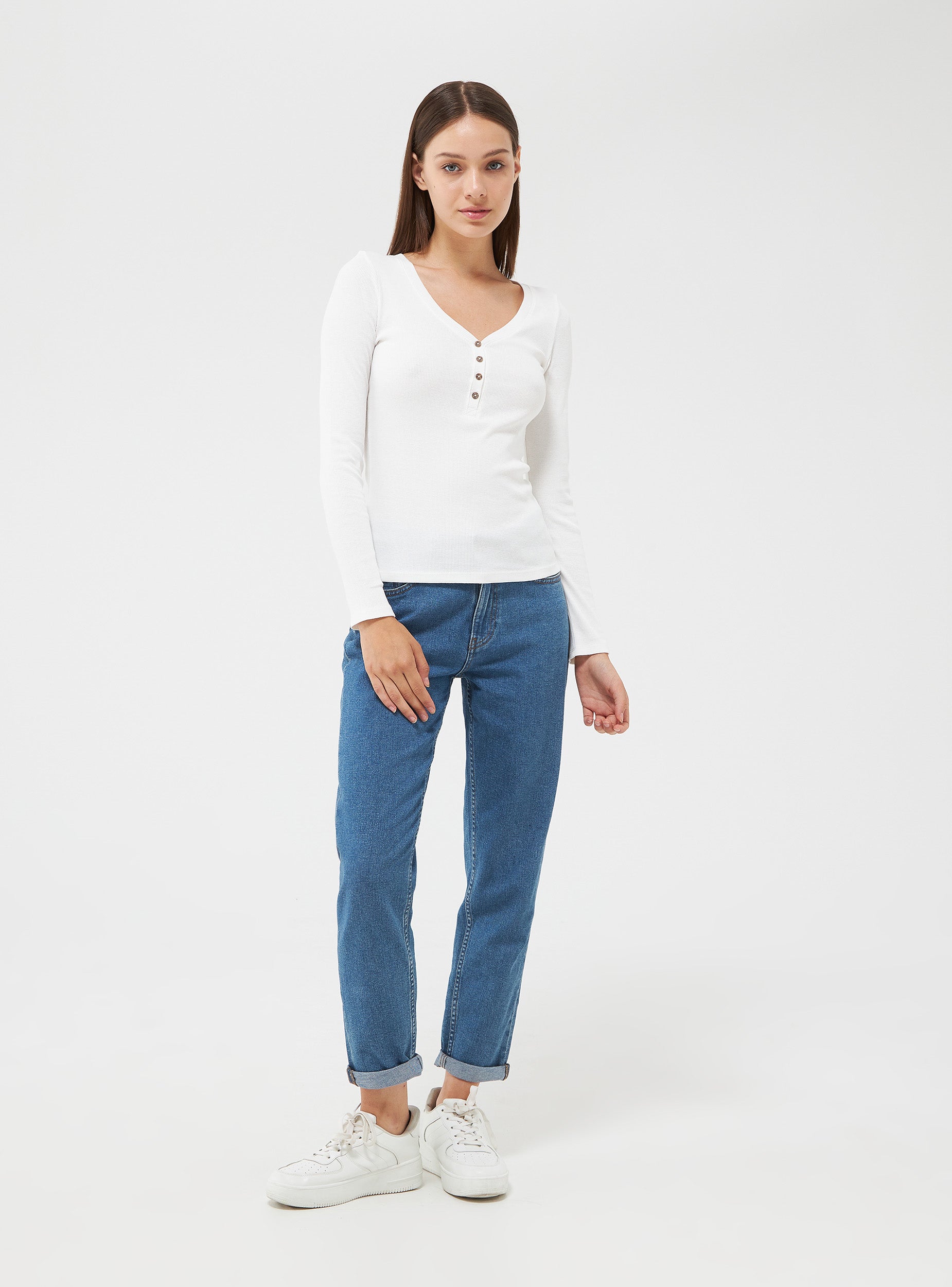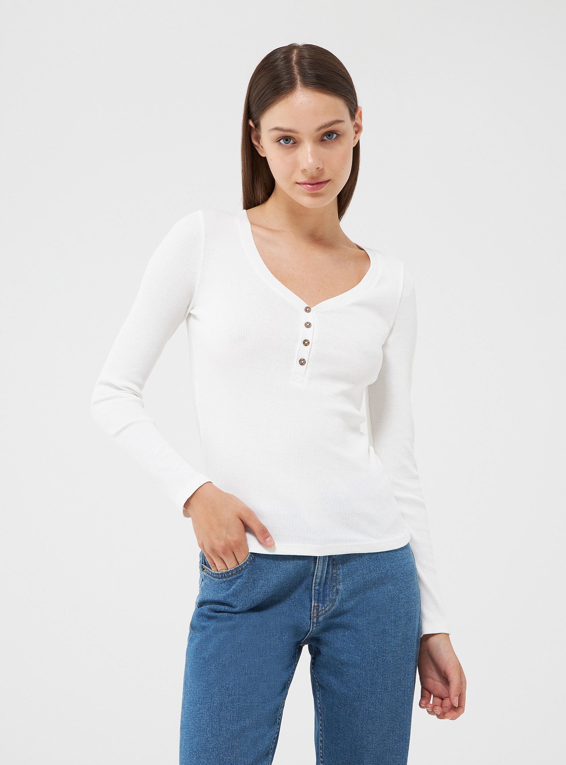 Maglia da donna a manica lunga con scollo a serafino. Tessuto in cotone a costine tinta unita. Vestibilità slim.Detalji