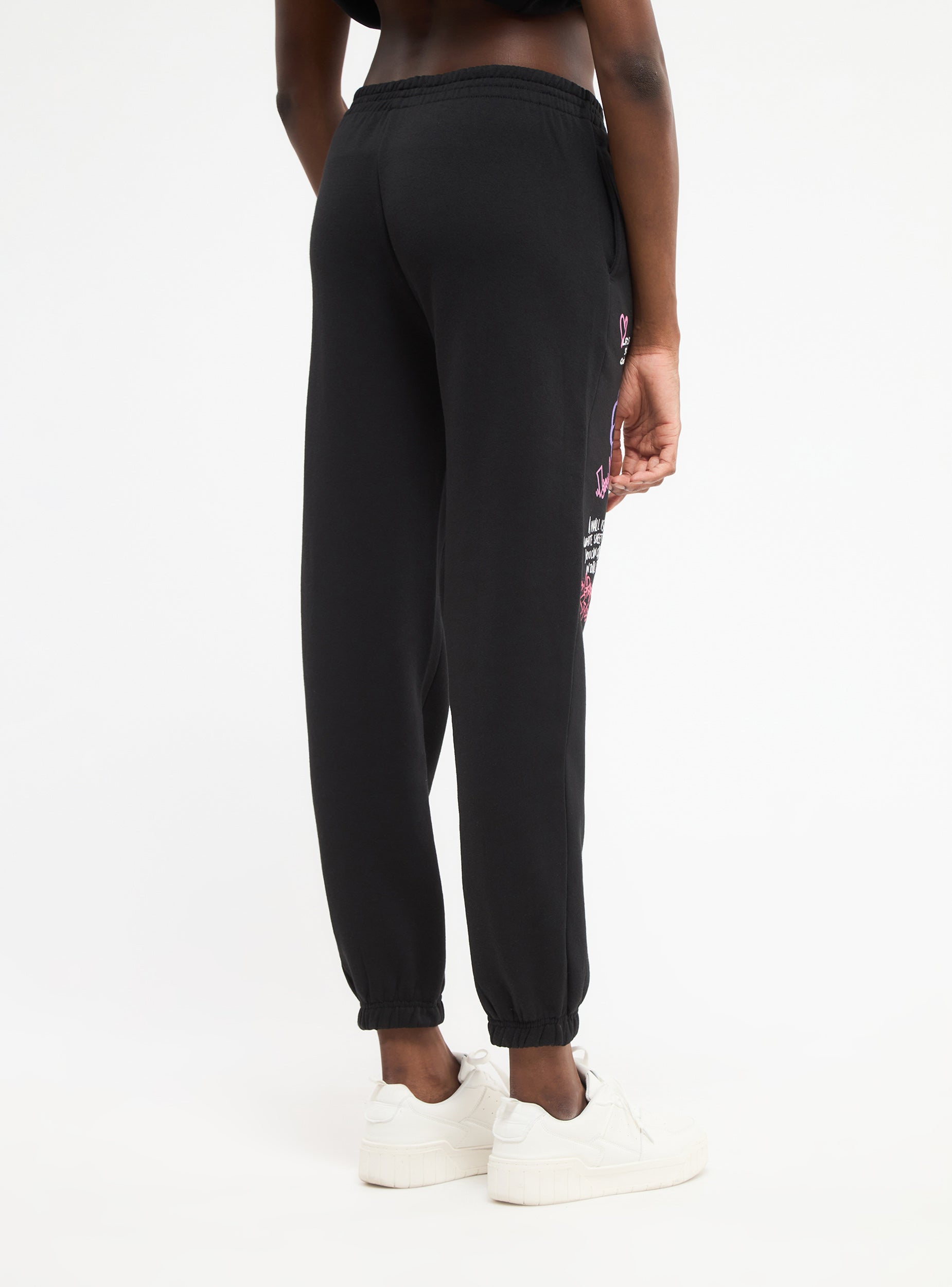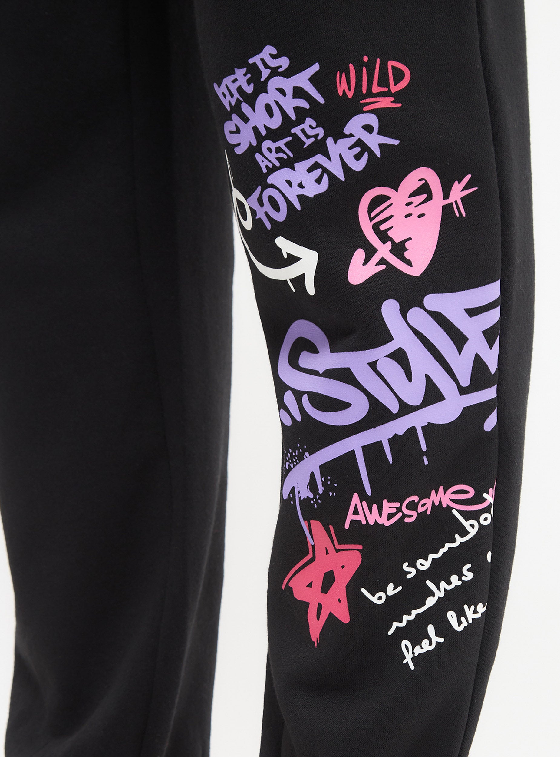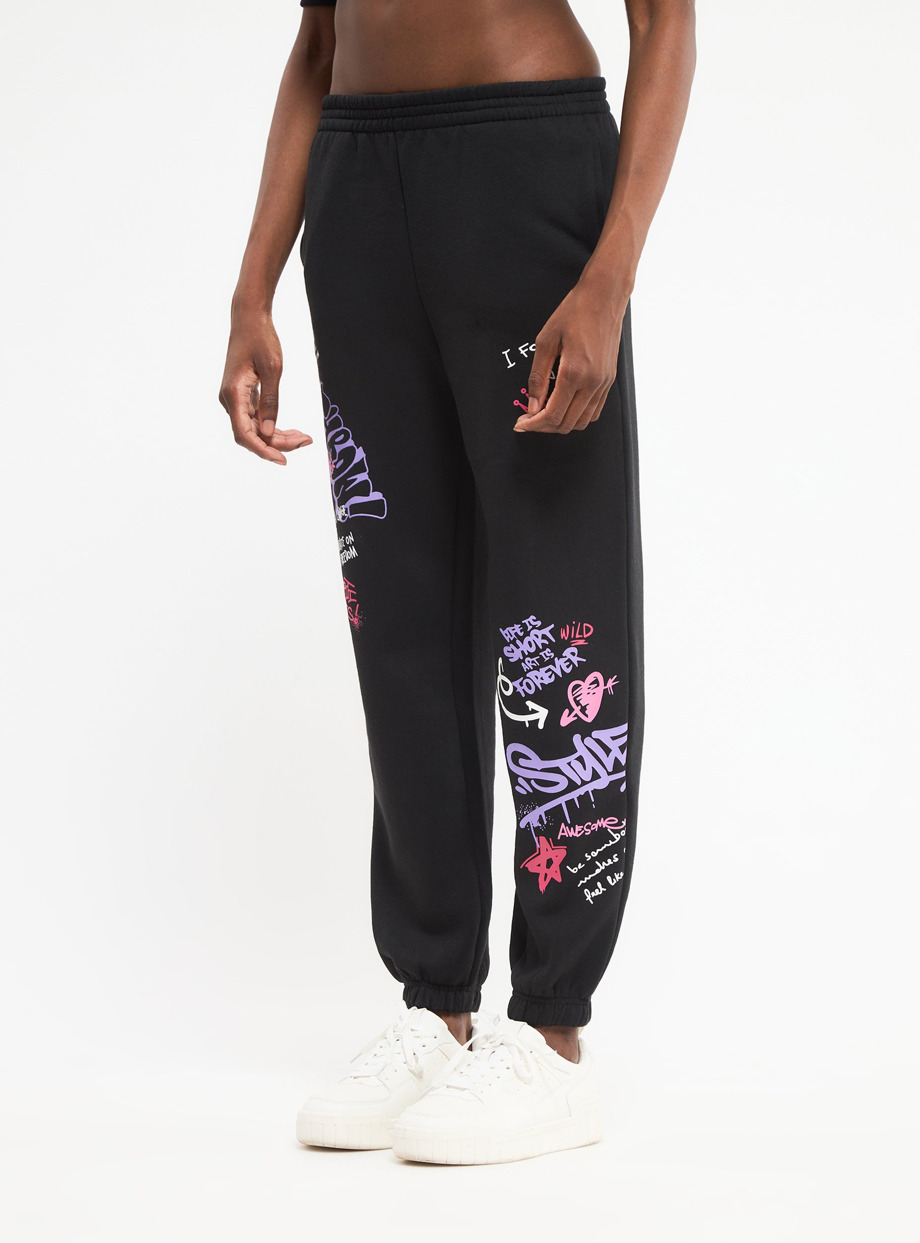 Pantaloni tuta lungo da donna. Vita alta con fascione elastico. Tasche laterali, polsino fondo con elastico. Tessuto pesante a tinta unita con scritte stile graffiti, Vestibilità  morbida.