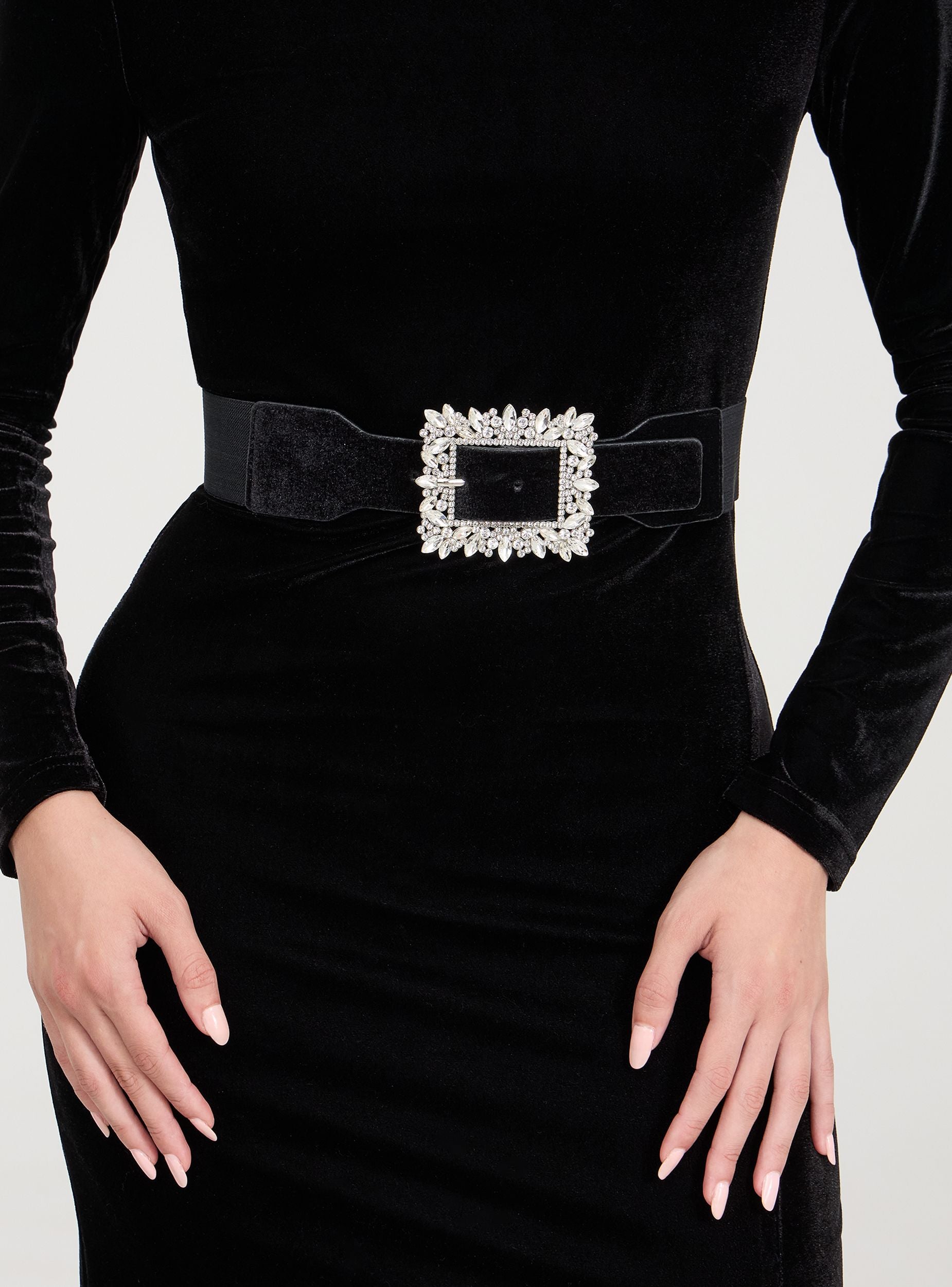 Ženska visoka pojasna sa kopčom dekorisanom strasima. Ima regulisanu kopču sa rupama za prilagođavanje. Elegantni i sjajni dizajn kopče dodaje dašak sofisticiranog stila, idealnog za upotpunjavanje kako ležernih, tako i formalnih izgleda.