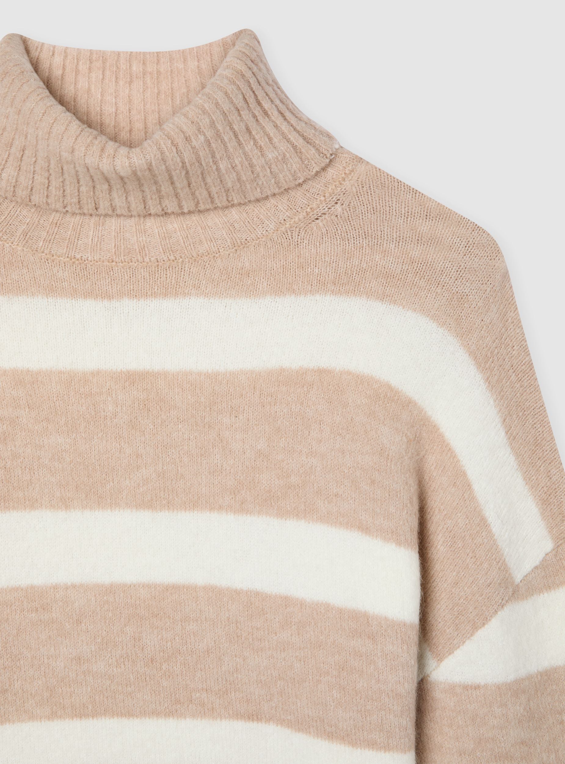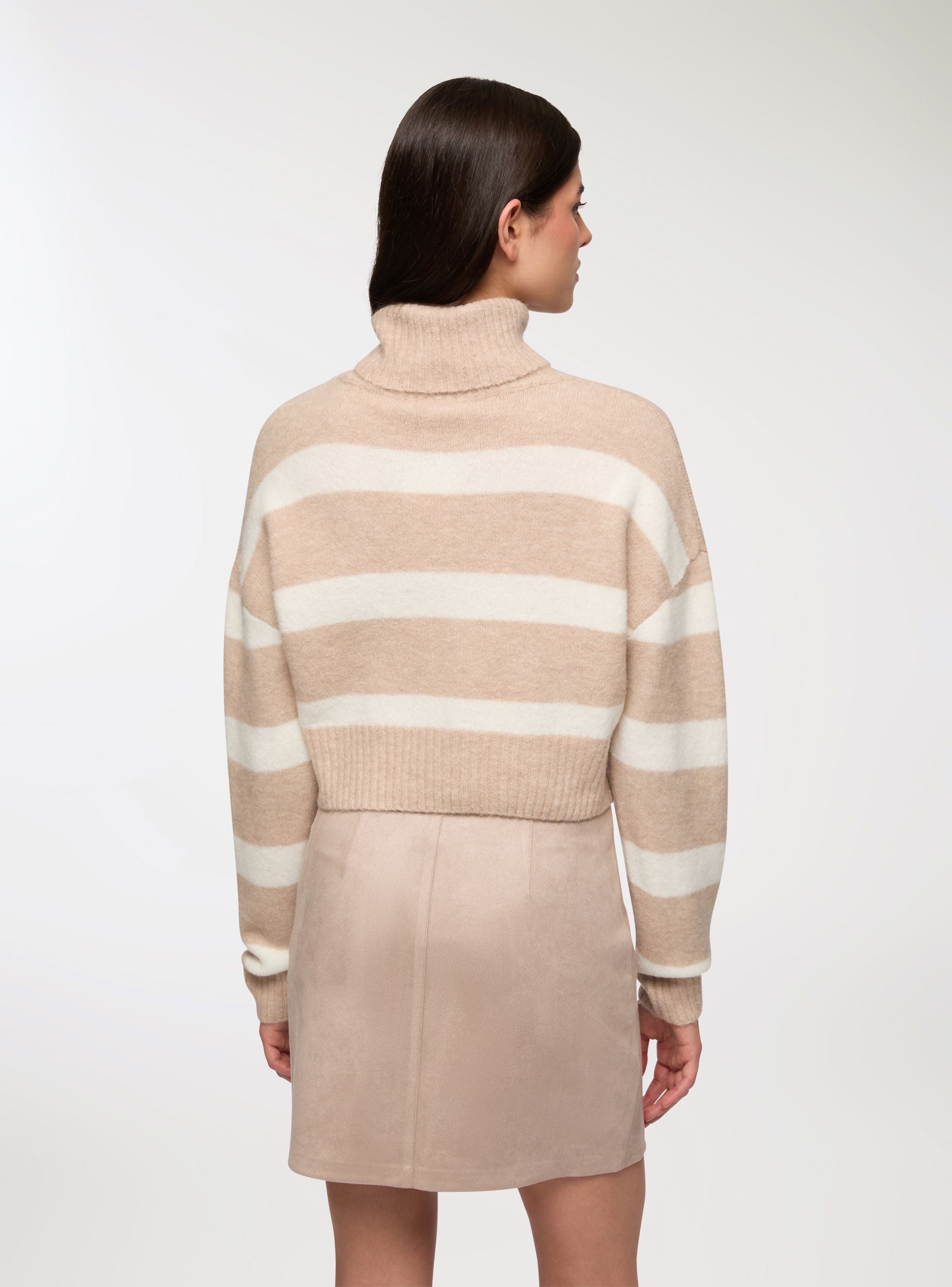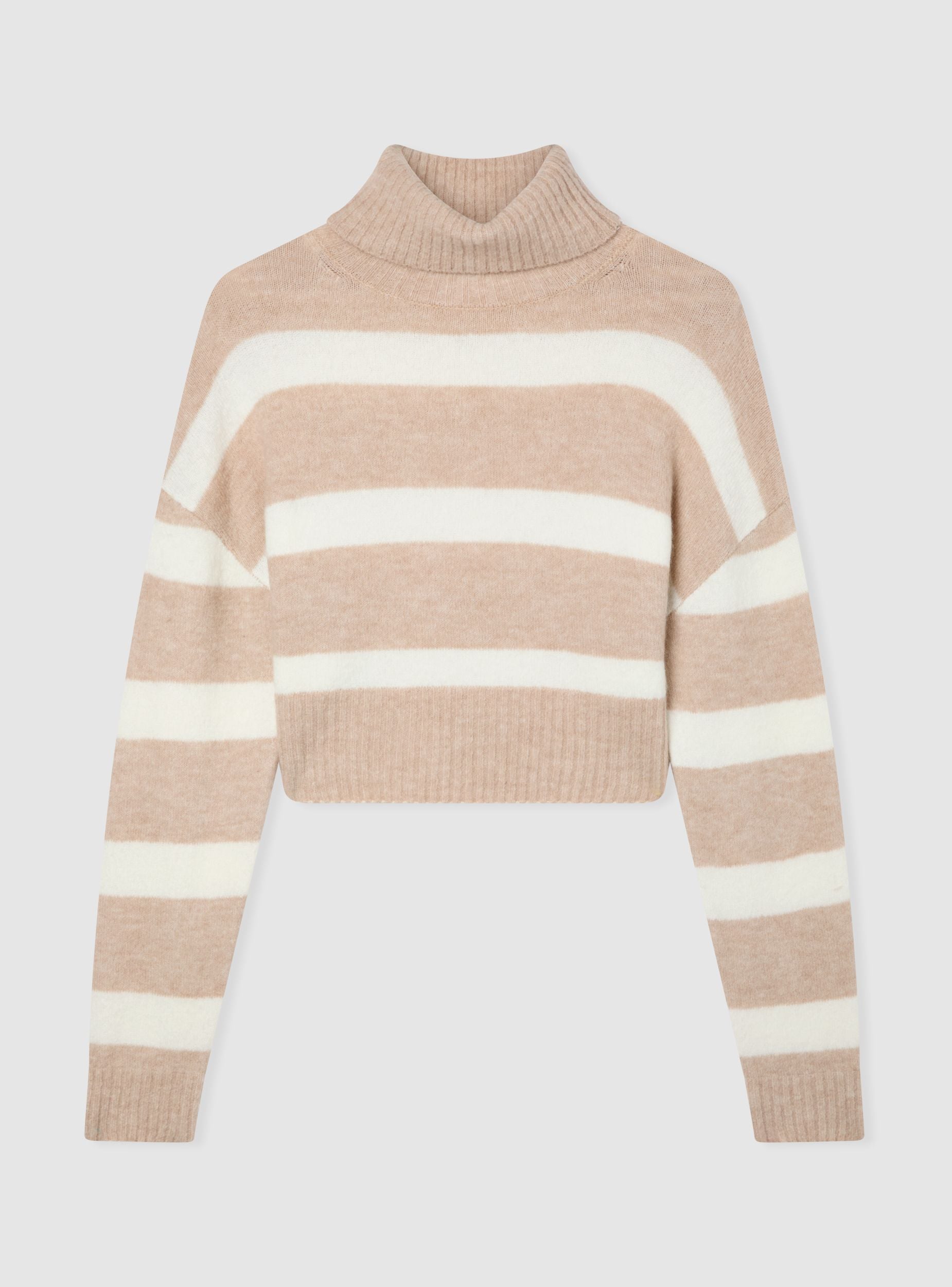 Ženska majica sa crop dizajnom i rolkom, karakteristična po prugastom uzorku koji joj daje moderan i dinamičan izgled. Idealna za ležerni stil, savršeno se slaže sa farmerkama ili pantalonama sa visokim strukom. Udoban kroj i dugi rukavi čine je pogodnom za hladnije sezone, obezbeđujući udobnost i stil.