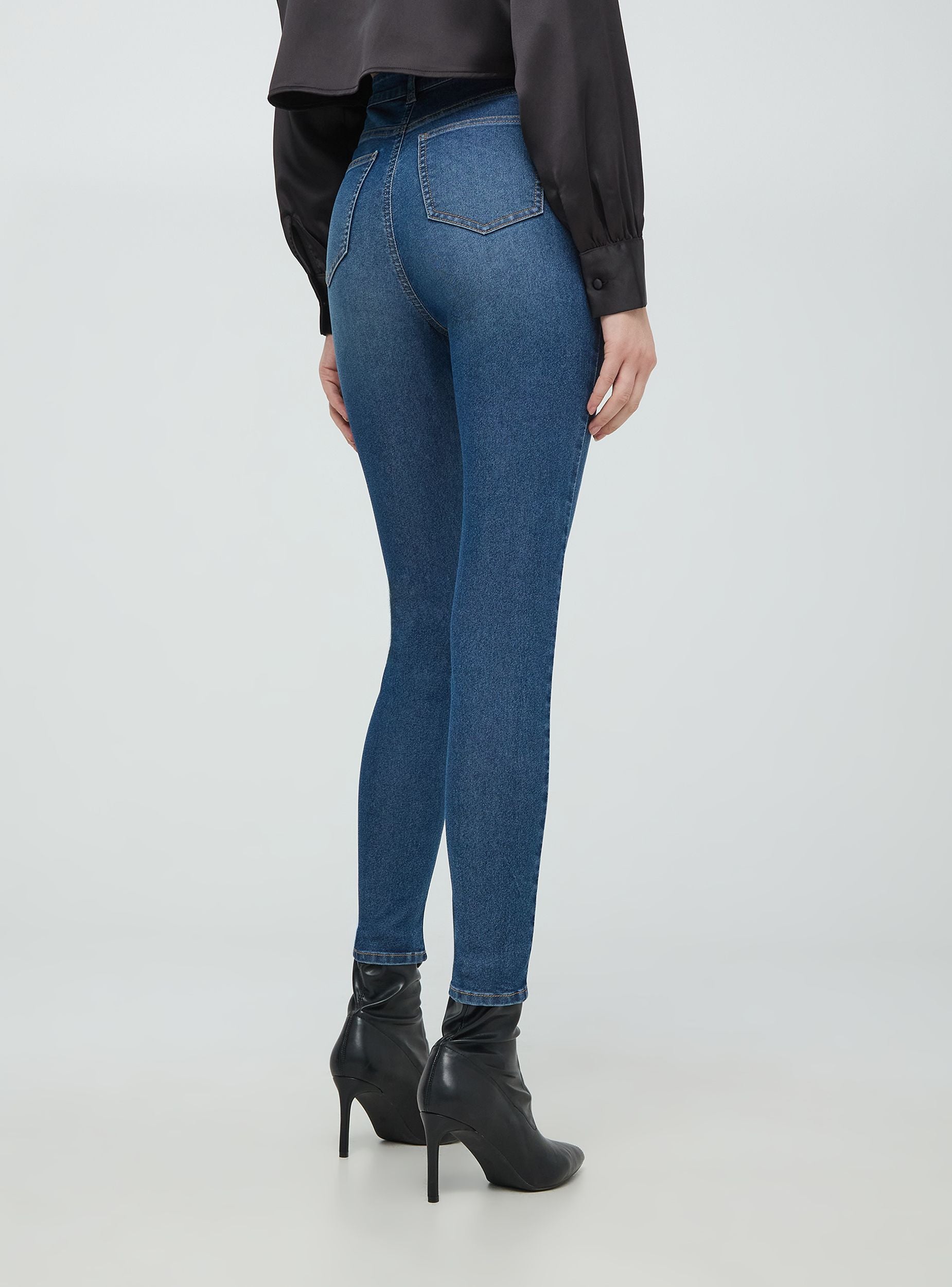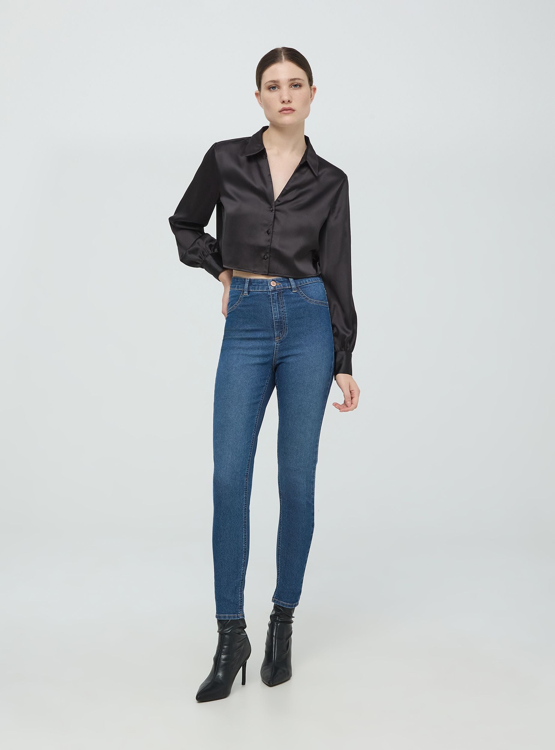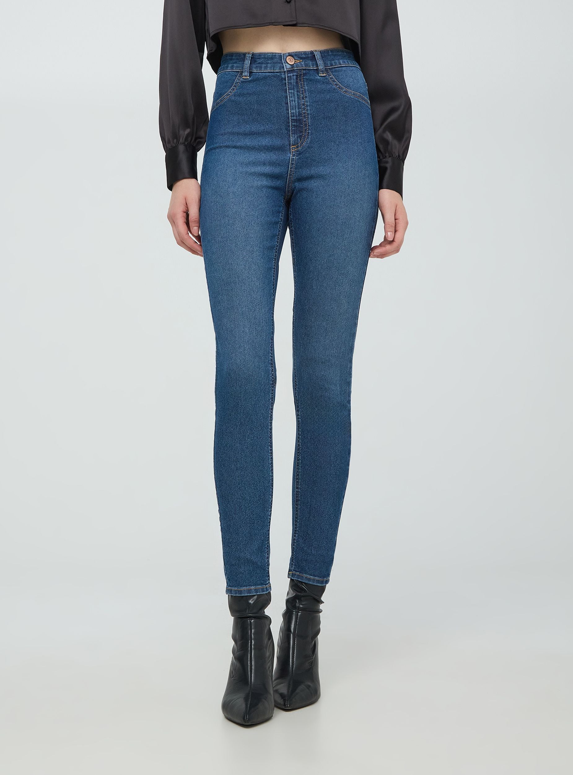 Ženske skinny jeggings pantalone sa visokim strukom koje kombinuju stil teksasa i udobnost tajica. Napravljene od elastičnog materijala koji osigurava usko i udobno pristajanje. Opremljene su omčama za kaiš i kopčanjem sa rajsferšlusom i dugmetom, nudeći elegantnu siluetu i naglašavajući figuru. Jeggings uključuju lažne prednje džepove za čist izgled i dva funkcionalna zadnja džepa za praktičnost. Idealne za kombinovanje sa casual ili elegantnim topovima, ove jeggings pantalone su savršene za kreiranje outfita kako za dan, tako i za veče.Detalji