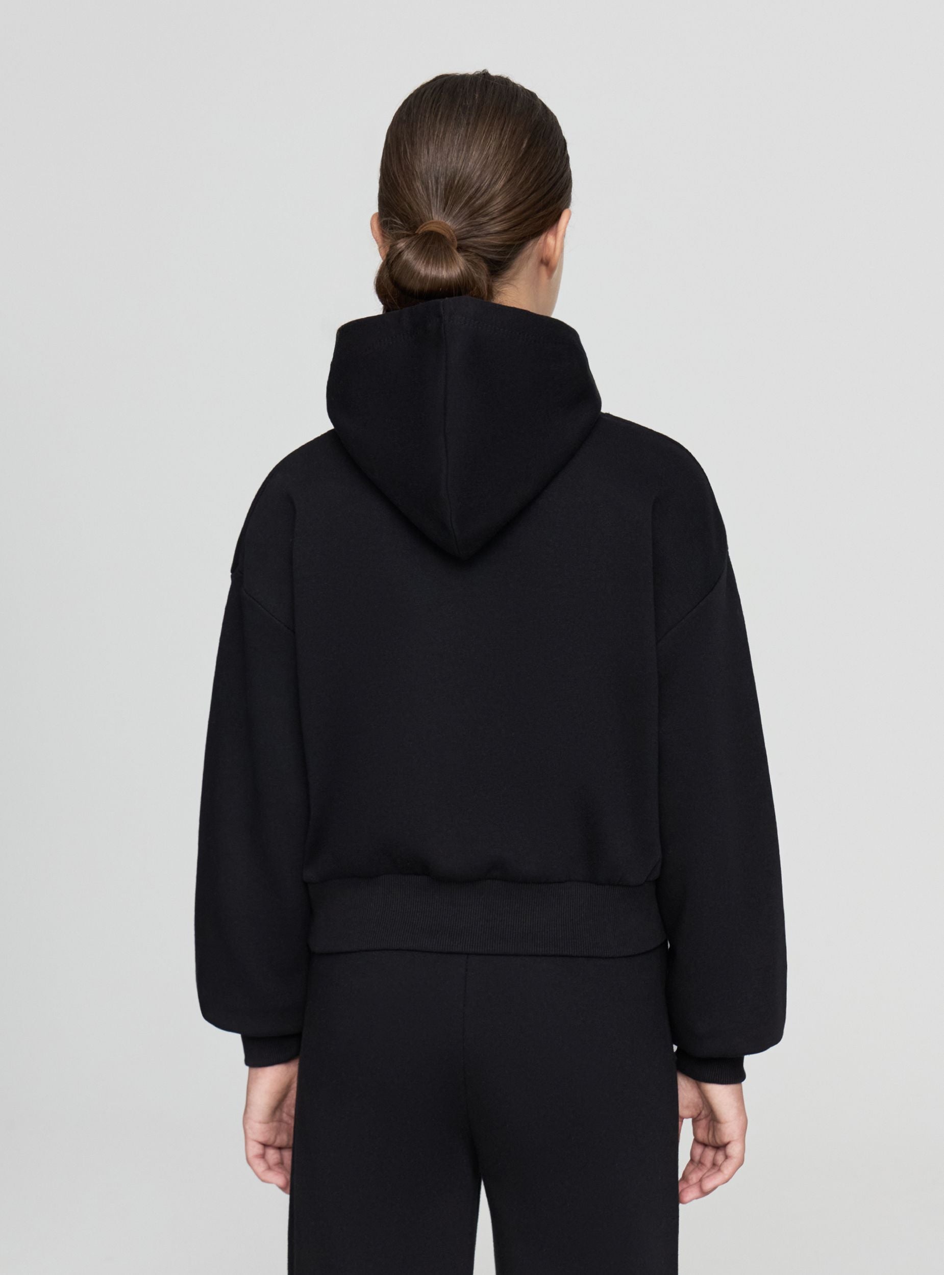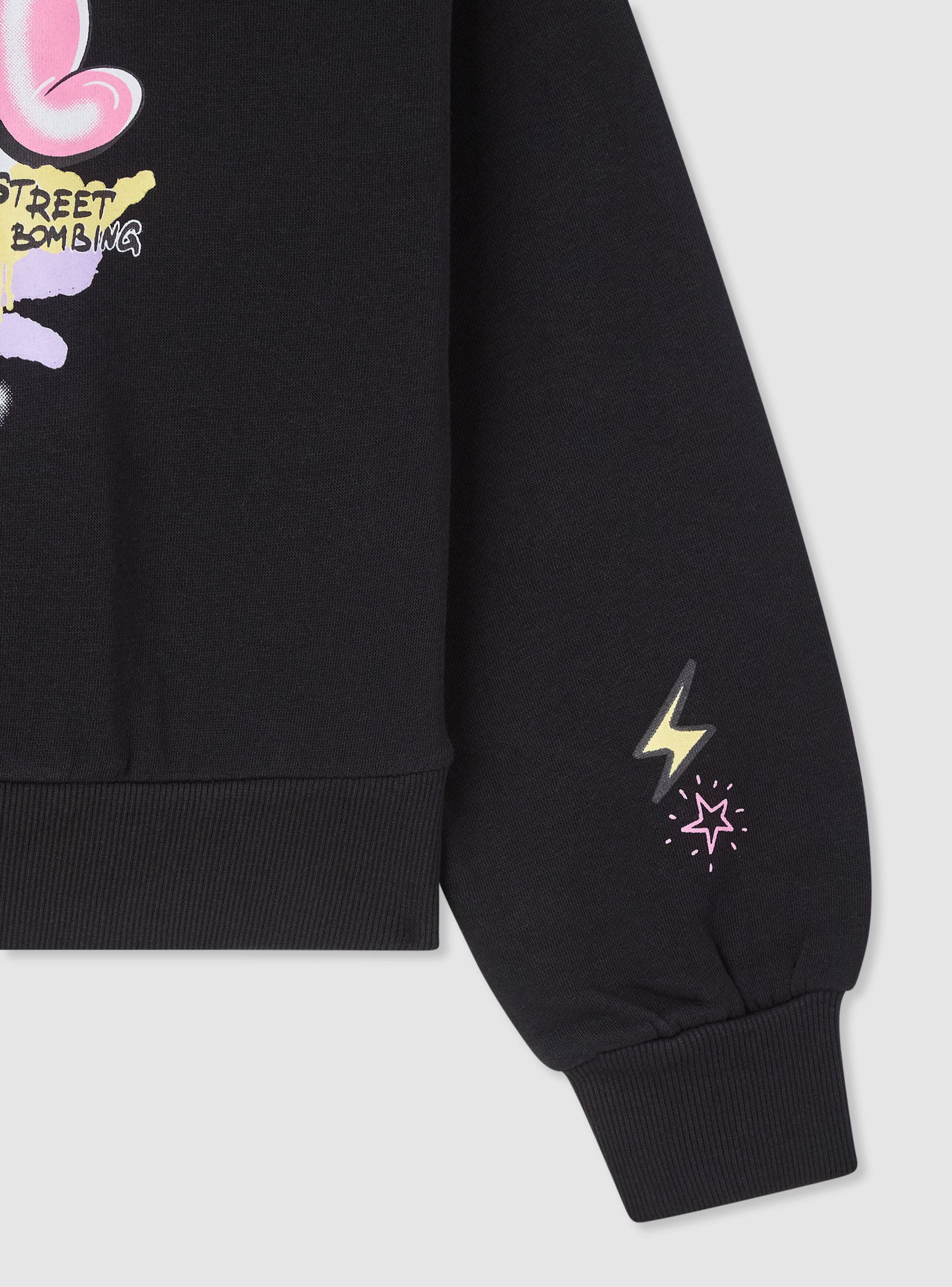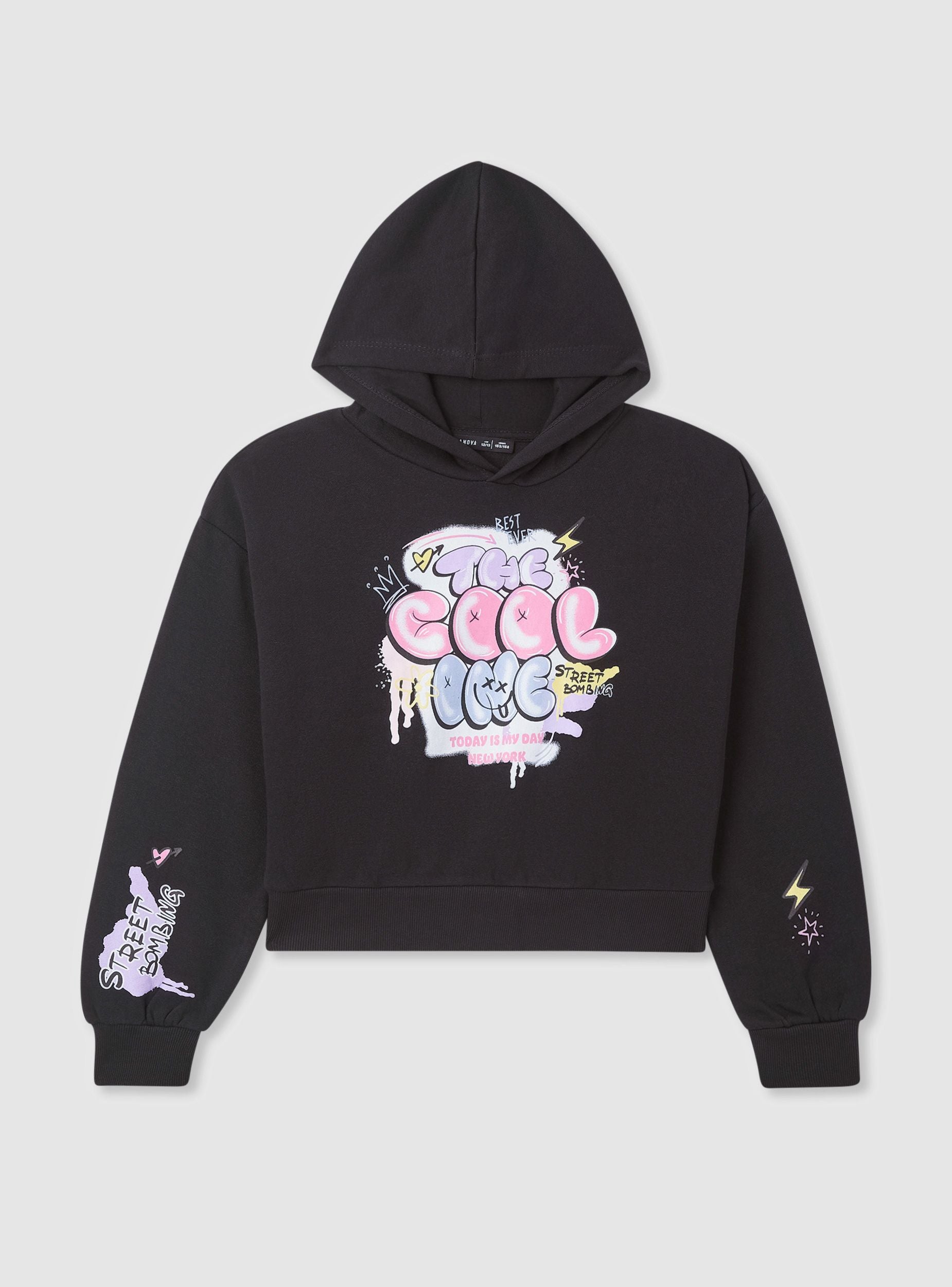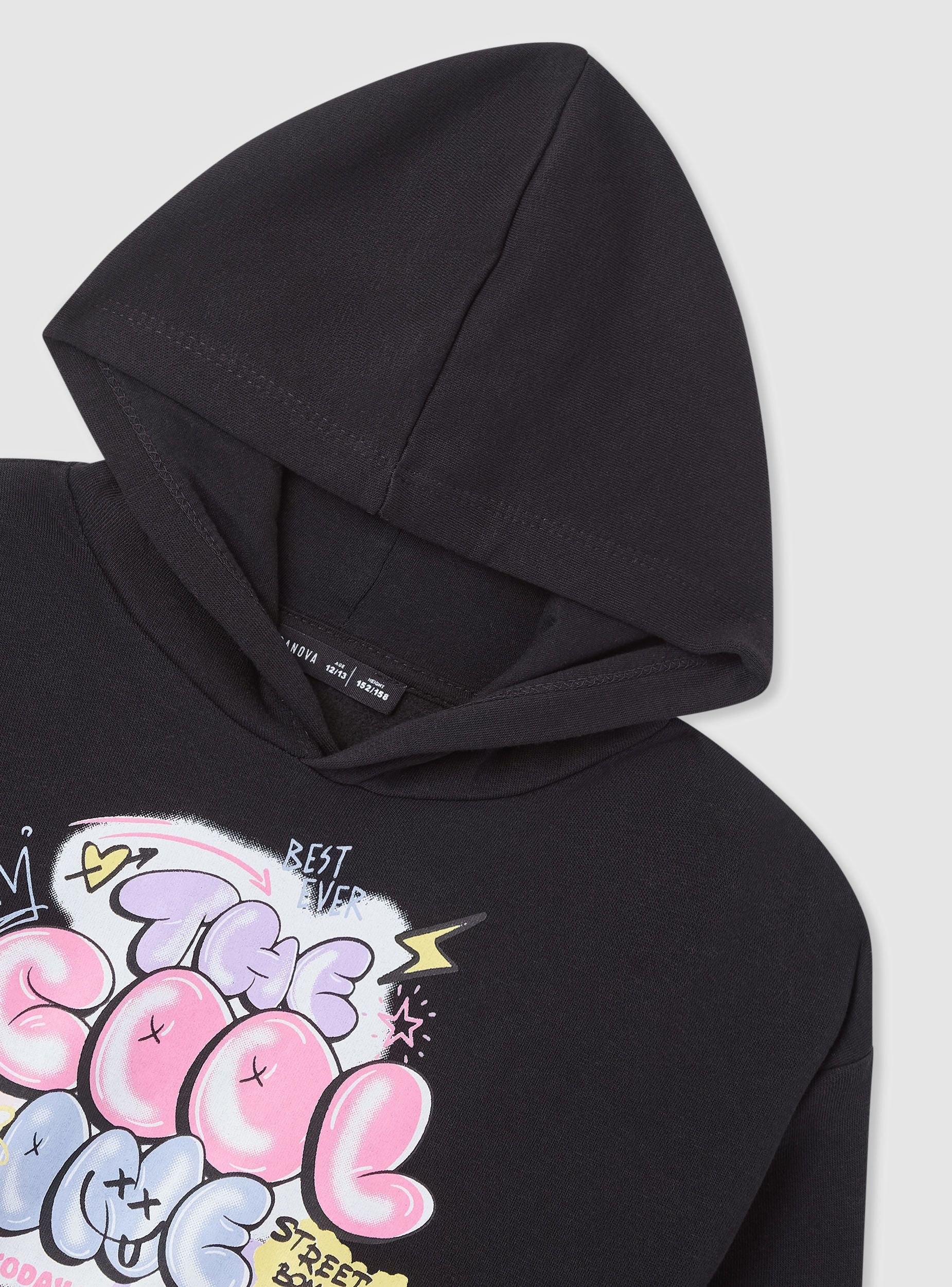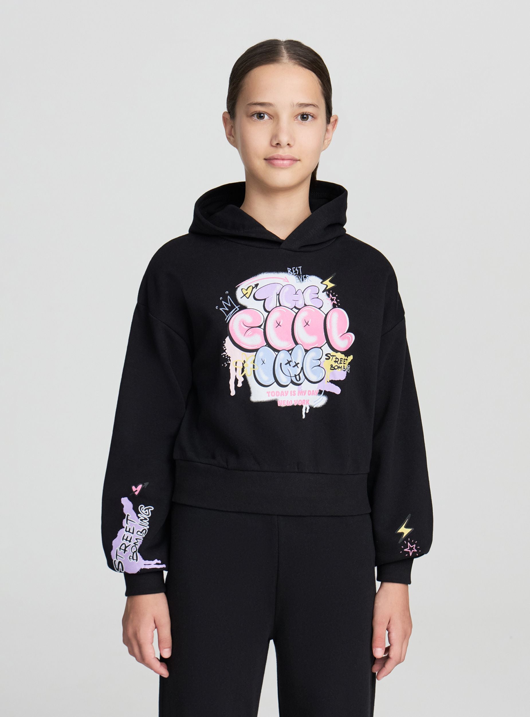 Teža dečija dukserica sa kapuljačom, idealna za ležeran i moderan izgled. Ima upečatljiv grafiti print sprijeda i grafičke detalje na rukavima. Skraćeni kroj je savršen za kombinovanje sa farmerkama ili pantalonama visokog struka. Višenamenski i udoban komad, pogodan za slobodno vreme i neformalne dane.