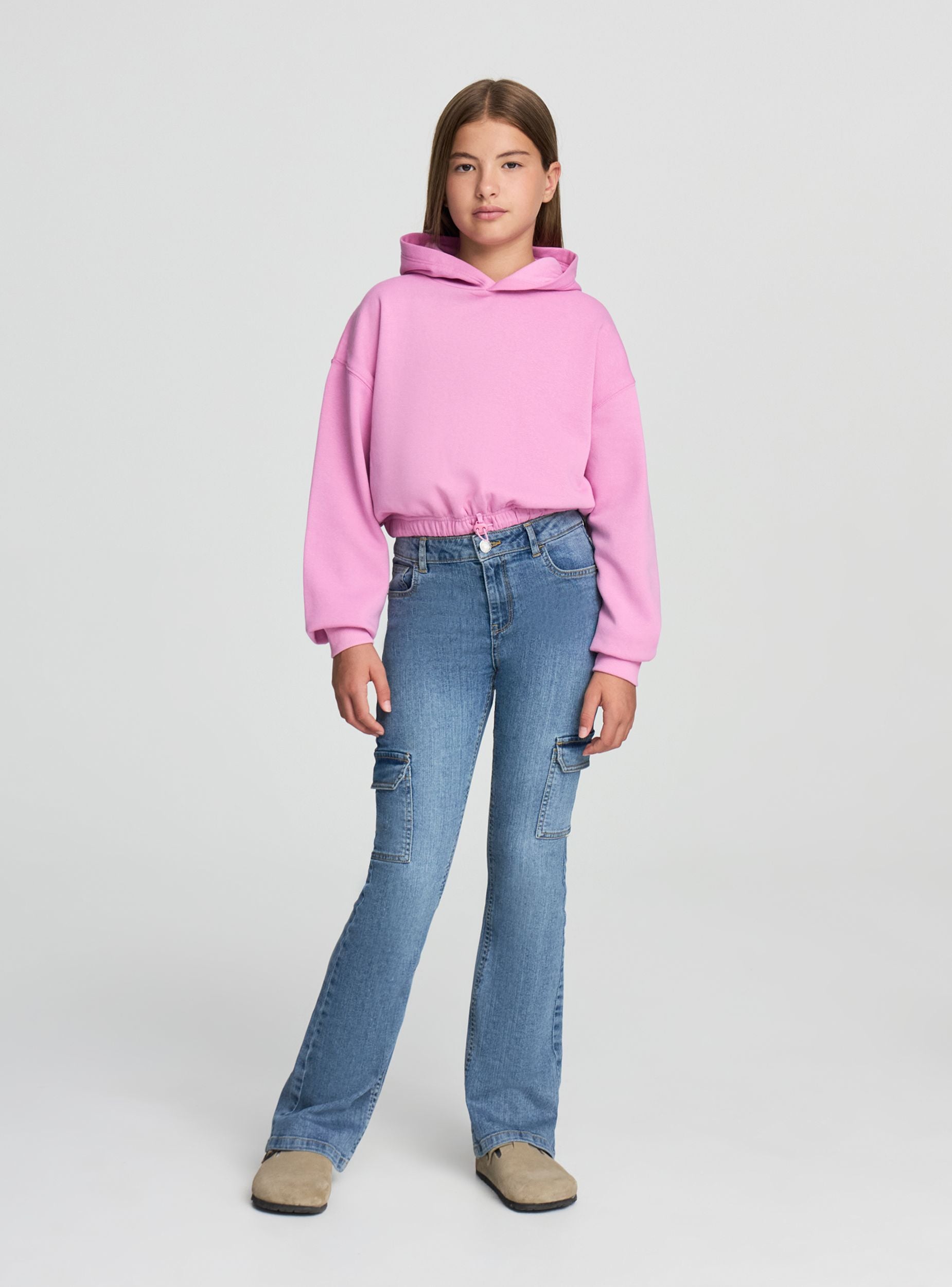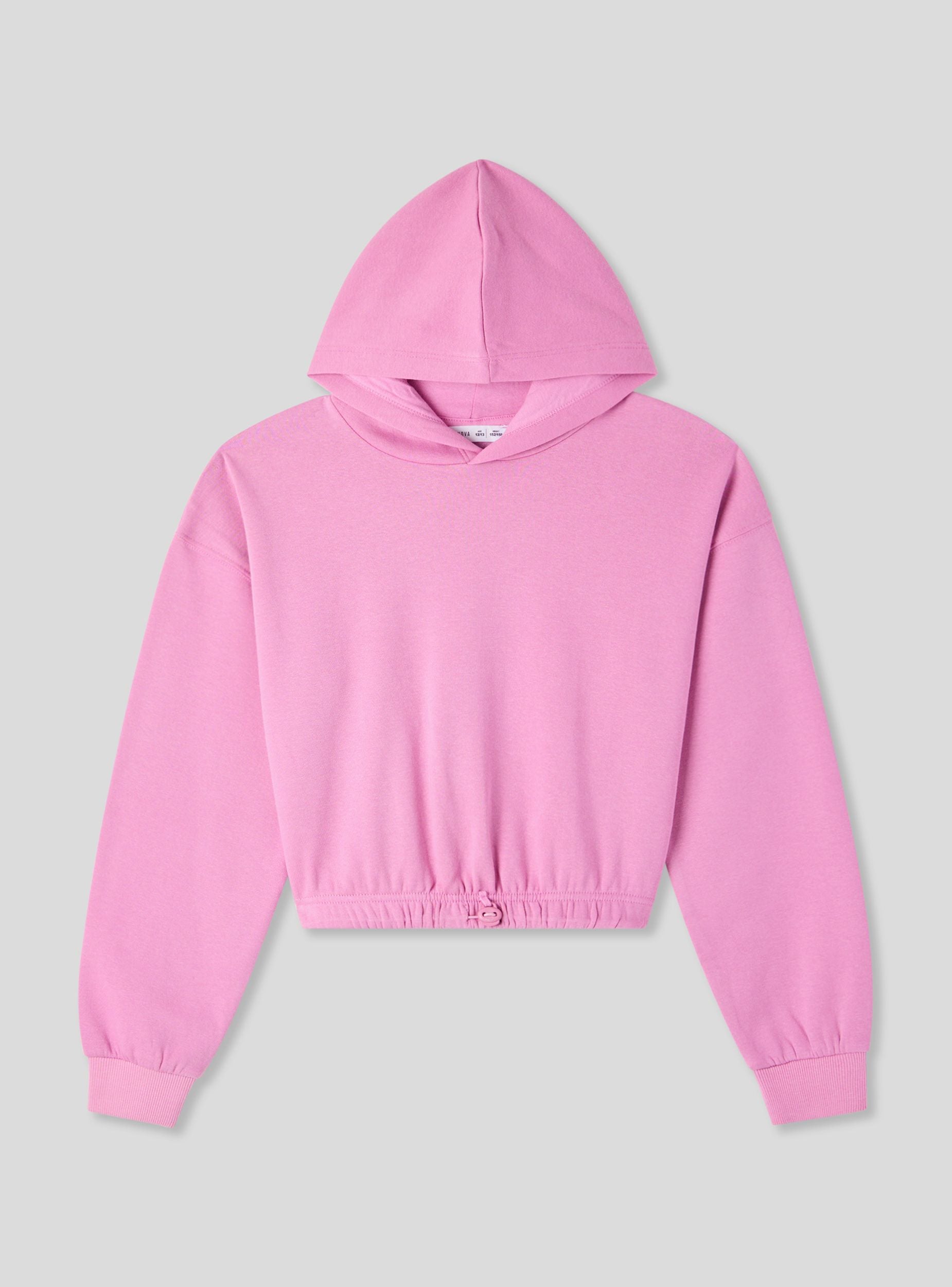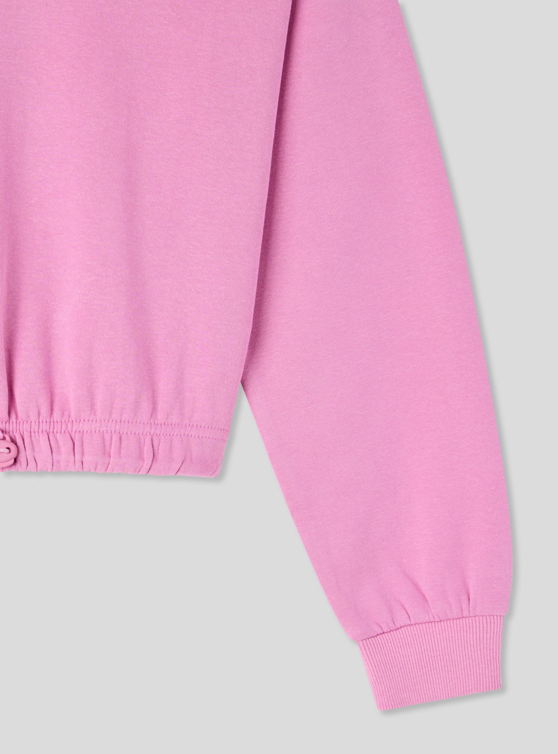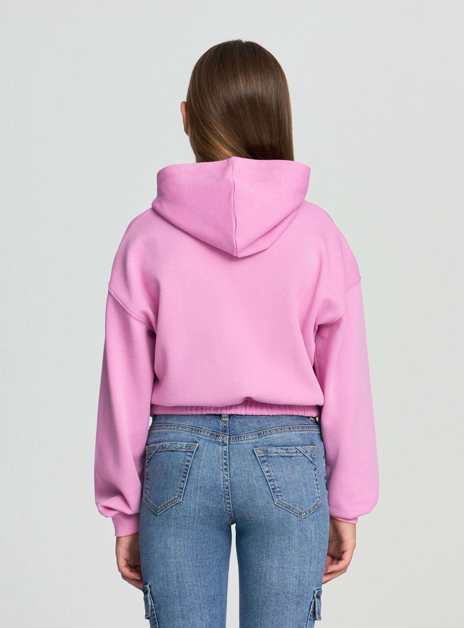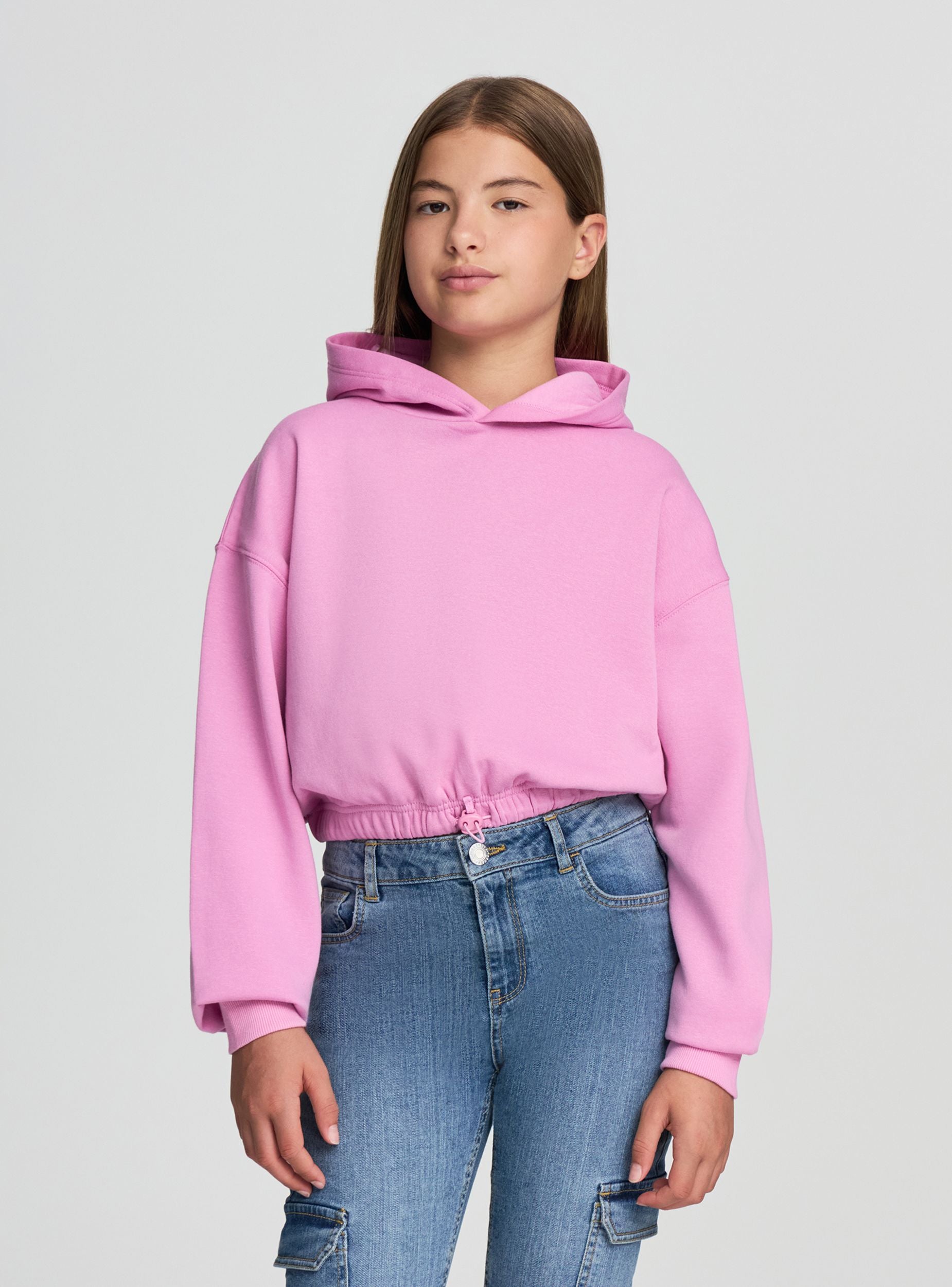 Džemper za devojčice sa kapuljačom, idealan za ležeran i svestran izgled. Krojena verzija naglašava siluetu i lako se kombinuje sa farmerkama ili sportskim pantalonama. Ima duge rukave, donji deo sa podesivom vezicom i elastične manžetne za udobno nošenje. Savršena za slobodno vreme i svakodnevne aktivnosti, donosi modernu i praktičnu notu u odeću.