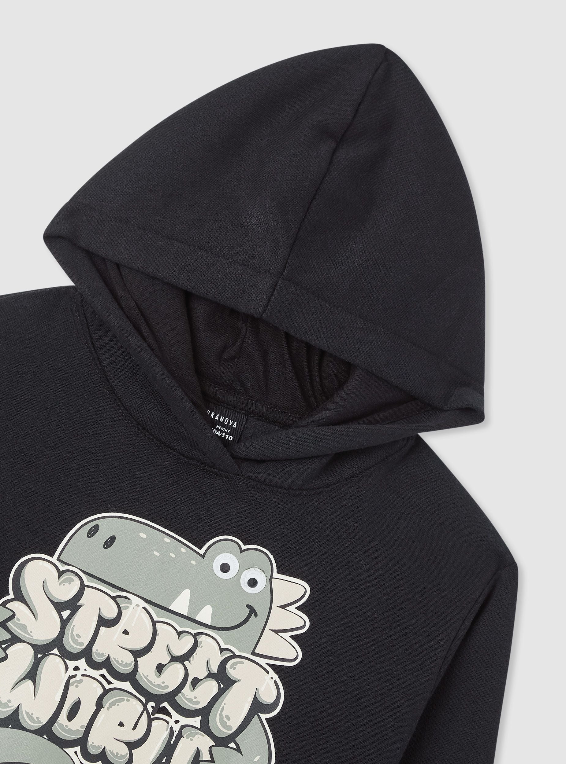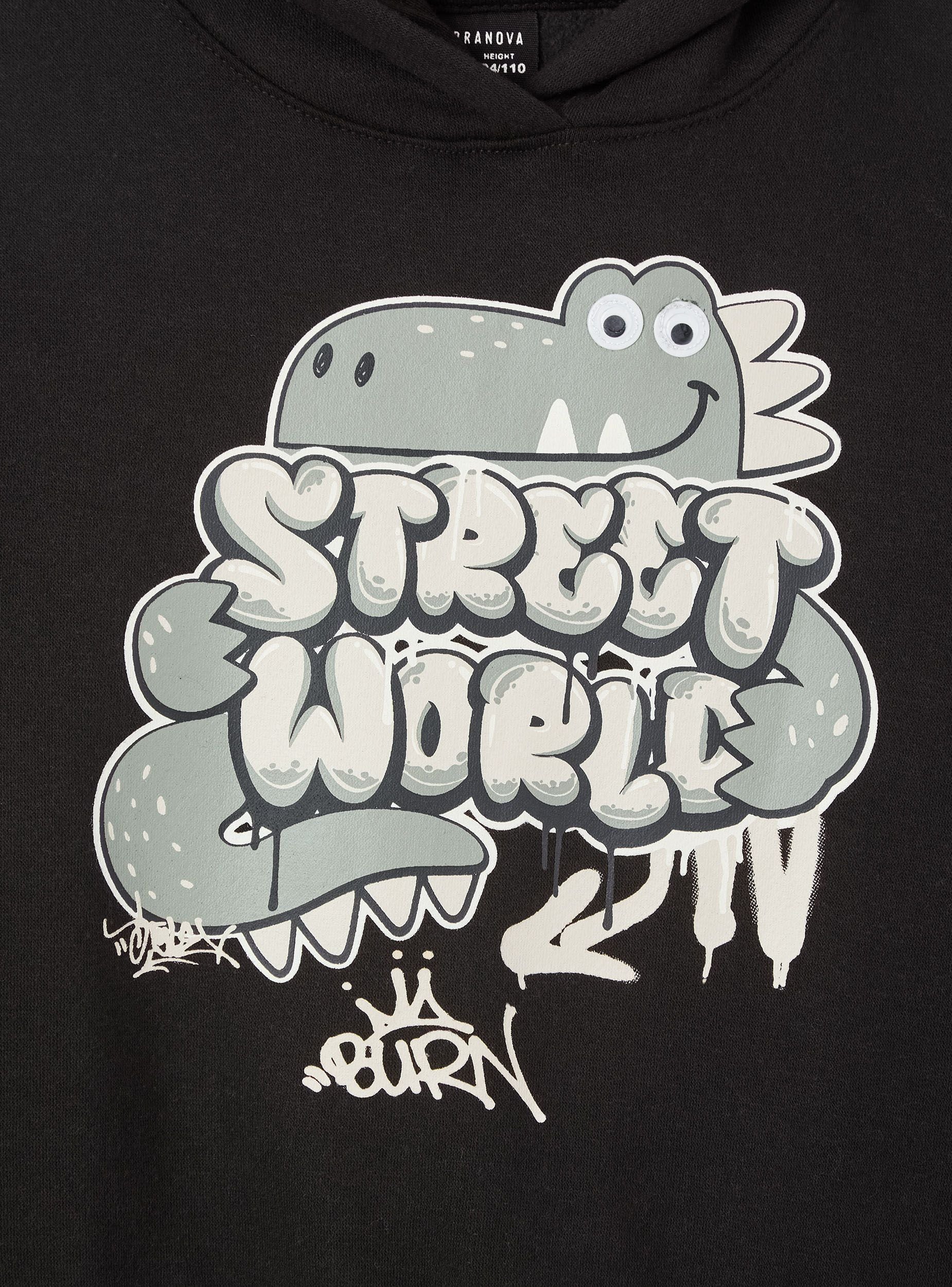 Teža dečija dukserica sa kapuljačom, idealna za ležeran i moderan izgled. Ima upečatljiv grafički print sprijeda, u stilu grafita, savršen za dodavanje daška originalnosti svakodnevnim odevnim kombinacijama. Udoban kroj i dizajn sa kapuljačom čine je pogodnom za sveže dane ili aktivnosti na otvorenom. Lako se kombinuje sa farmerkama ili sportskim pantalonama za svestran i praktičan izgled.Detalji