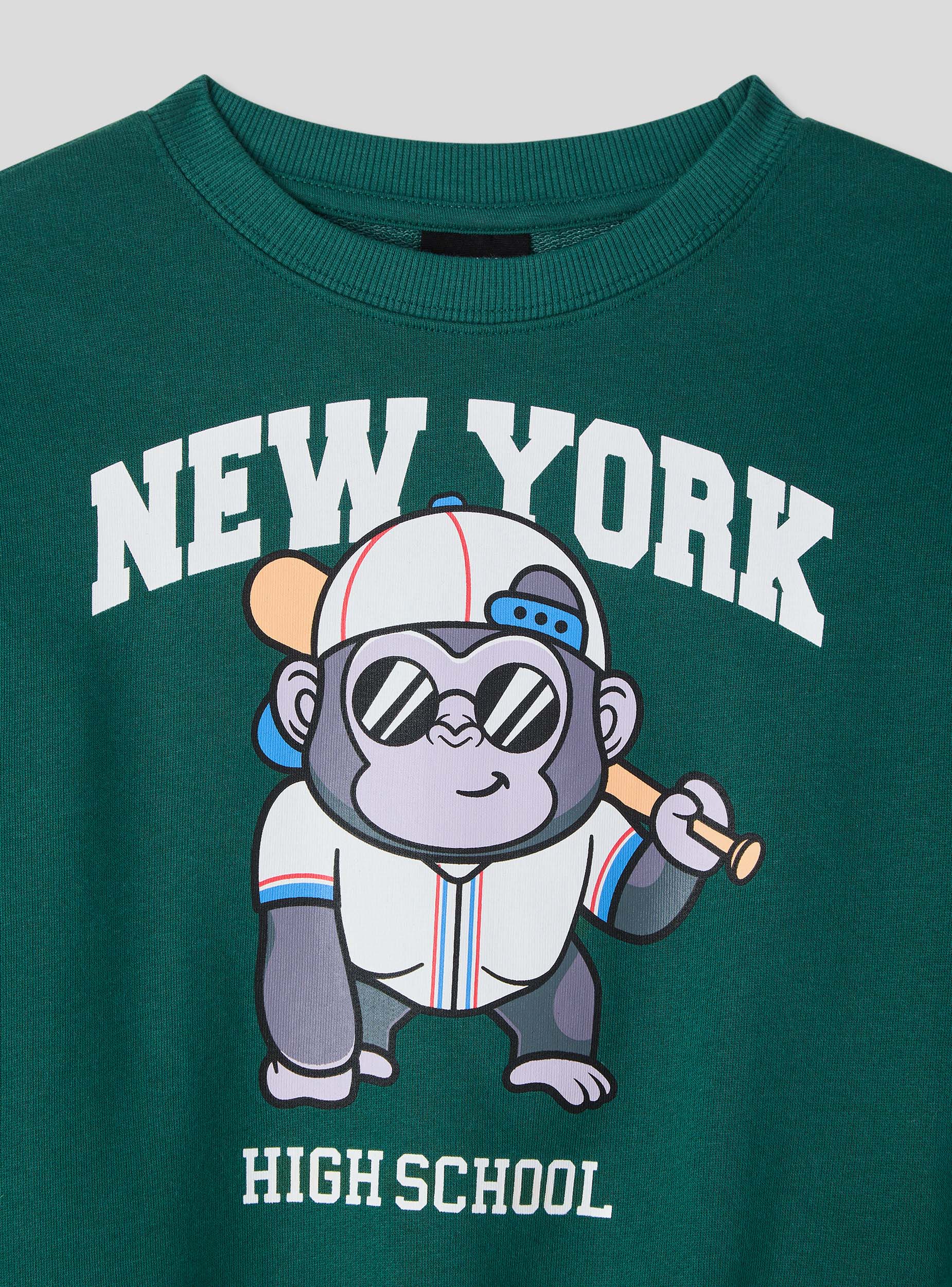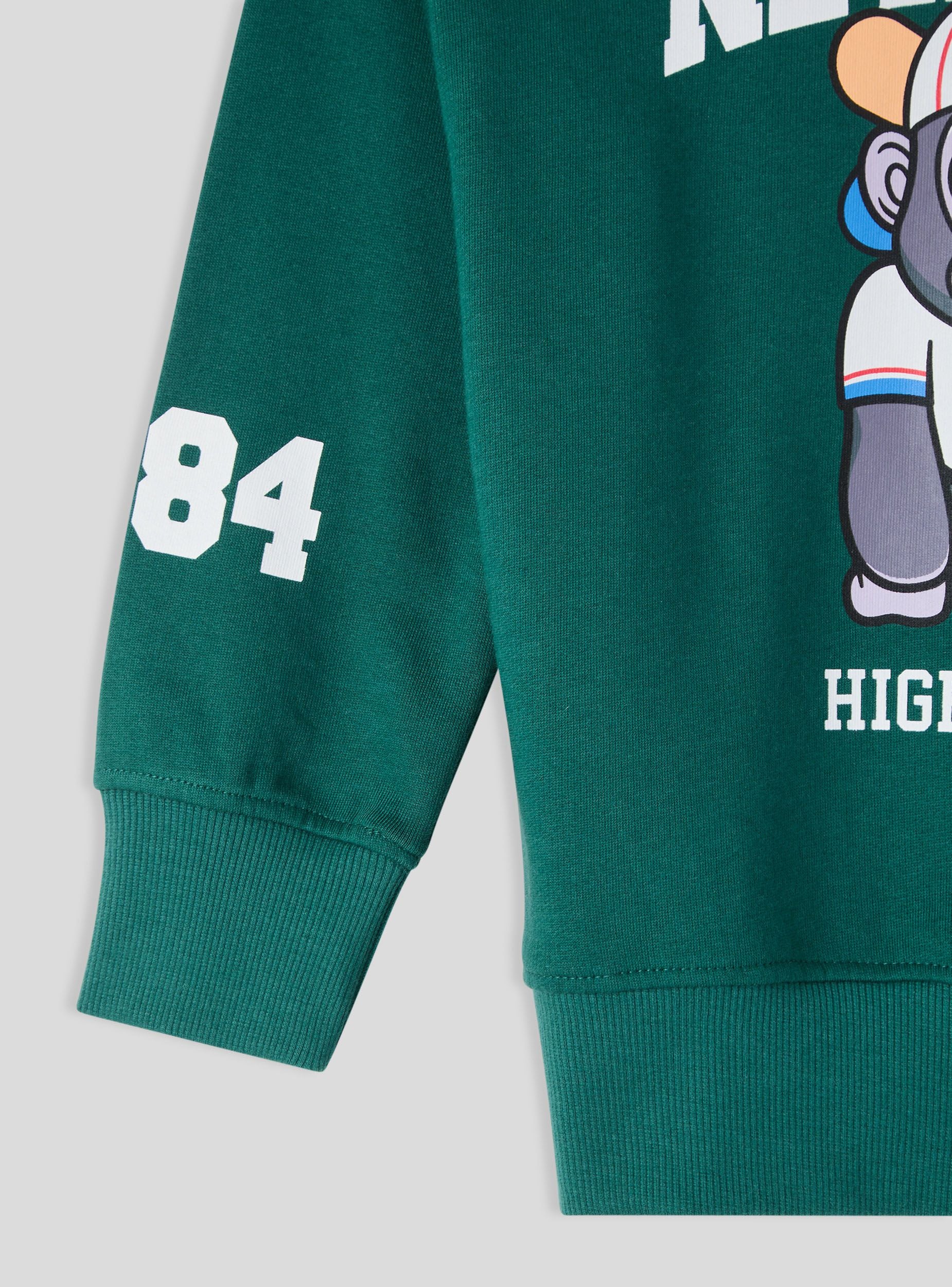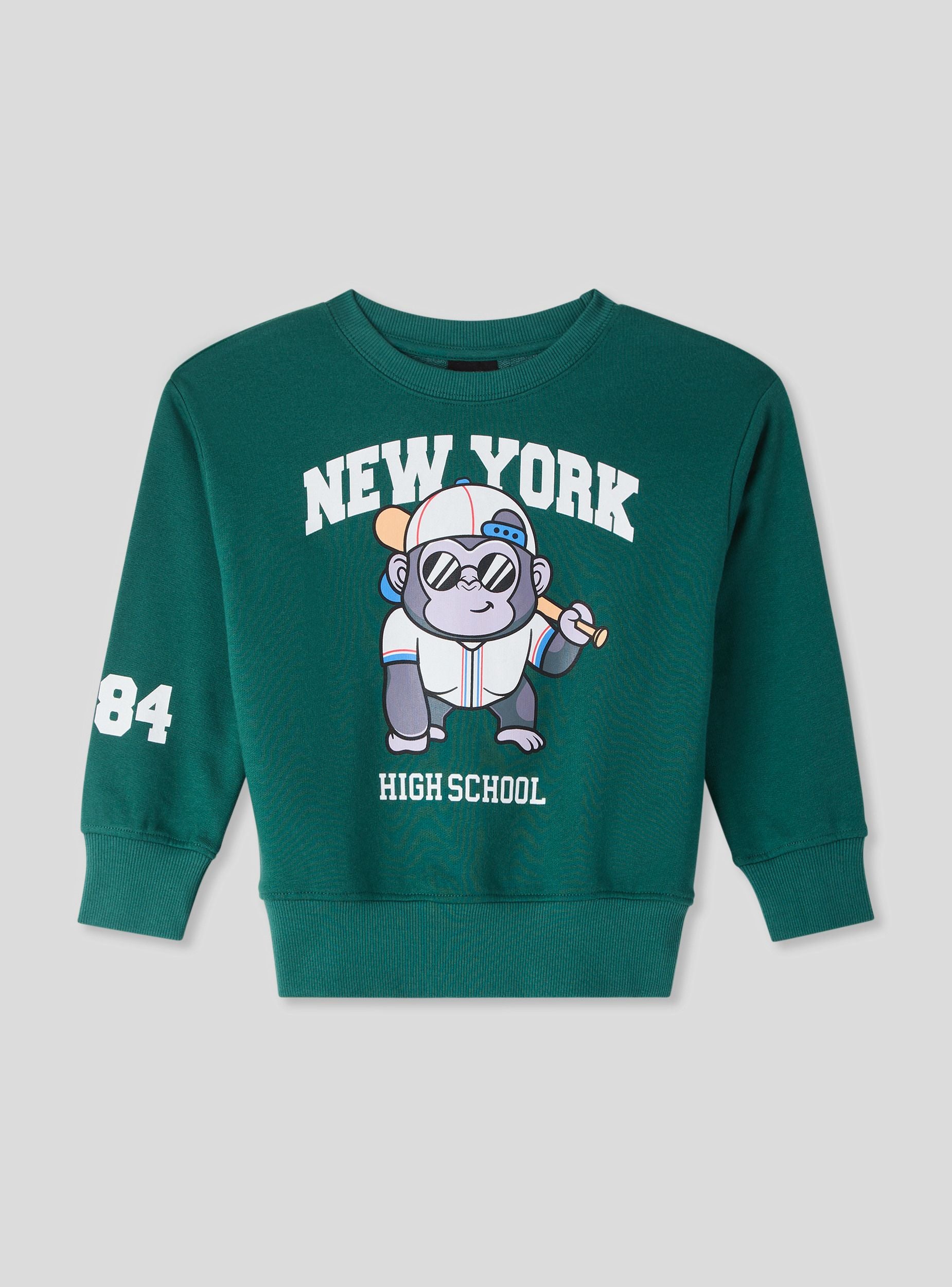 Dečija dukserica sa dugim rukavima i živopisnim printom. Ima privlačan dizajn sa stilizovanom majmunom i dekorativnim natpisima, idealna za ležeran i zabavan izgled. Savršena za slobodno vreme i dane za igru, lako se kombinuje sa farmerkama ili sportskim pantalonama. Udoban kroj i detalji koji privlače pažnju, čineći je svestranim komadom za svaku priliku.Detalji