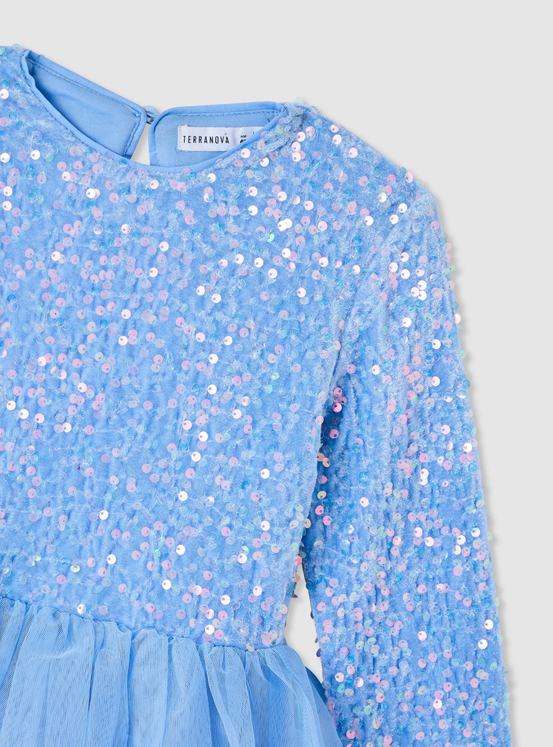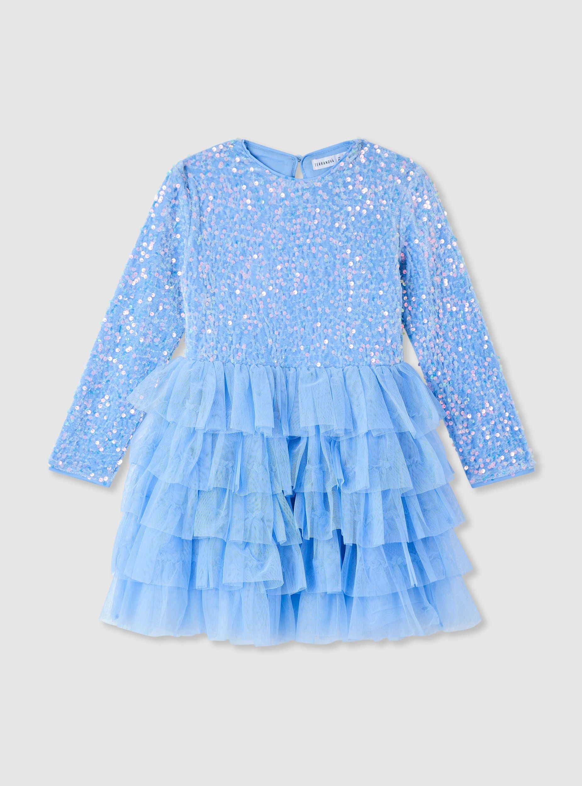 Elegantna haljina za devojčice savršena za ceremonije ili posebne prilike. Gornji deo sa dugim rukavima je potpuno prekriven sjajnim šljokicama, dok je suknja sastavljena od volana od tila koji dodaju pokret i volumen izgledu. Rafinirani dizajn se završava dugmetom na leđima koje olakšava oblačenje. Deo osmišljen da svaka devojčica oseća kao zvezda sa jedinstvenim i sjajnim stilom.