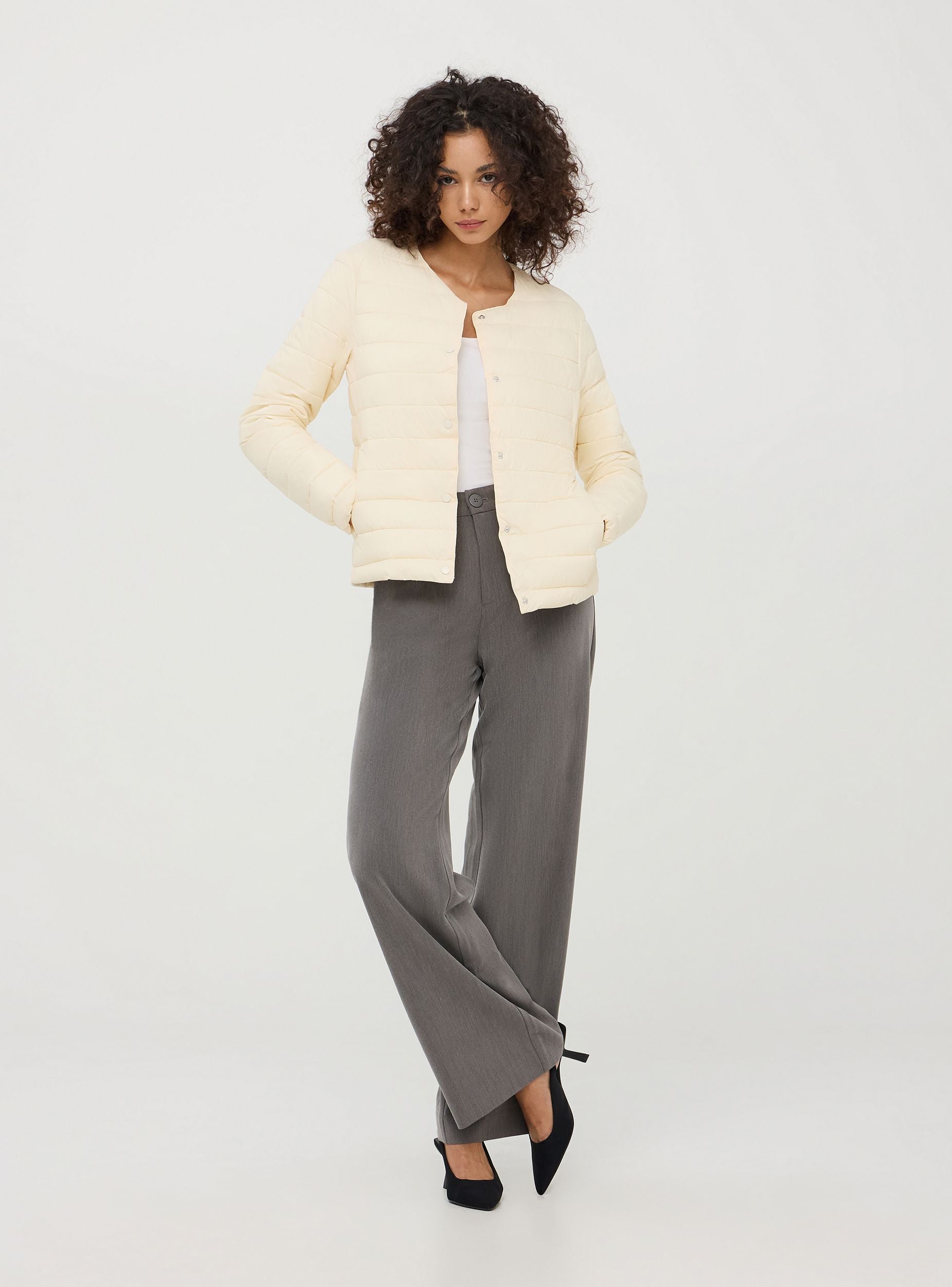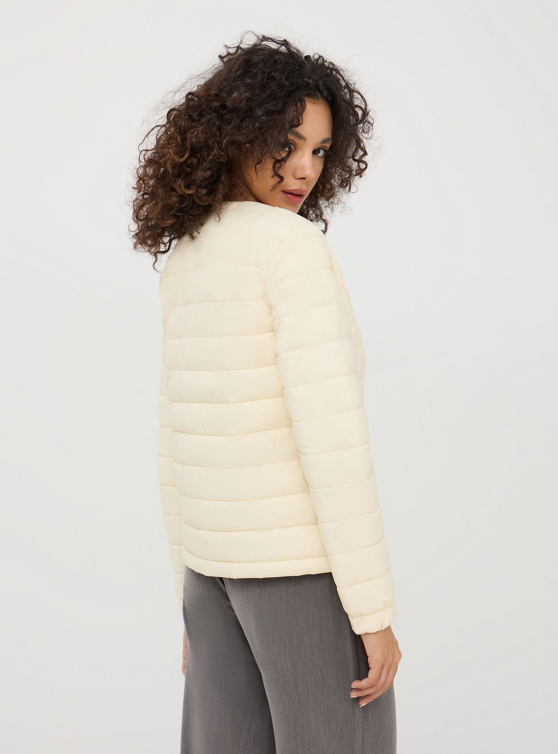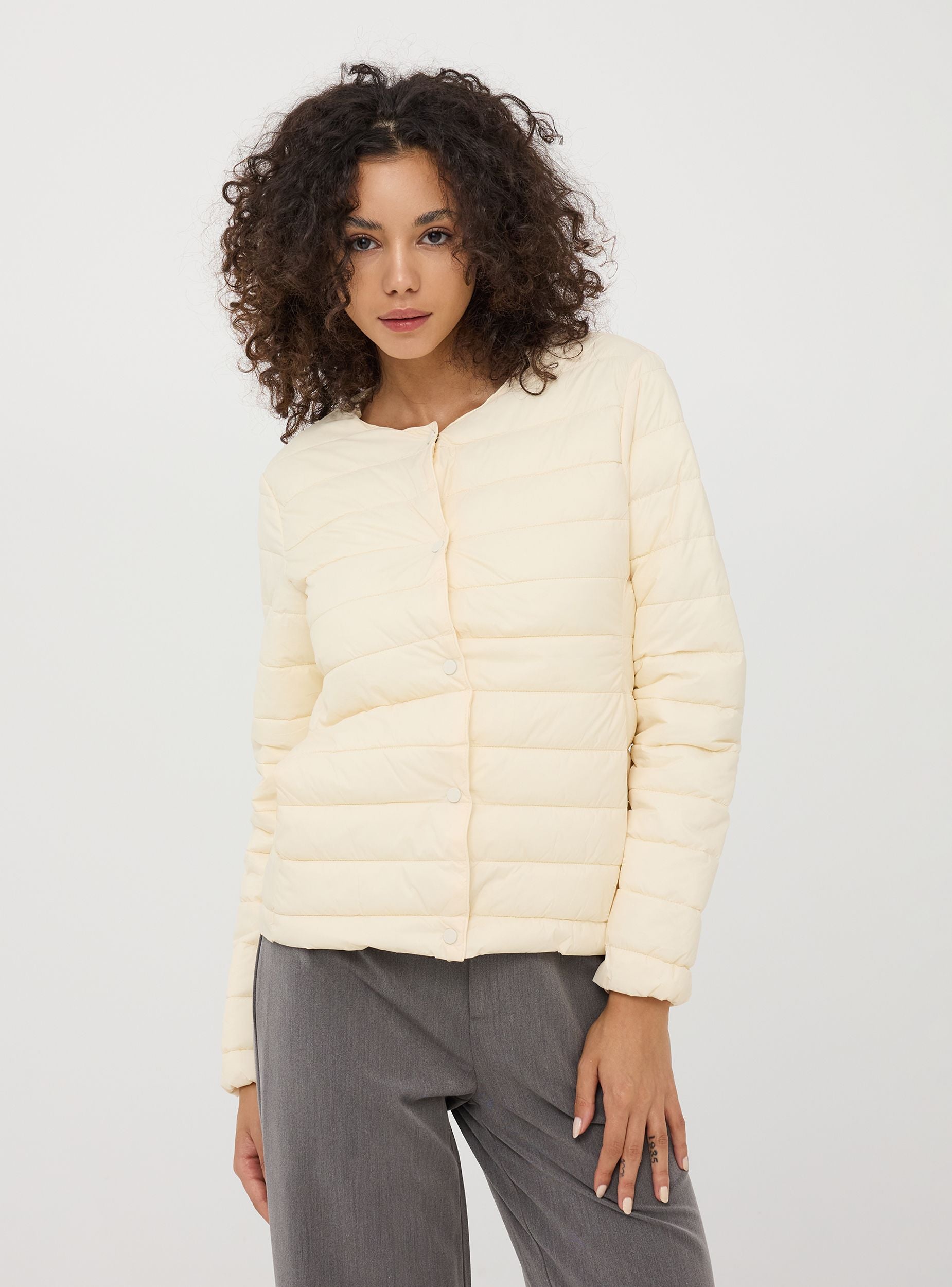 Ženski jakna od najlona u jednobojnoj boji sa laganom podstavom. Savršena za prelazne sezone ili ispod kaputa u hladnijim mesecima. Model sa okruglim izrezom pruža čist i savremen izgled, lako se kombinuje sa košuljama, džemperima ili topovima za svestran i šik outfit. Prednji dugmići na pritisak, u istoj boji, obezbeđuju br closure i praktičnost, dajući minimalistički i rafiniran izgled. Bočne džepove sa filetom su savršeni za odlaganje malih osnovnih stvari, održavajući linije jakne čistim i modernim. Regular fit.Detalji
