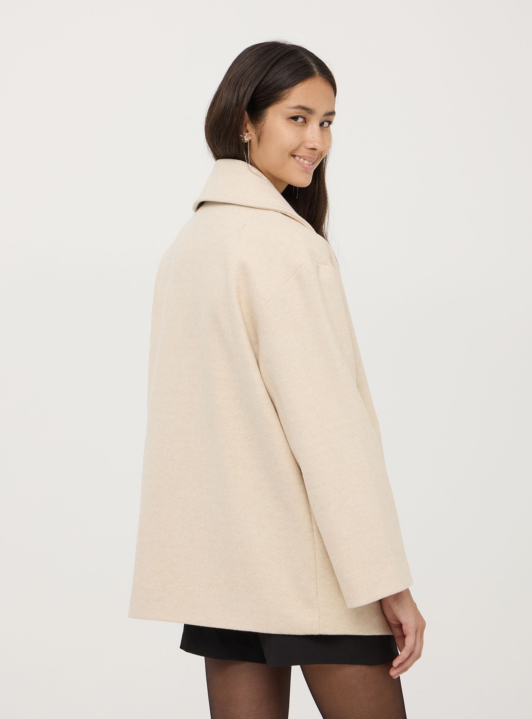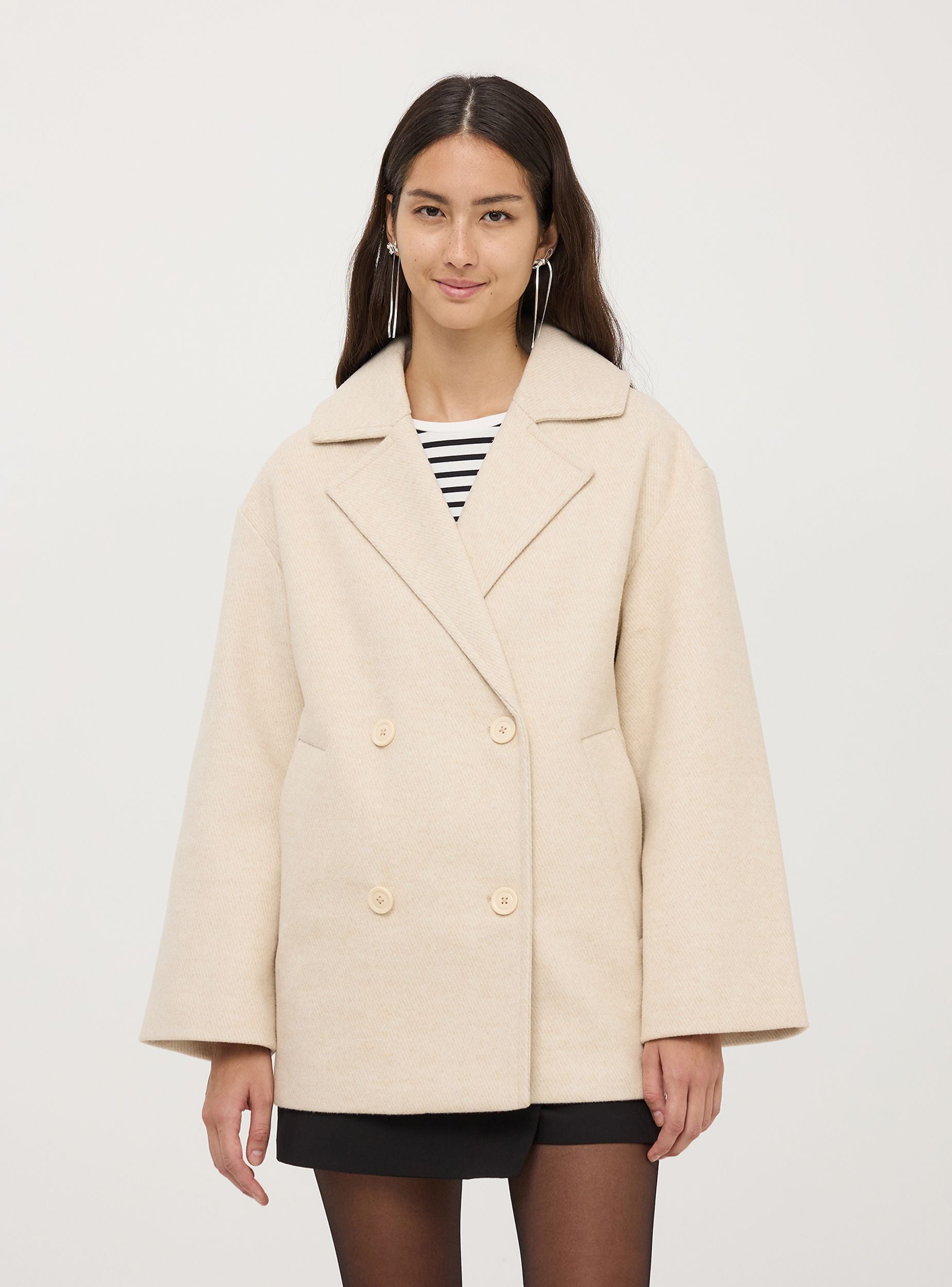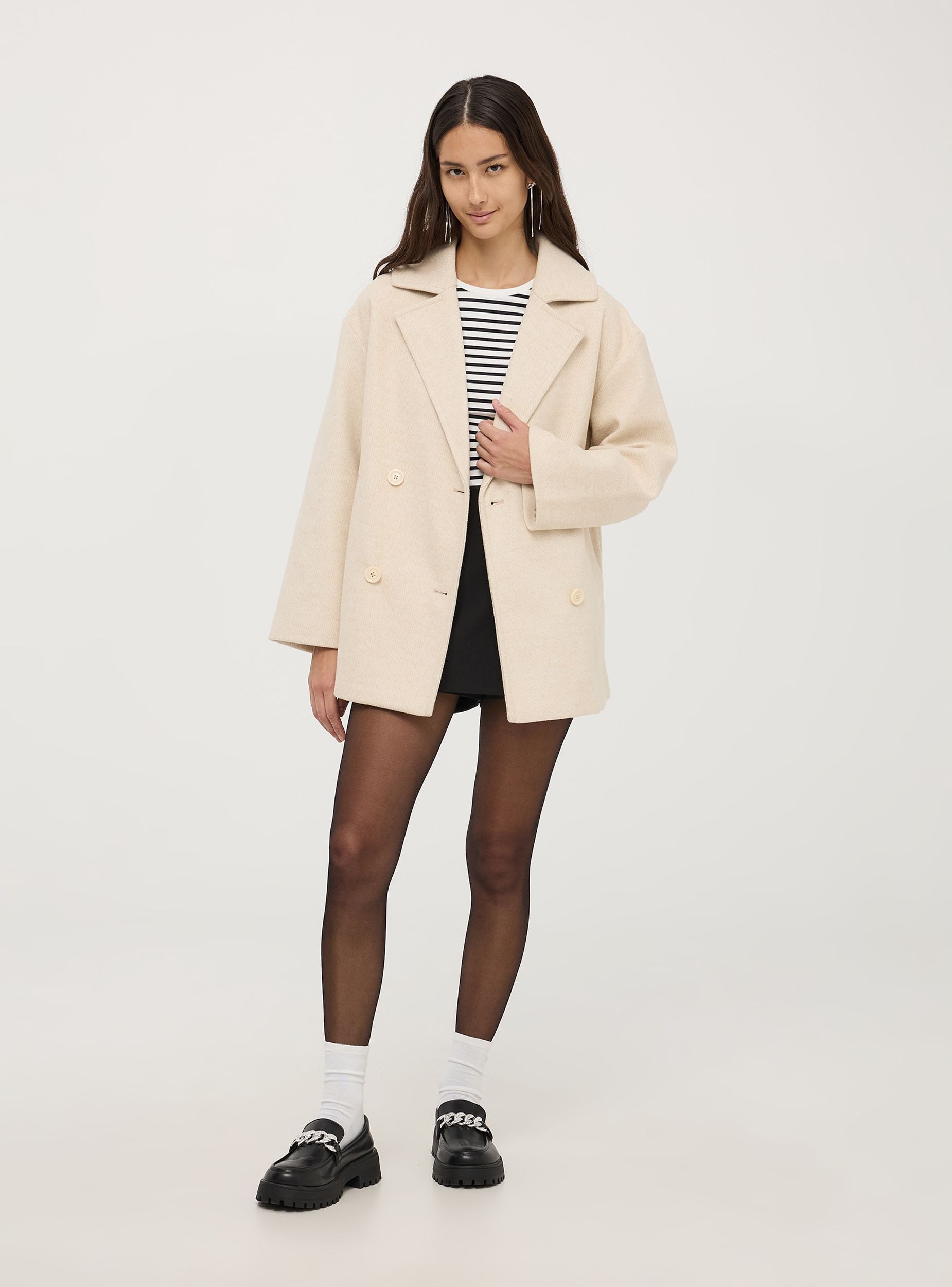 Ženski kaput, model kaban, sa dvostrukim kopčanjem i tkaninom u twill teksturi sa karakterističnim dijagonalnim uzorkom. Model sa unutrašnjom podstavom, kragnom sa reverima, dugim rukavima i bočnim džepovima. Tipičan dizajn kabana uključuje ravno krojenje, srednju dužinu i dvostruko dugme na prednjem delu sa velikim dugmadi. Ova jakna je savršena za rafinirani i sofisticirani izgled, kombinovana kako sa formalnim, tako i sa ležernim odevnim kombinacijama. Kaput koji morate imati za zimsku sezonu. Širok kroj.Detalji