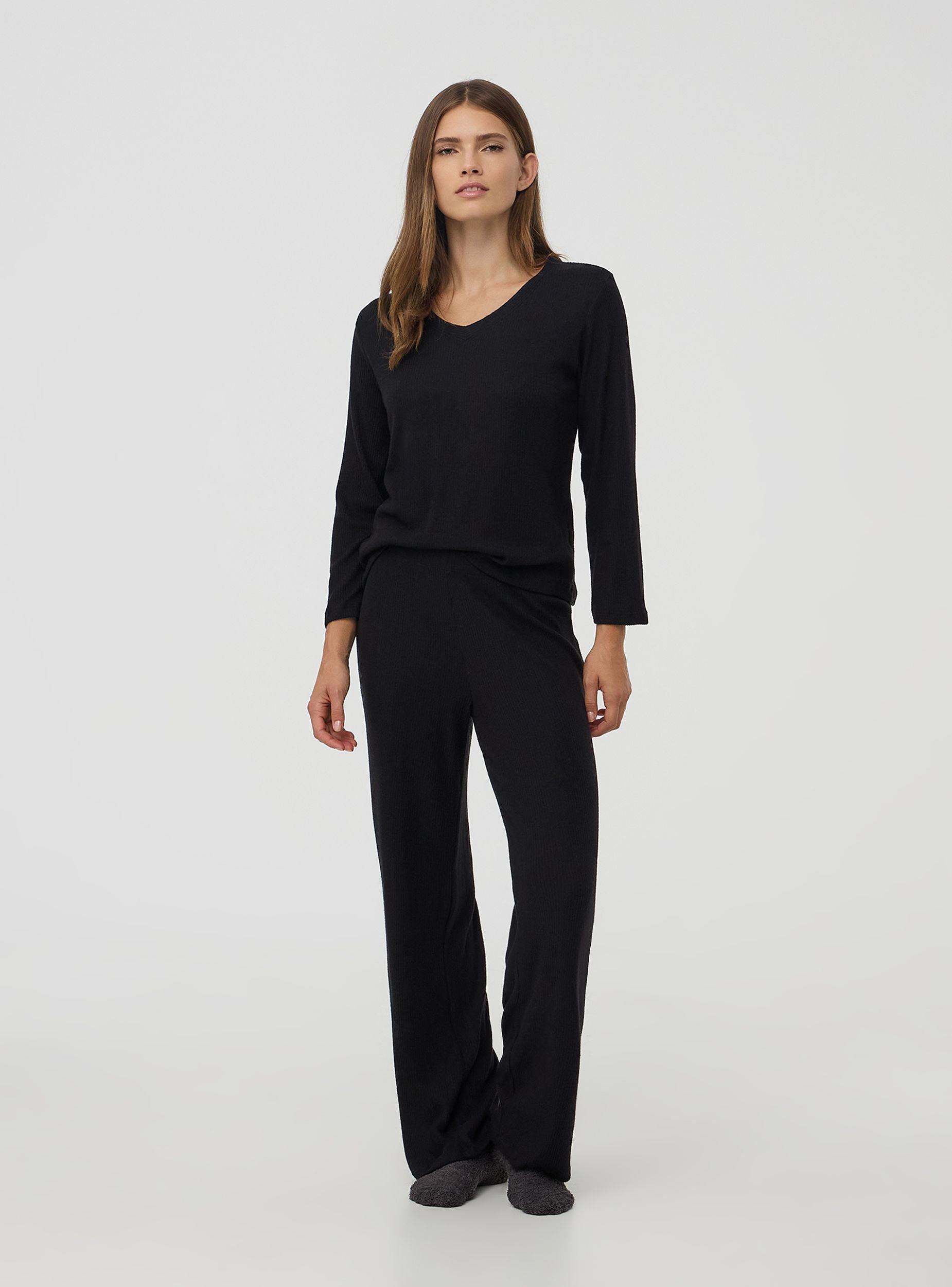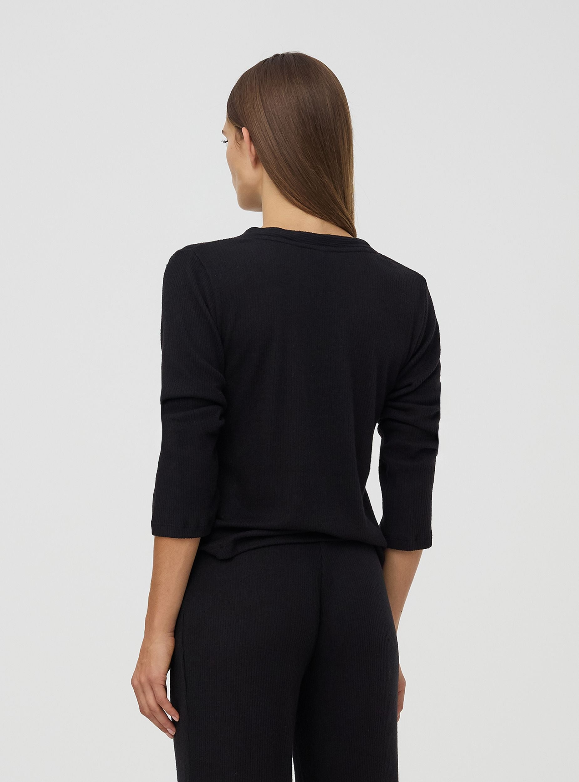 Ženska majica dugih rukava sa V izrezom. Tkanina jednobojna sa rebrastim uzorkom. Savršena za ležerne kombinacije. Regularna kroja.Detalji