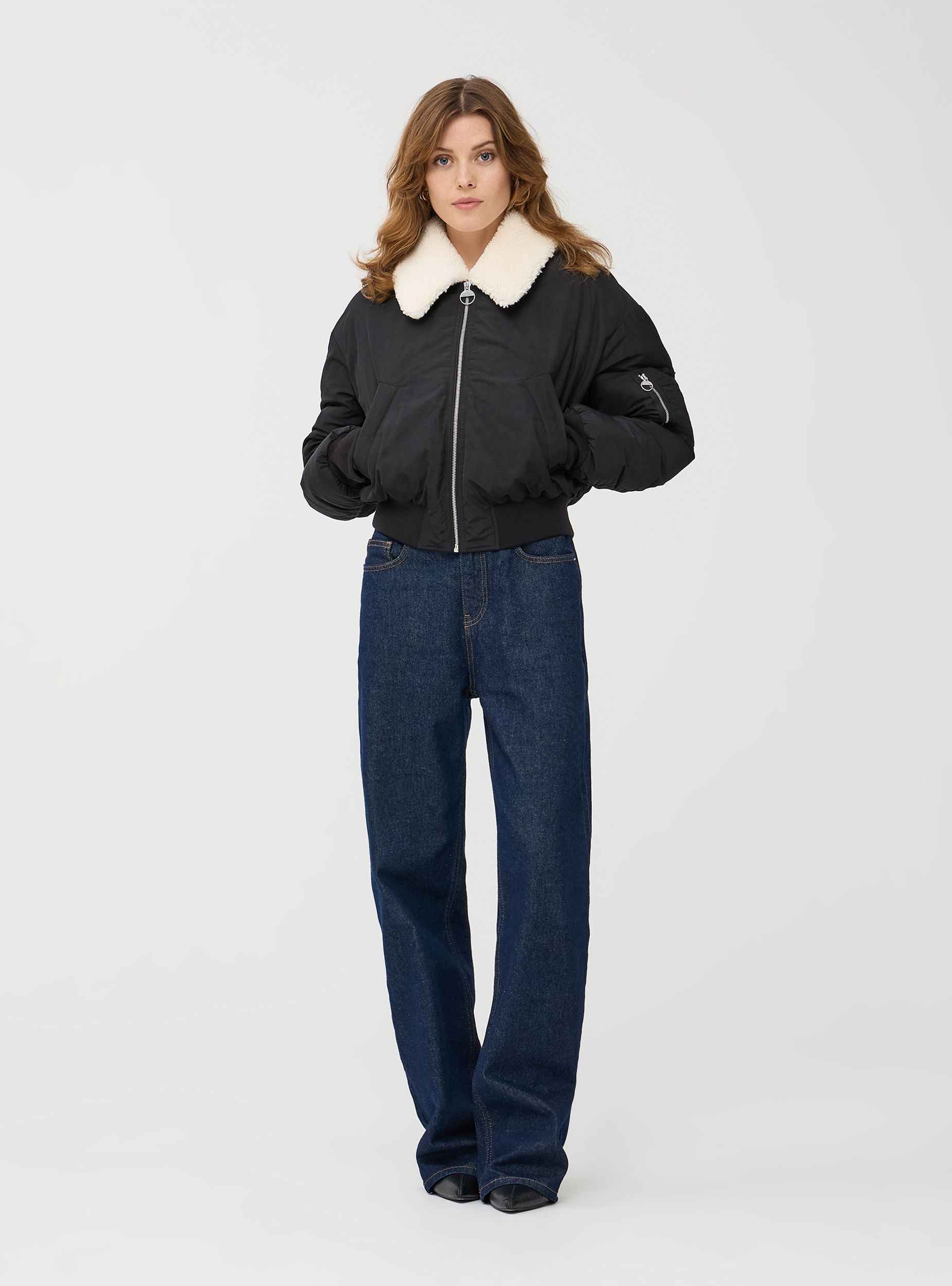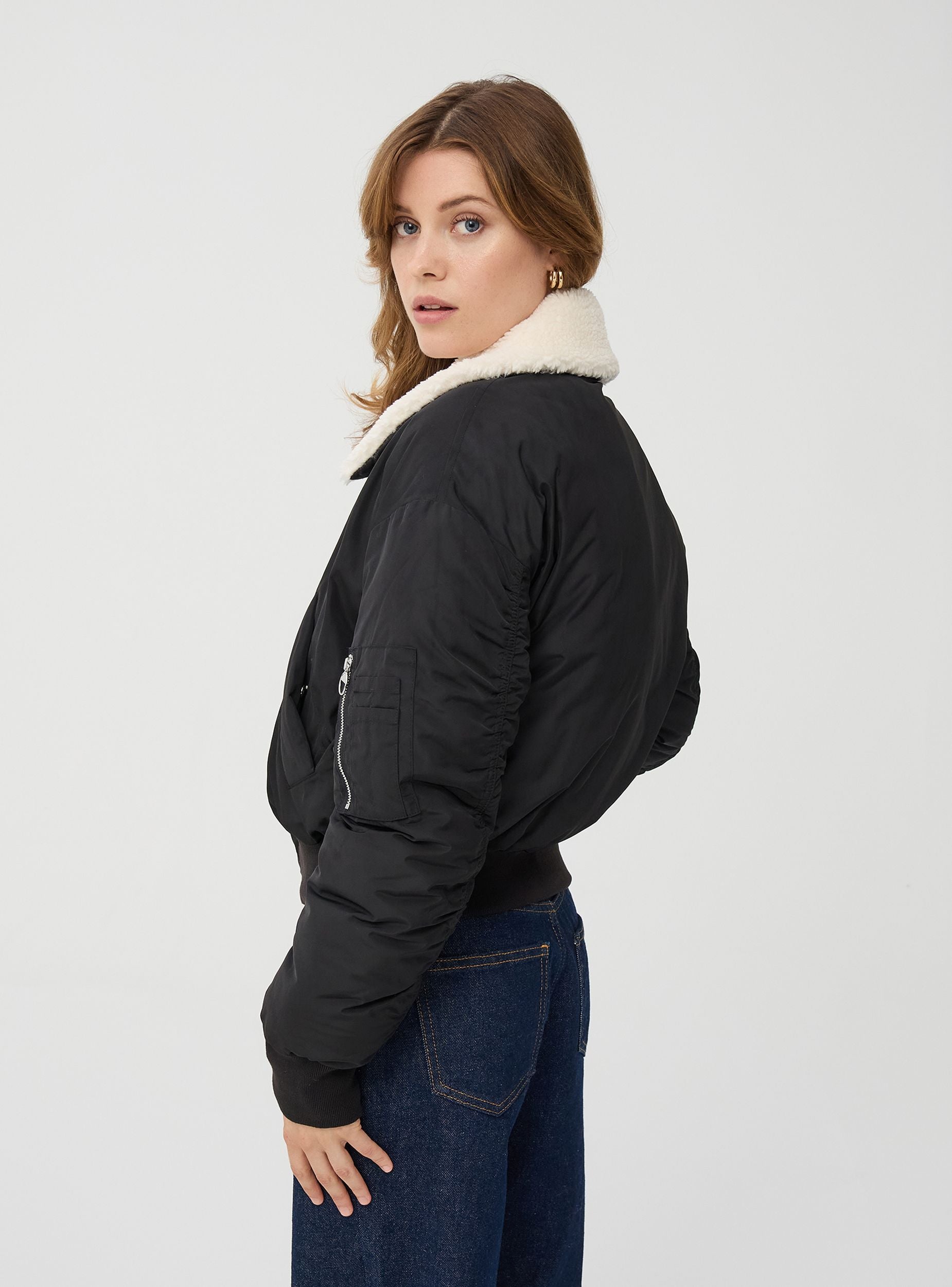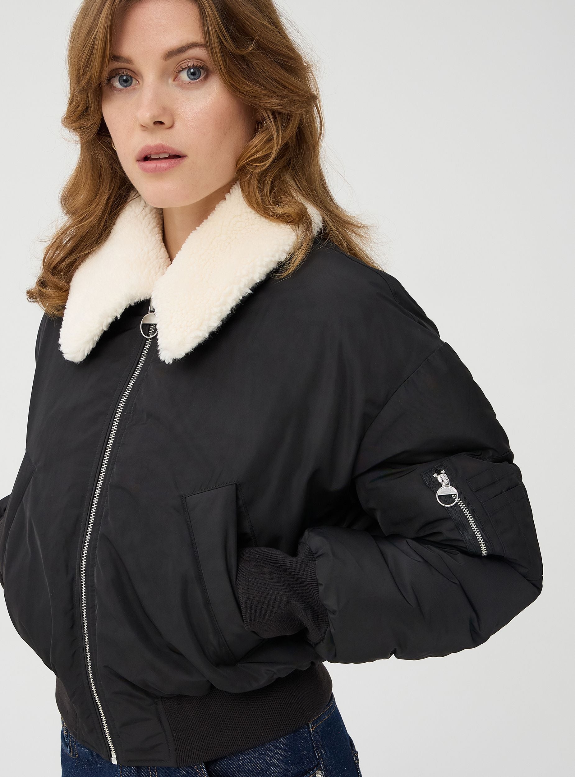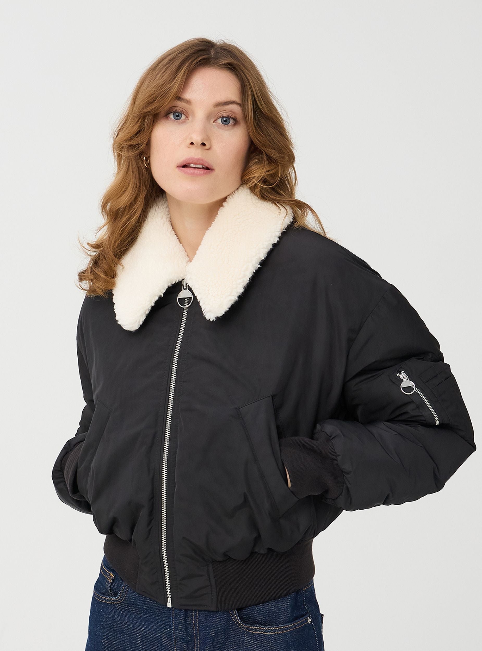 Ženski avijatičarski jakna sa uklonjivim kragnom od efektnog krzna. Ima prednje zatvaranje sa rajsferšlusom i dva bočna džepa. Rukavi su dugi sa rebrastim manžetama. Na leđima, jakna je jednostavna i linearna. Detalji uključuju džep sa rajsferšlusom na jednom rukavu. Unutrašnjost jakne je punjena kako bi se obezbedila toplota i udobnost.Detalji