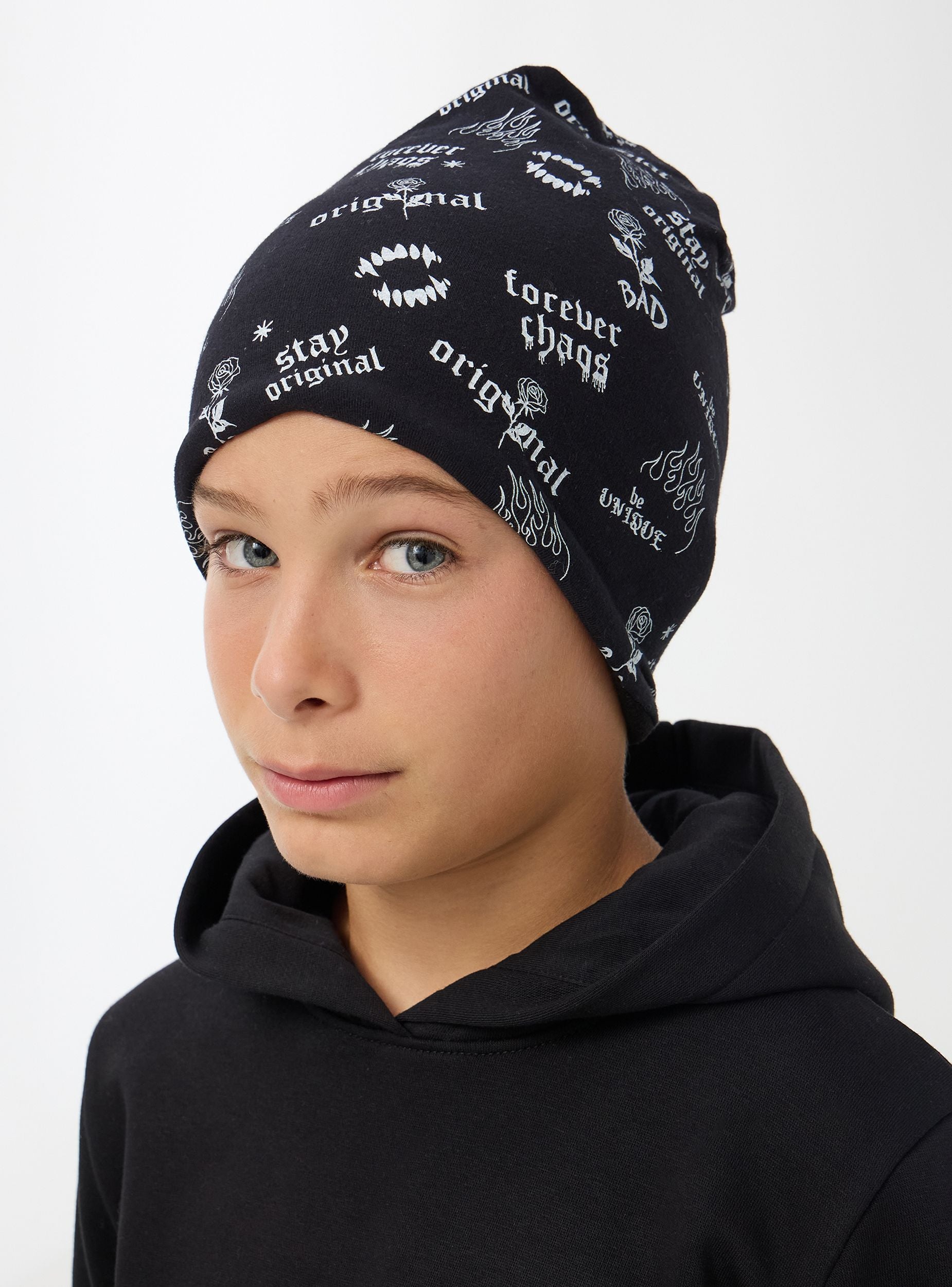 Kapa za decu s dvostrukim licem, jedna strana je jednostavna jednobojna, dok druga strana ima niz grafika u stilu grafita, uključujući natpise kao što su "stay original," "forever chaos," i "be unique" sa karakterističnim elementima kao što su plamenovi, ruže i vampirski zubi, čineći je trendi i ležernim dodatkom. Napravljena od mekog materijala, pruža udobno pristajanje koje je pogodno za ležerne i streetwear kombinacije.Detalji