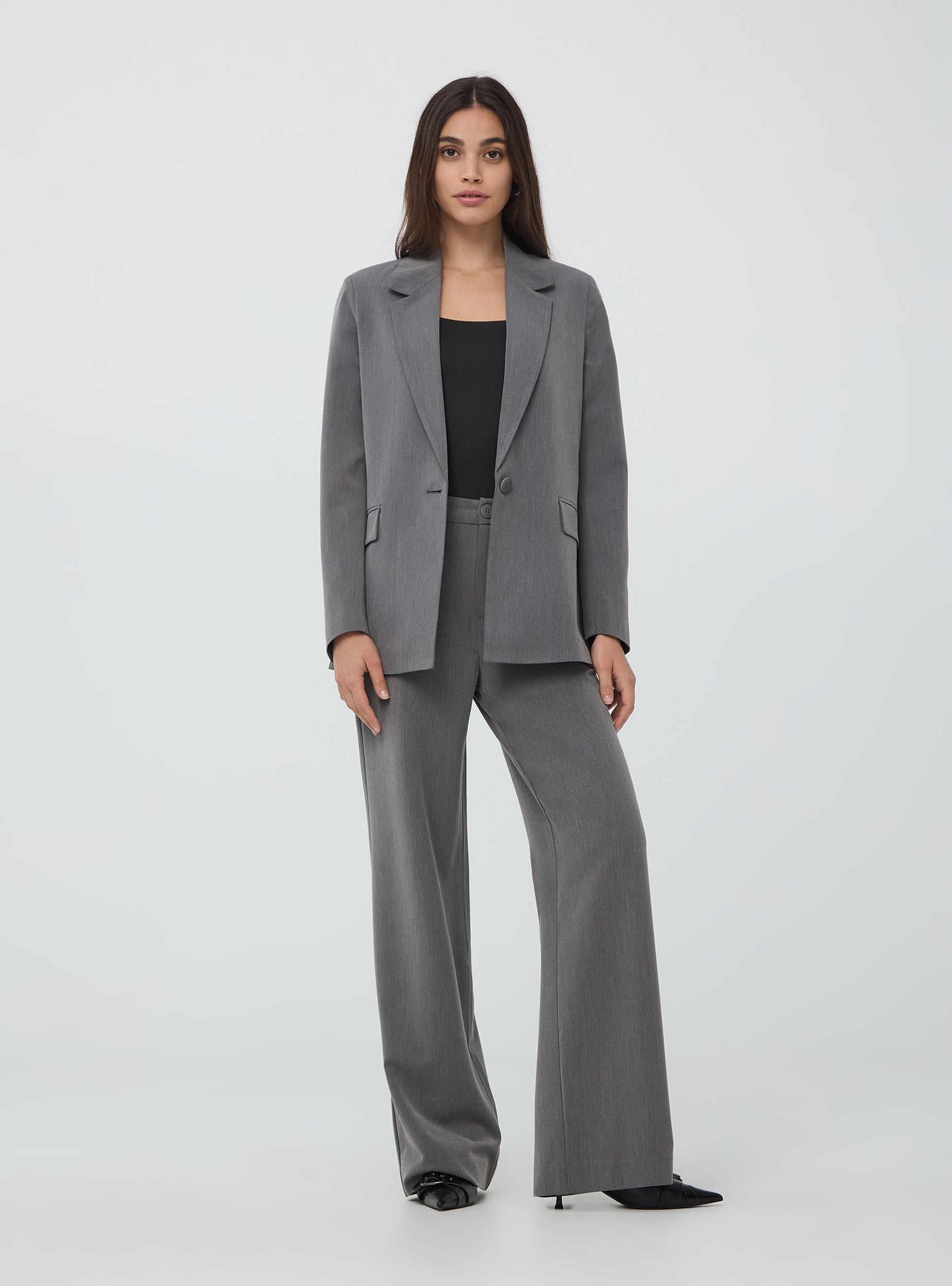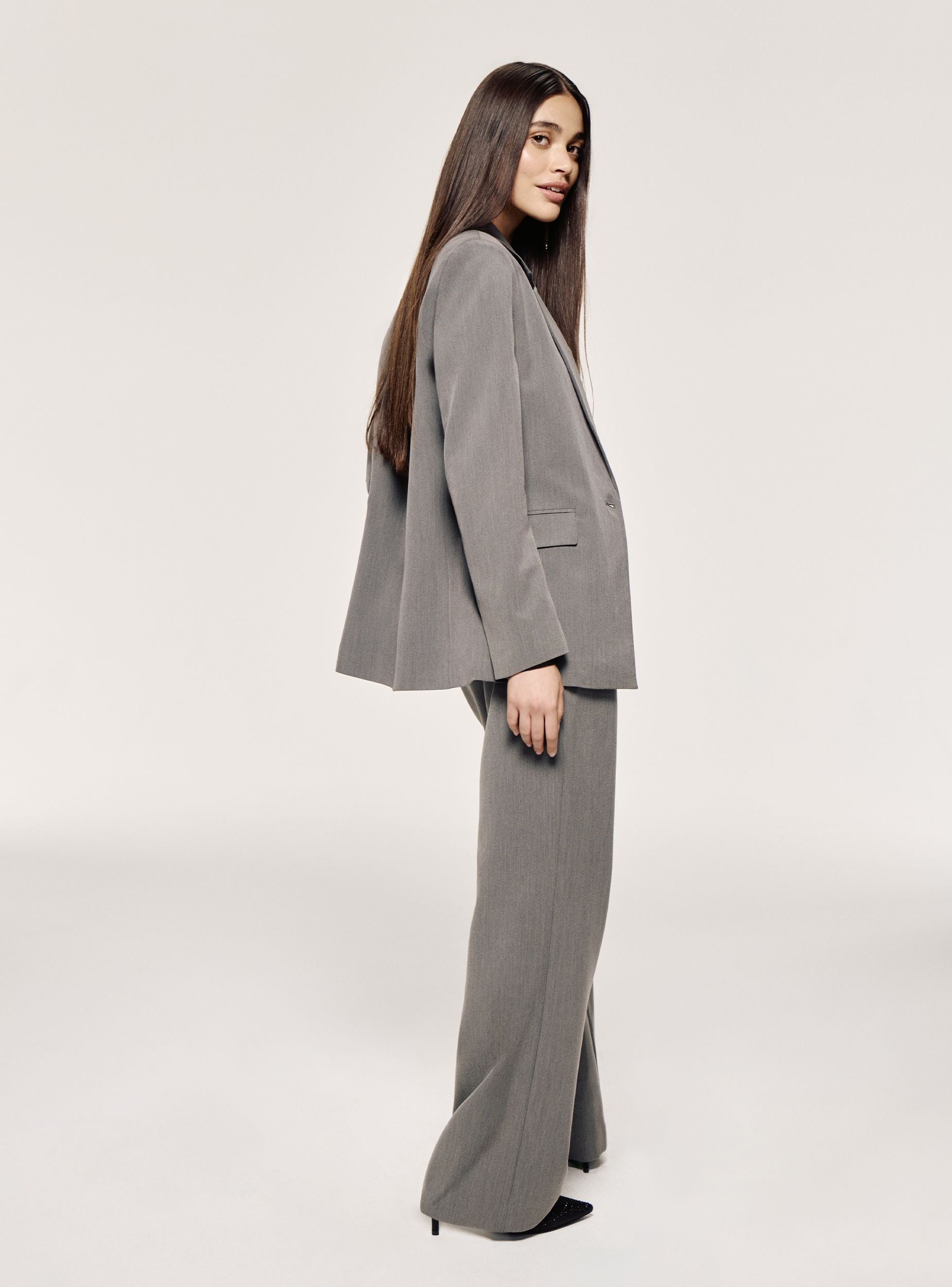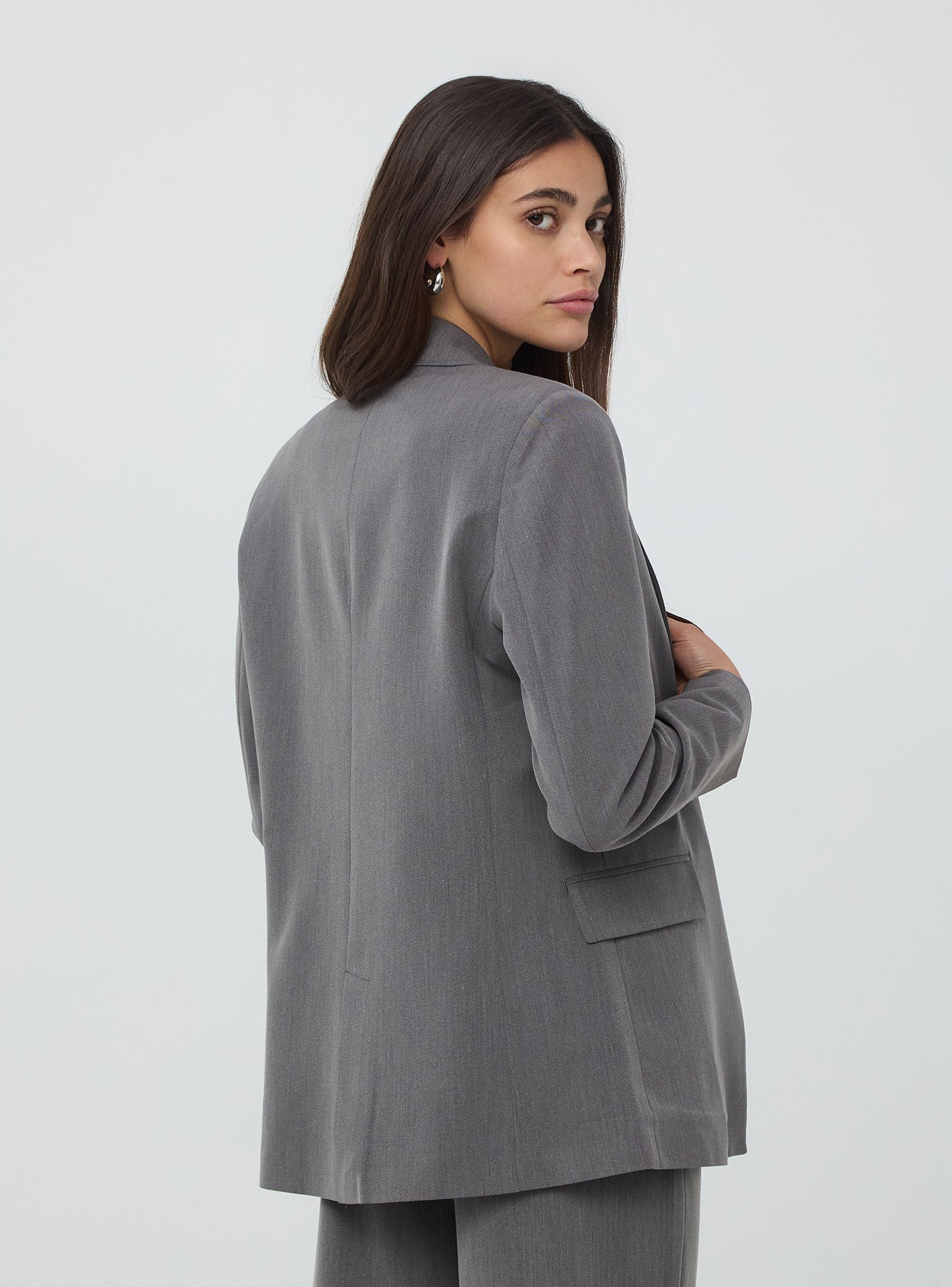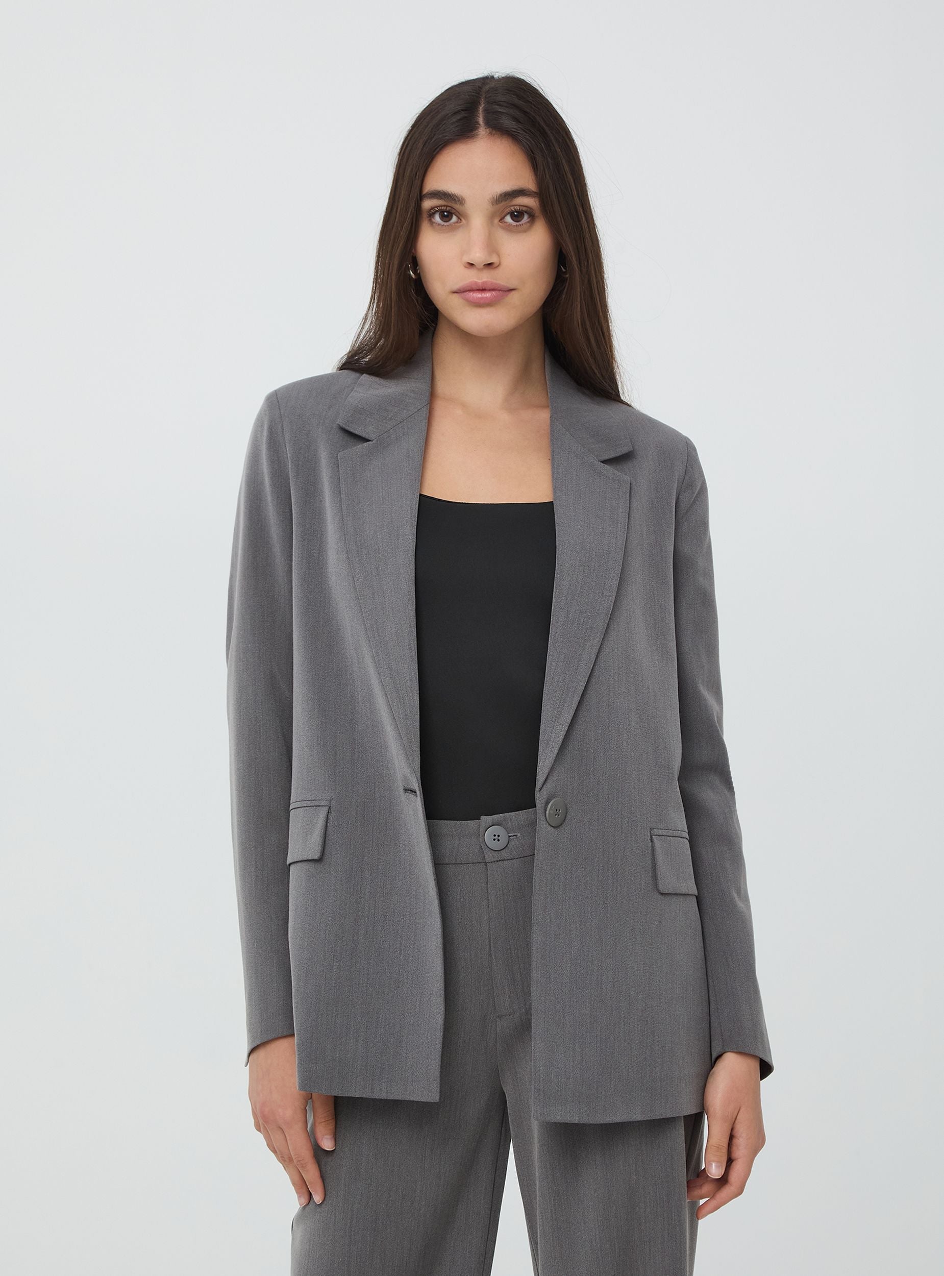 Ženska jakna od jednobojnog materijala, sa unutrašnjom podstavom, model sa jednim dugmetom i prorezom pozadi. Ovratnik sa reverom, džep sa preklopom, duge rukave sa prorezom. Širok kroj.Detalji
