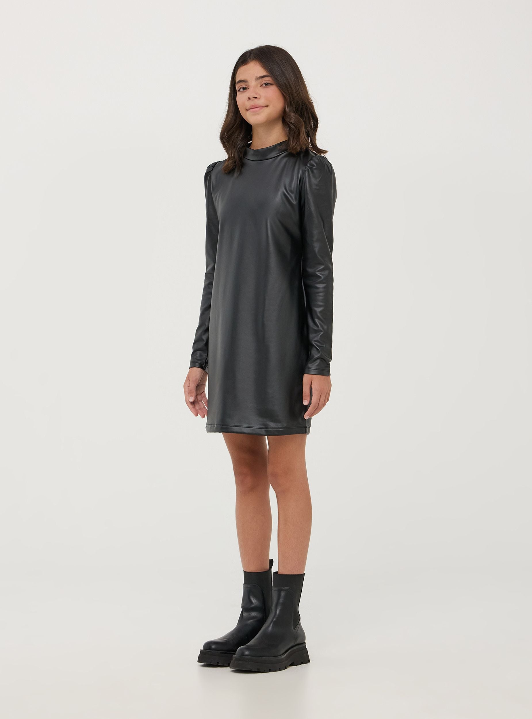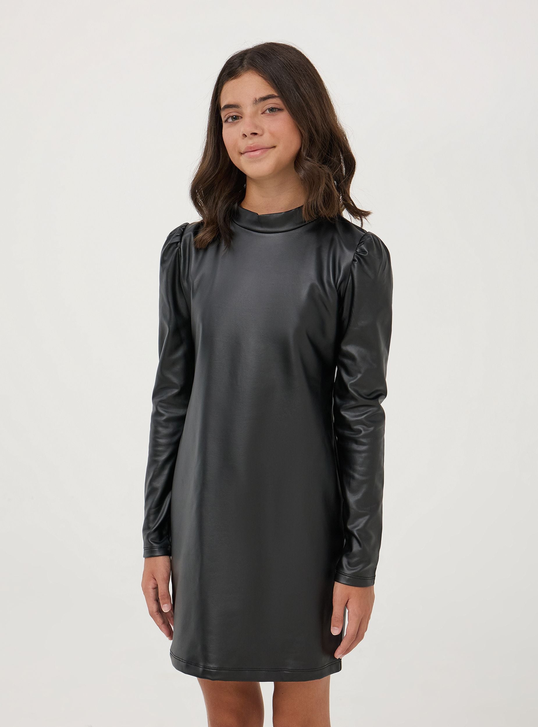 Haljina za devojčice u obliku tubina od veštačke kože sa dugim rukavima i blago nabranim ramenima. Ima uski dizajn. Visoki ovratnik dodaje sofisticiran i moderan dodir, čineći ovu haljinu svestranom i modernom.Detalji